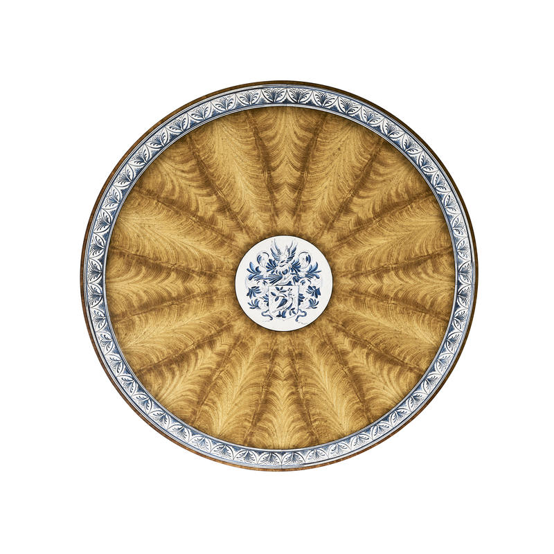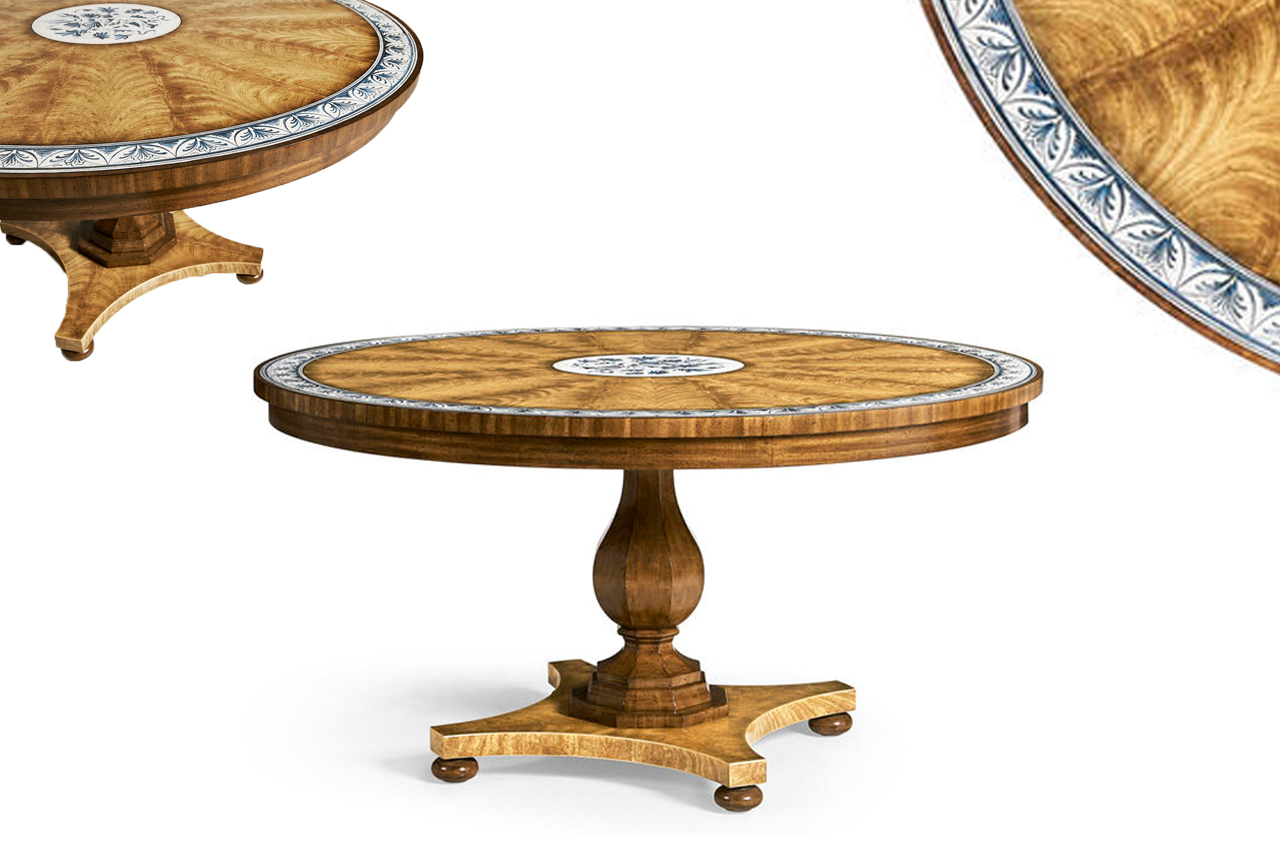 58-inch Round Dining Table with Blonde Radial-Cut Crotch Mahogany Tabletop. The Tabletop is bordered with a flowing blue hand-painted floral scene and a circular painted center. This is a special SHOW price table; only one is available at this price. The table is called the “Vermeer Round Pedestal Table” and was made by Jonathan Charles Furniture. Measurements: 58″ Round x 30″ High