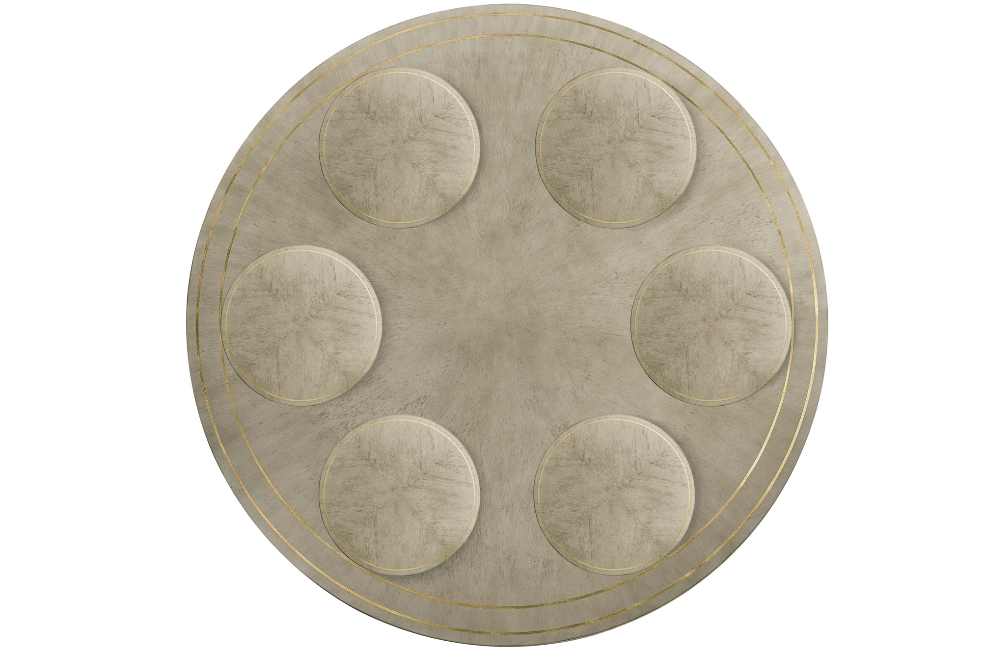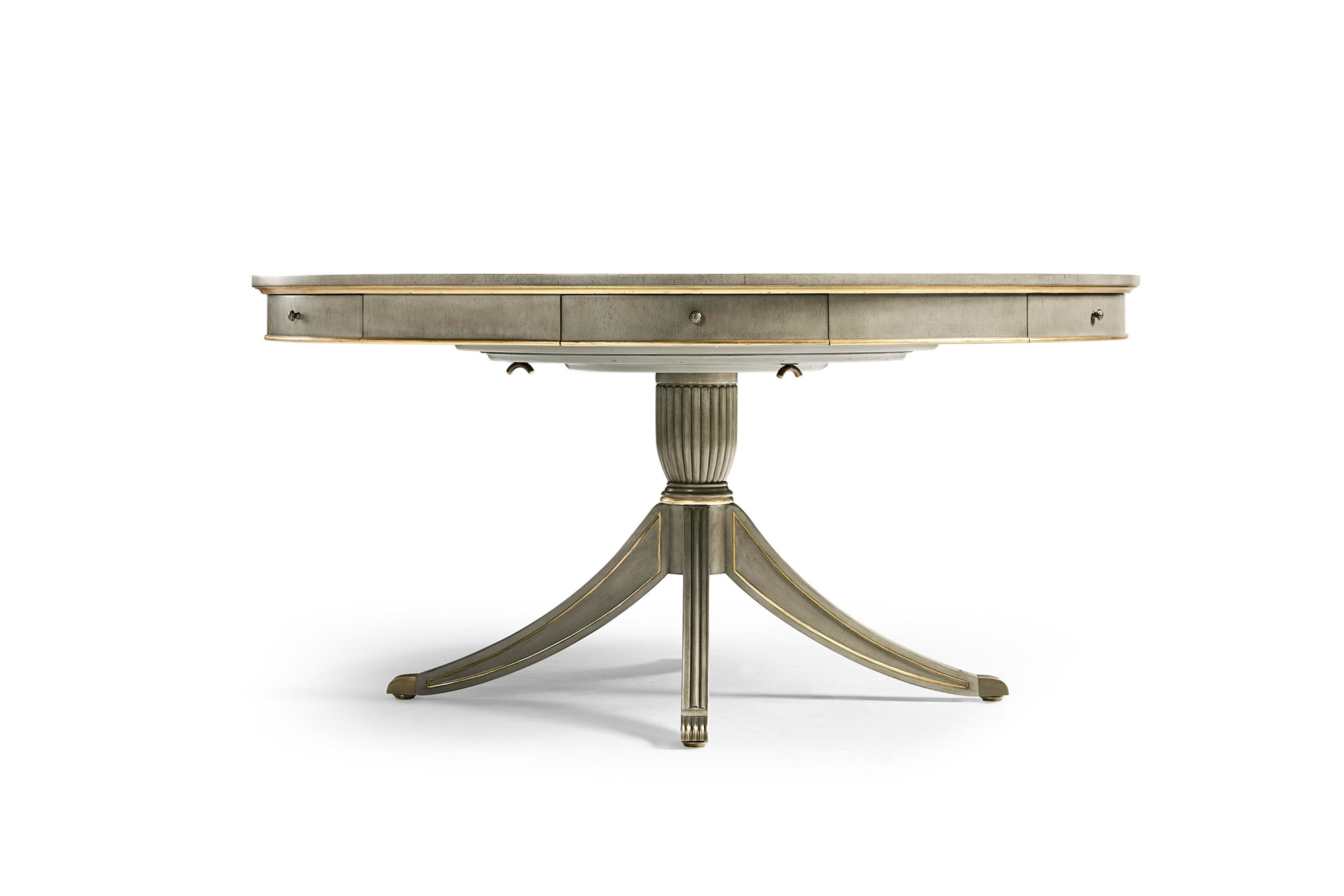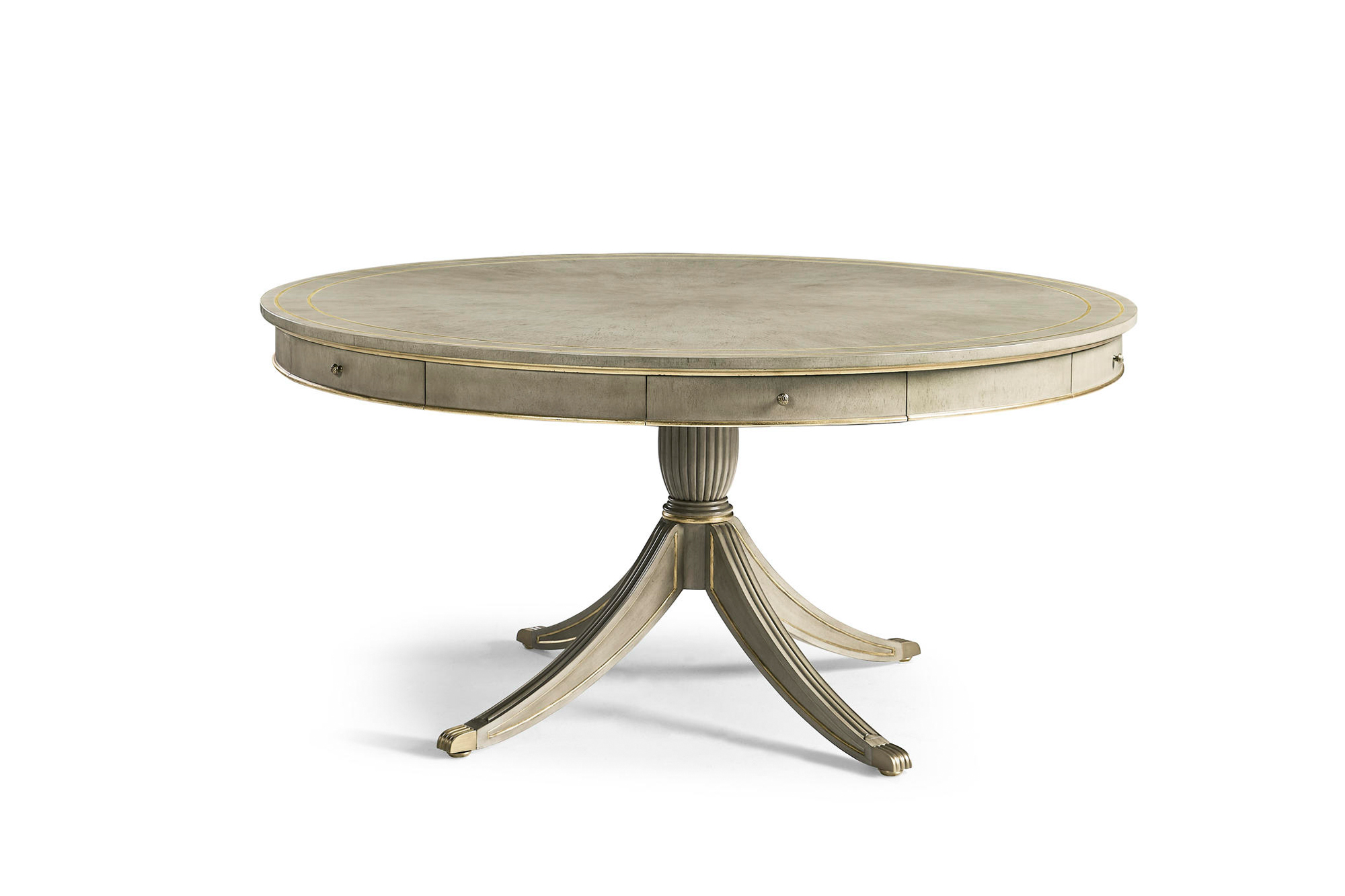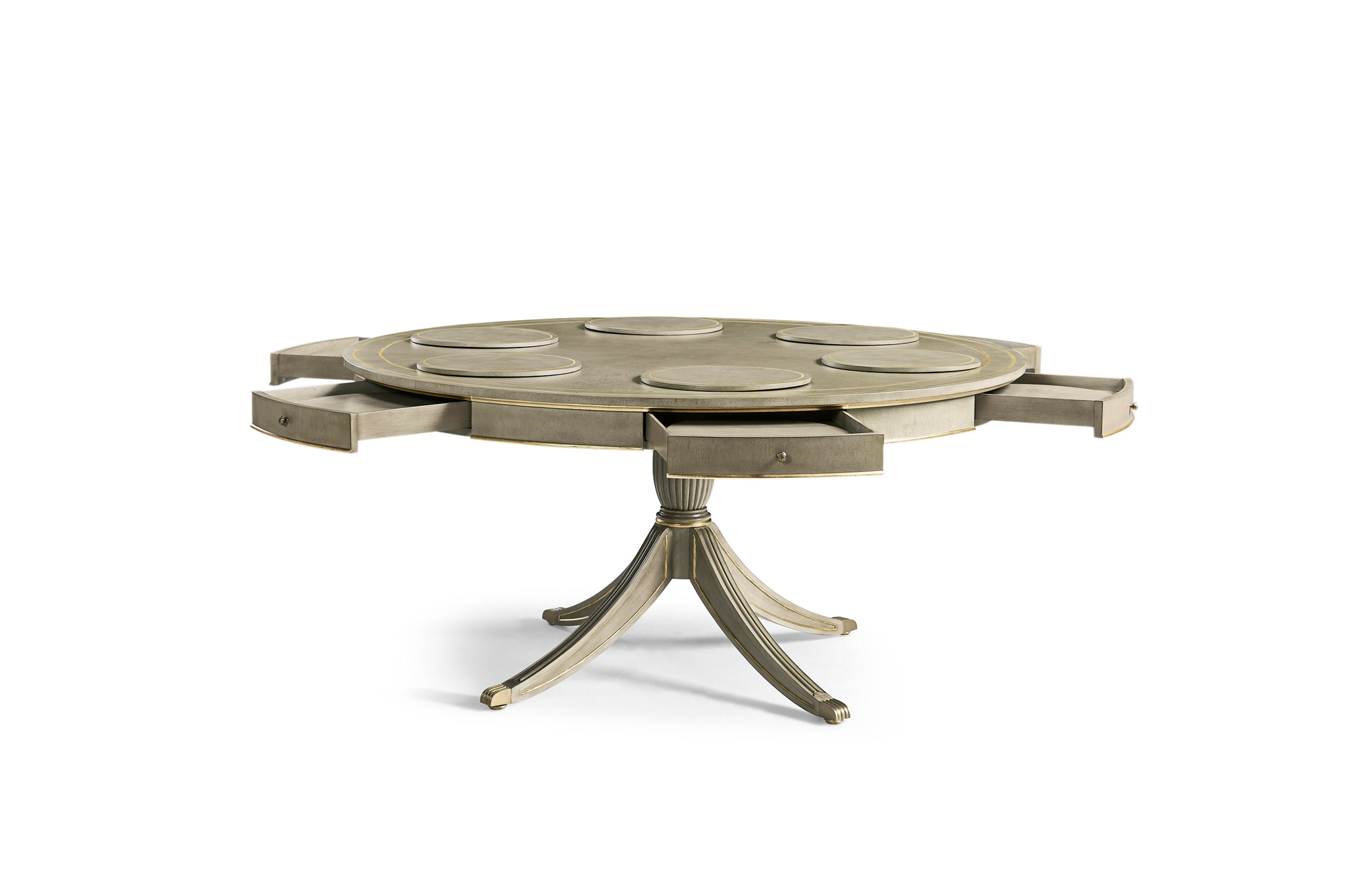 62-Inch Round Dining Table In Grey Finish With Gold Leaf, Drawers And Brass Claw Feet