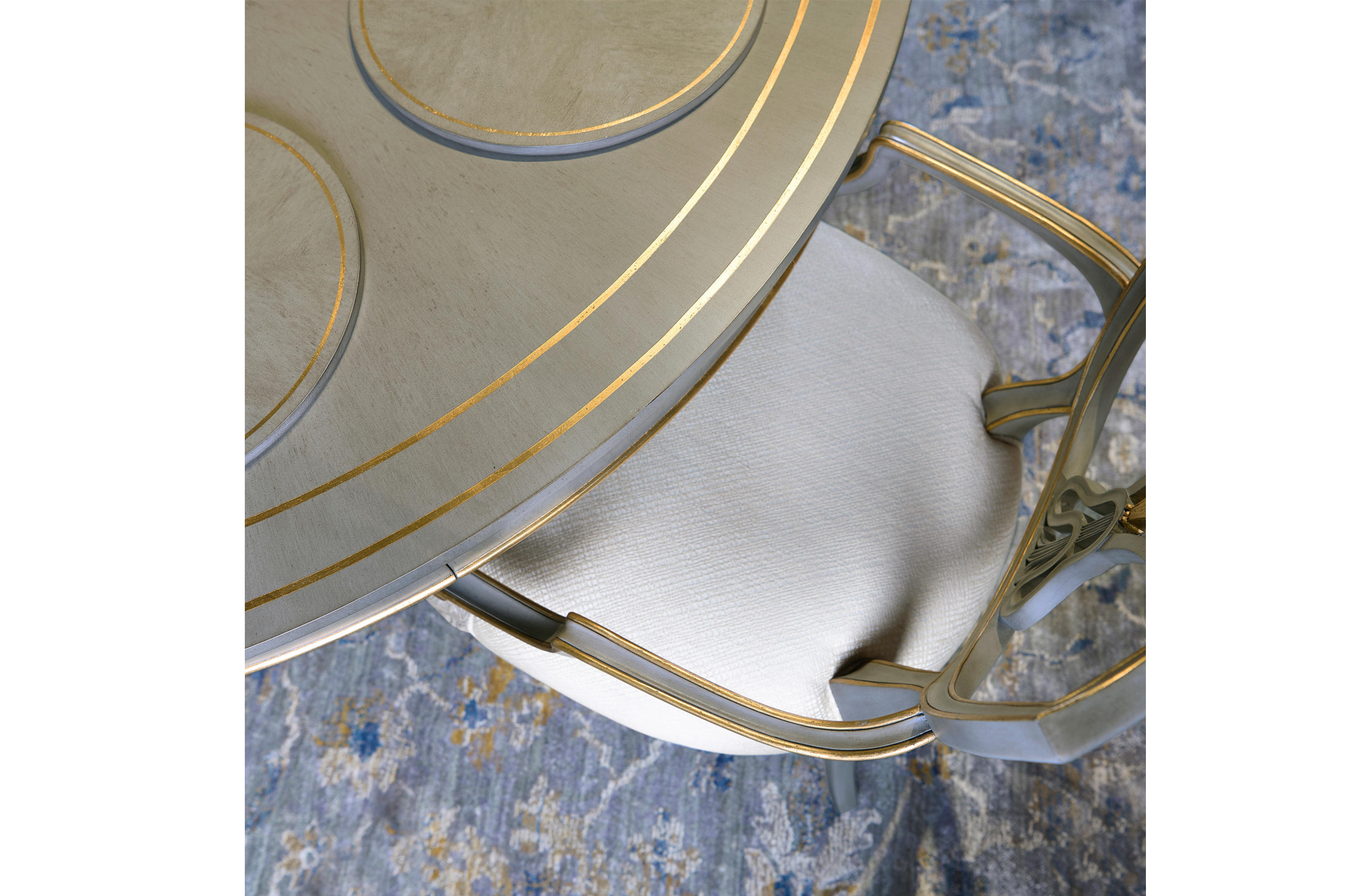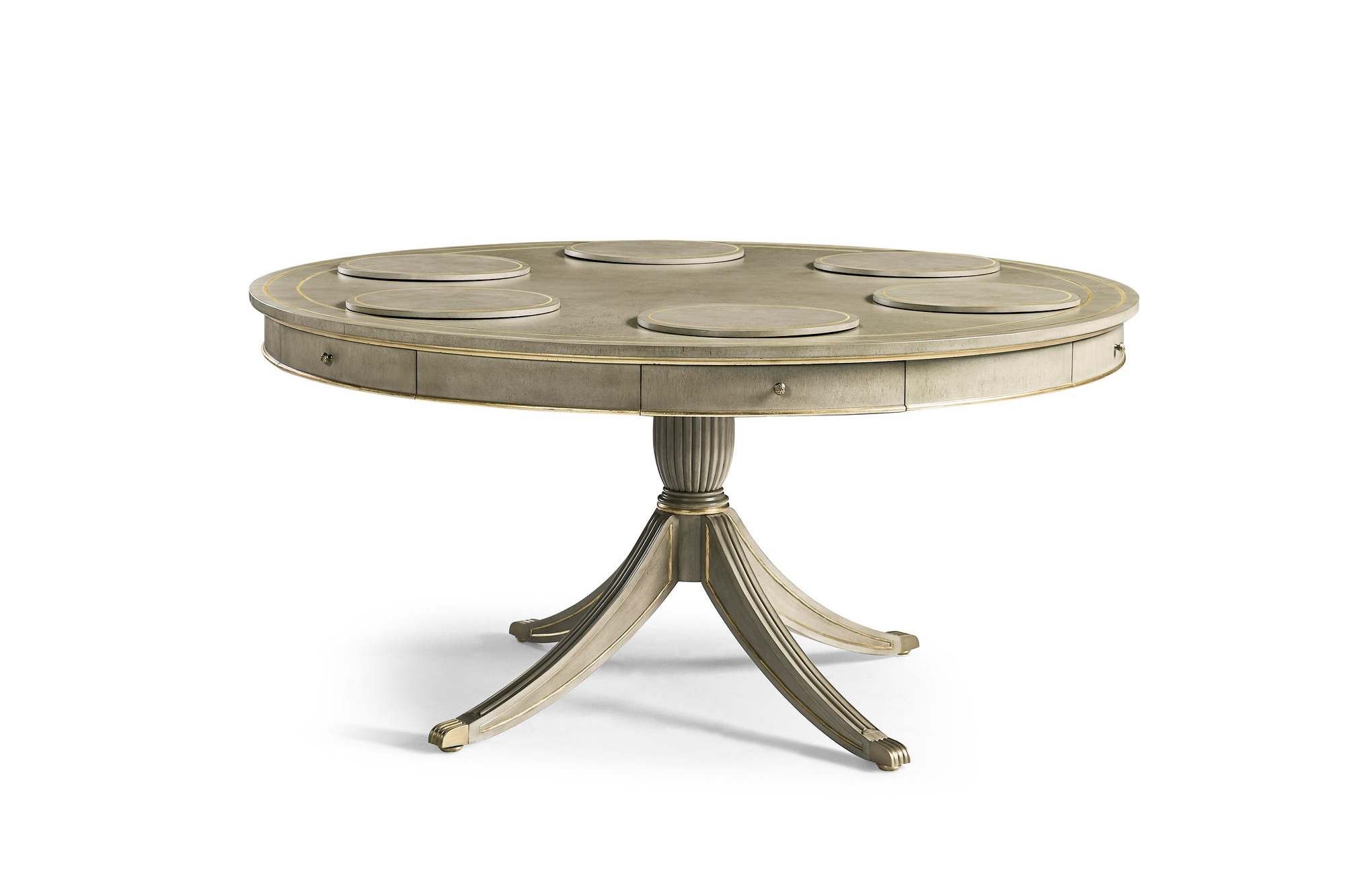 Home » Catalog » 62-Inch Round Dining Table In Grey Finish With Gold Leaf, Drawers And Brass Claw Feet