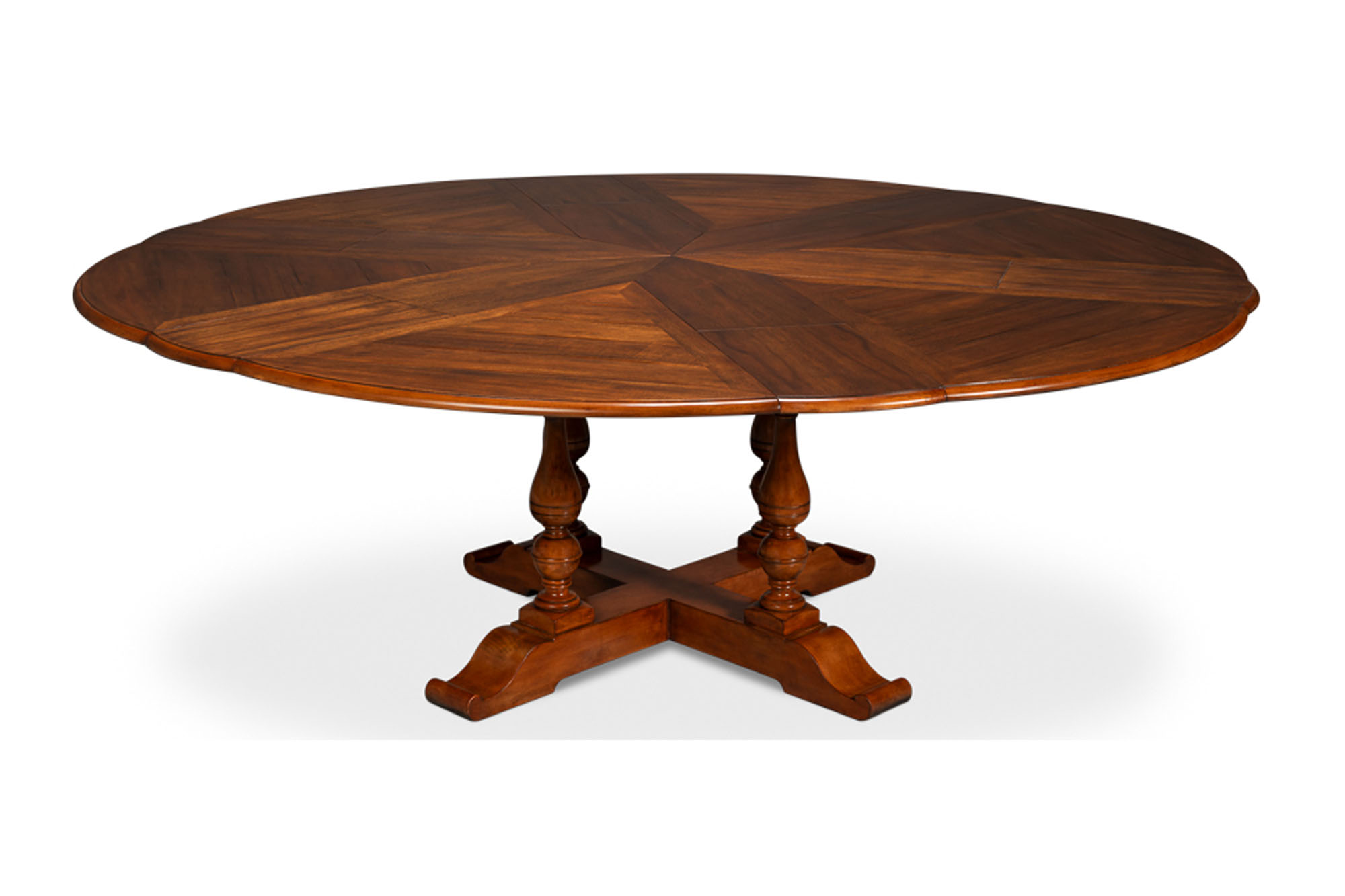 66-86 Round to round Country-style Jupe table. A walnut-planked Jupe table on country-turned legs. Lightly distressed walnut medium brown finish, an old-world finish. Measurements: 66″ Round to 86″ Round, 30″ High