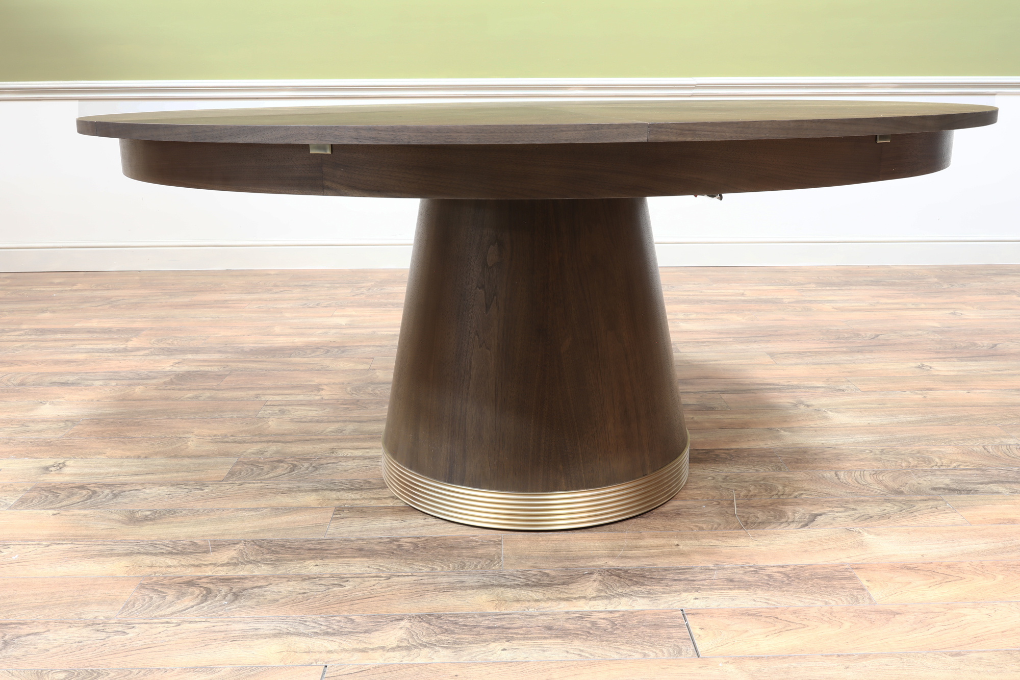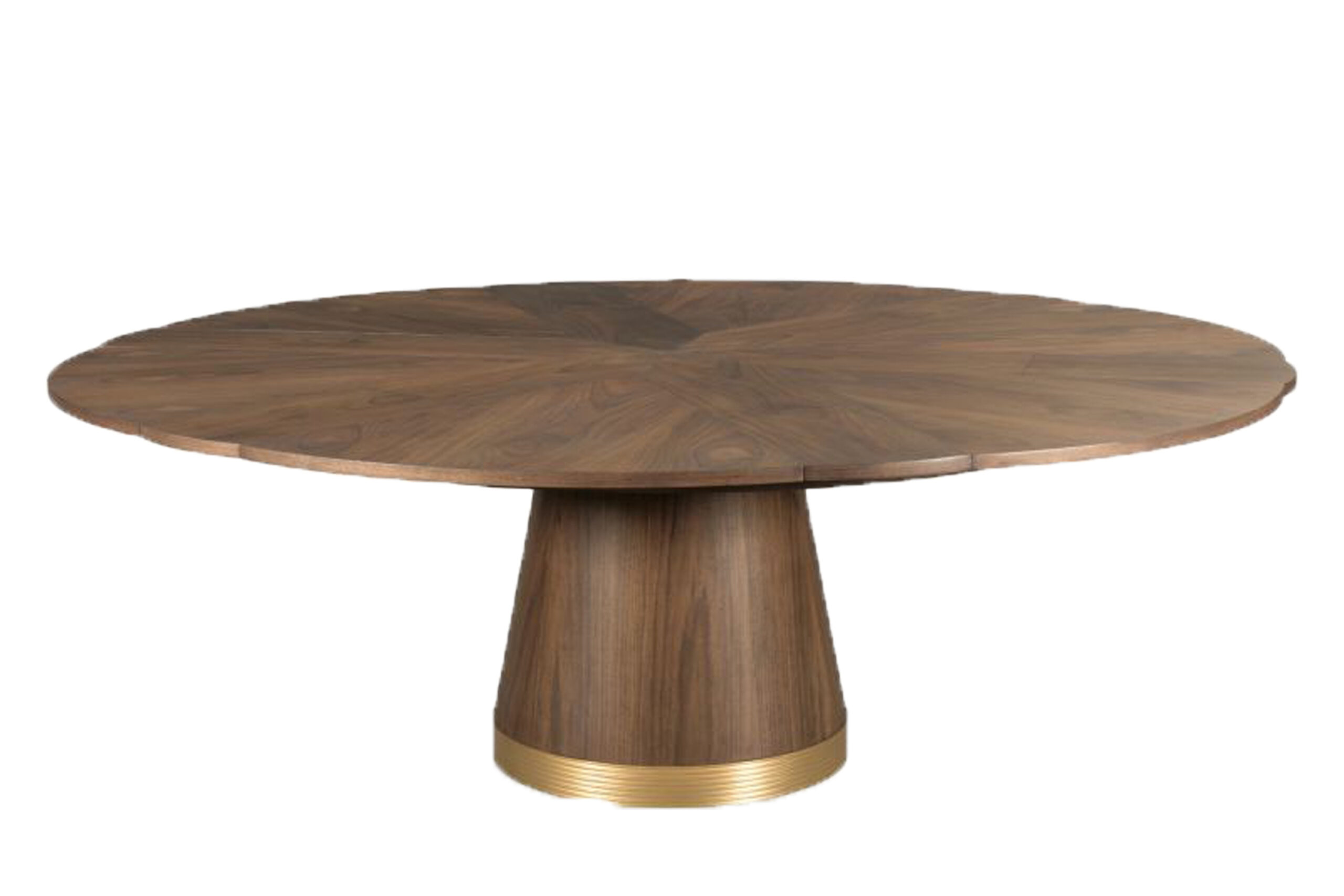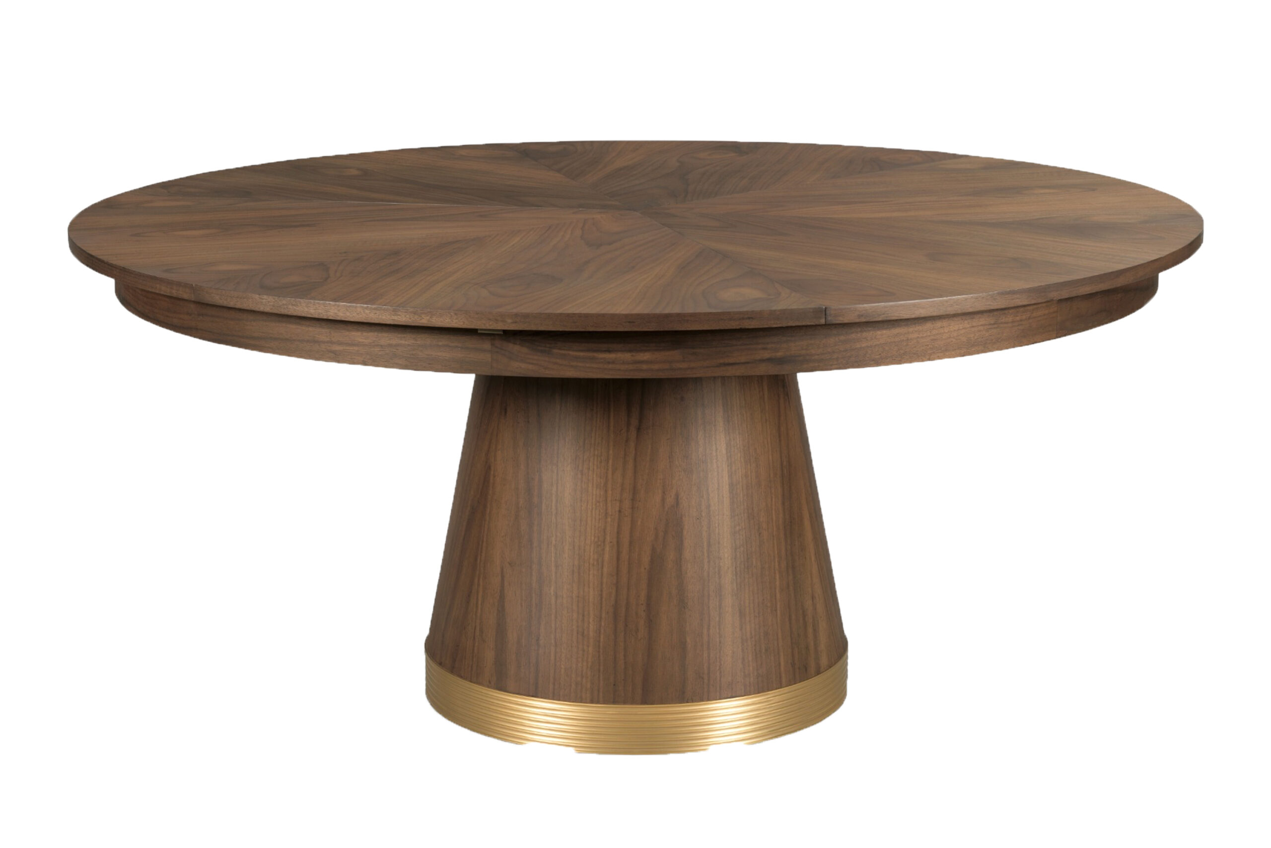 66″ to 86″ Modern walnut Jupe table with brushed brass accents on a central round tapering column. Variegated wood grain for a striking and bold presence in a contemporary room.
