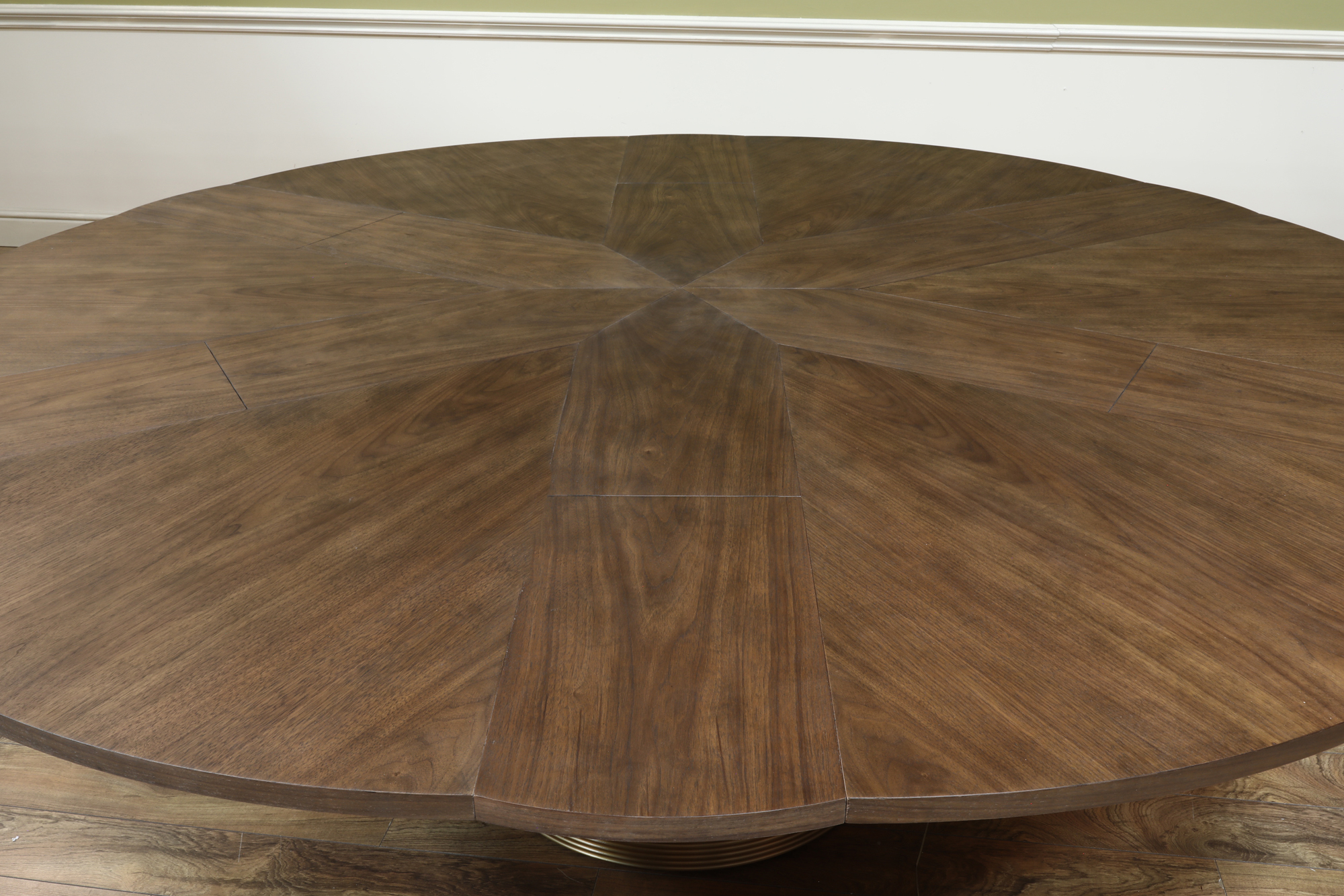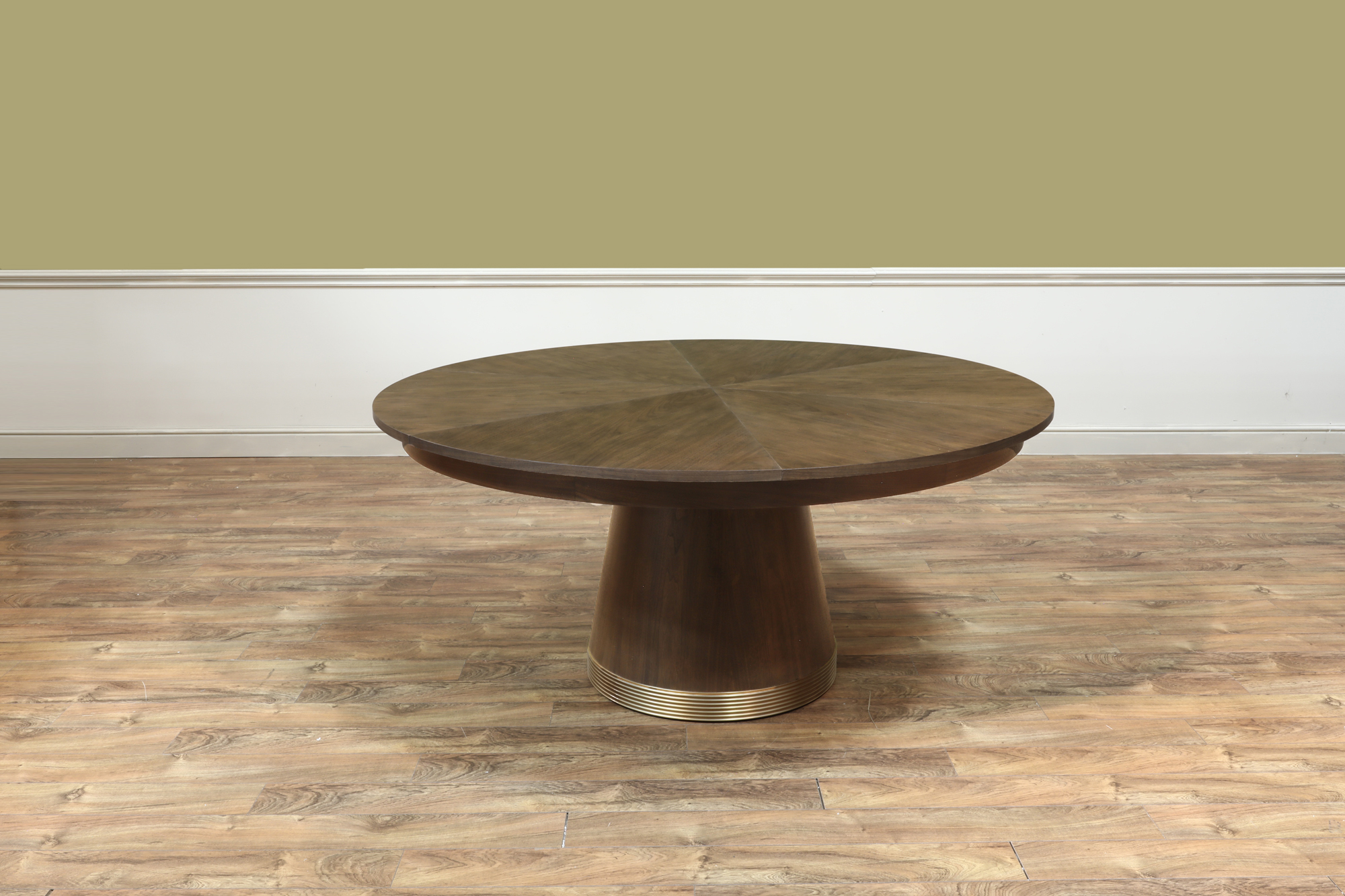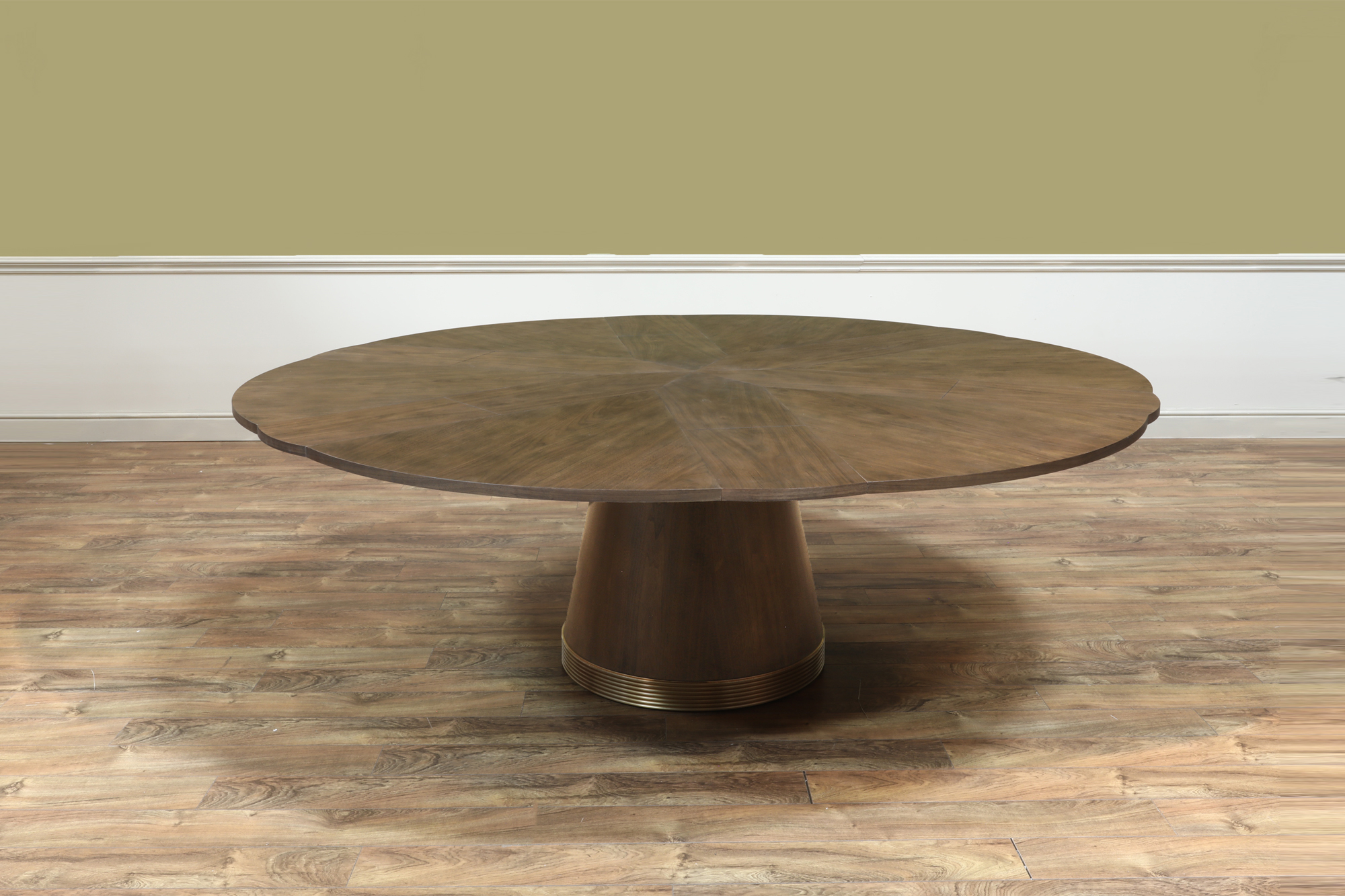 66″ to 86″ Modern walnut Jupe table with brushed brass accents on a central round tapering column. Variegated wood grain for a striking and bold presence in a contemporary room.
