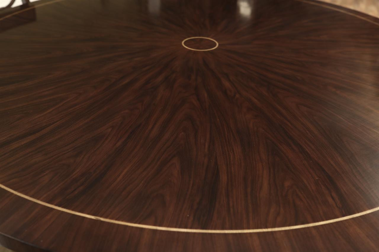 70-inch round walnut pedestal table on a large birdcage pedestal with capped feet. This table has minimalistic pinstriping around the border and a small medallion inlay at the center surrounded by radial-cut walnut. The table is about 2 inches thick, and it does not have an apron, making it suitable for a transitional dining room or a modern colonial home.