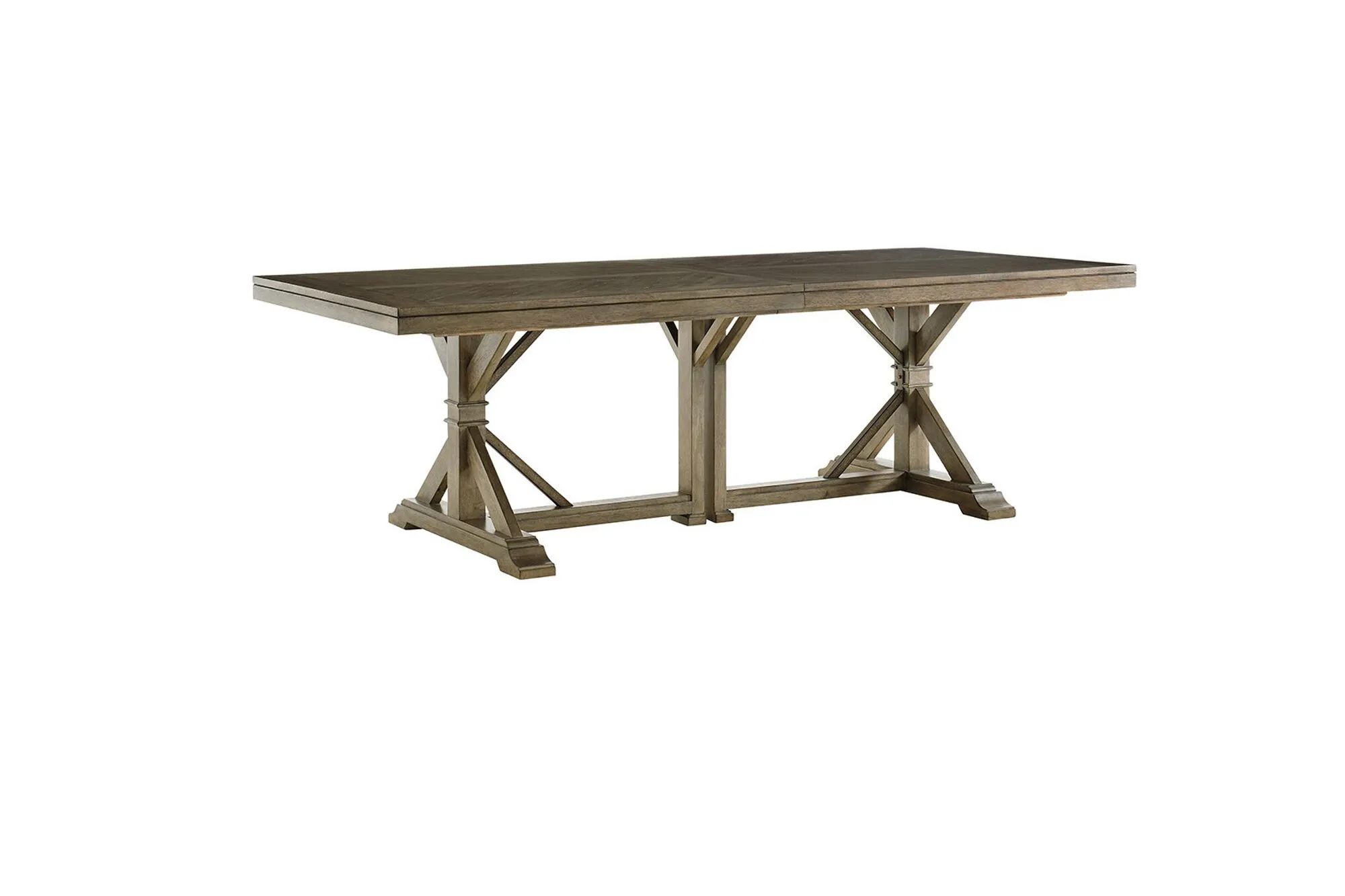 This rectangular dining table measures 8 to 12 feet in length and is constructed with a gray elm veneer top and a metal trestle base. The table extends using one or two 24-inch leaves, during which the textured metal trestle base separates to accommodate the extension. Without leaves installed, the tabletop features a four-way v-match gray elm veneer framed by straight-cut borders. Each extension leaf is finished with a bordered straight-cut veneer pattern and is supported by a metal glide system. The surface is finished with light scoring and wire brushing applied to the veneer. The table is designed to seat up to 10 people when extended and is intended for residential dining use.