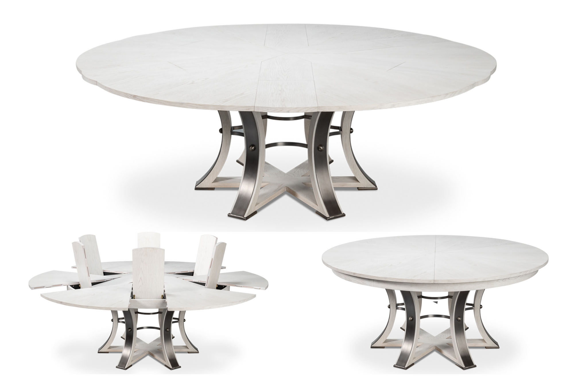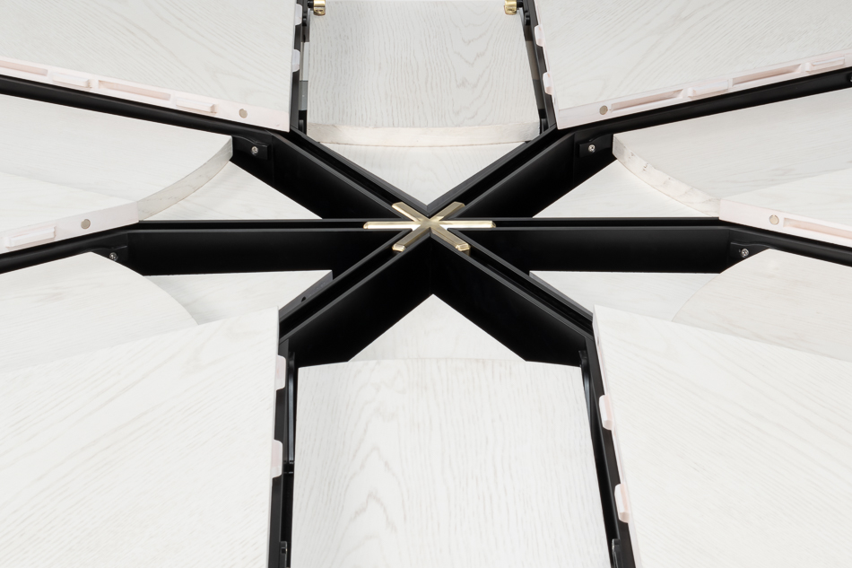 Modern white, large 66-inch round Jupe table opens to 86 inches round. A transitional pedestal base. Table seats 6 to 10 people. Measurements: 66″ Round to 86″ Round, 30″ High
