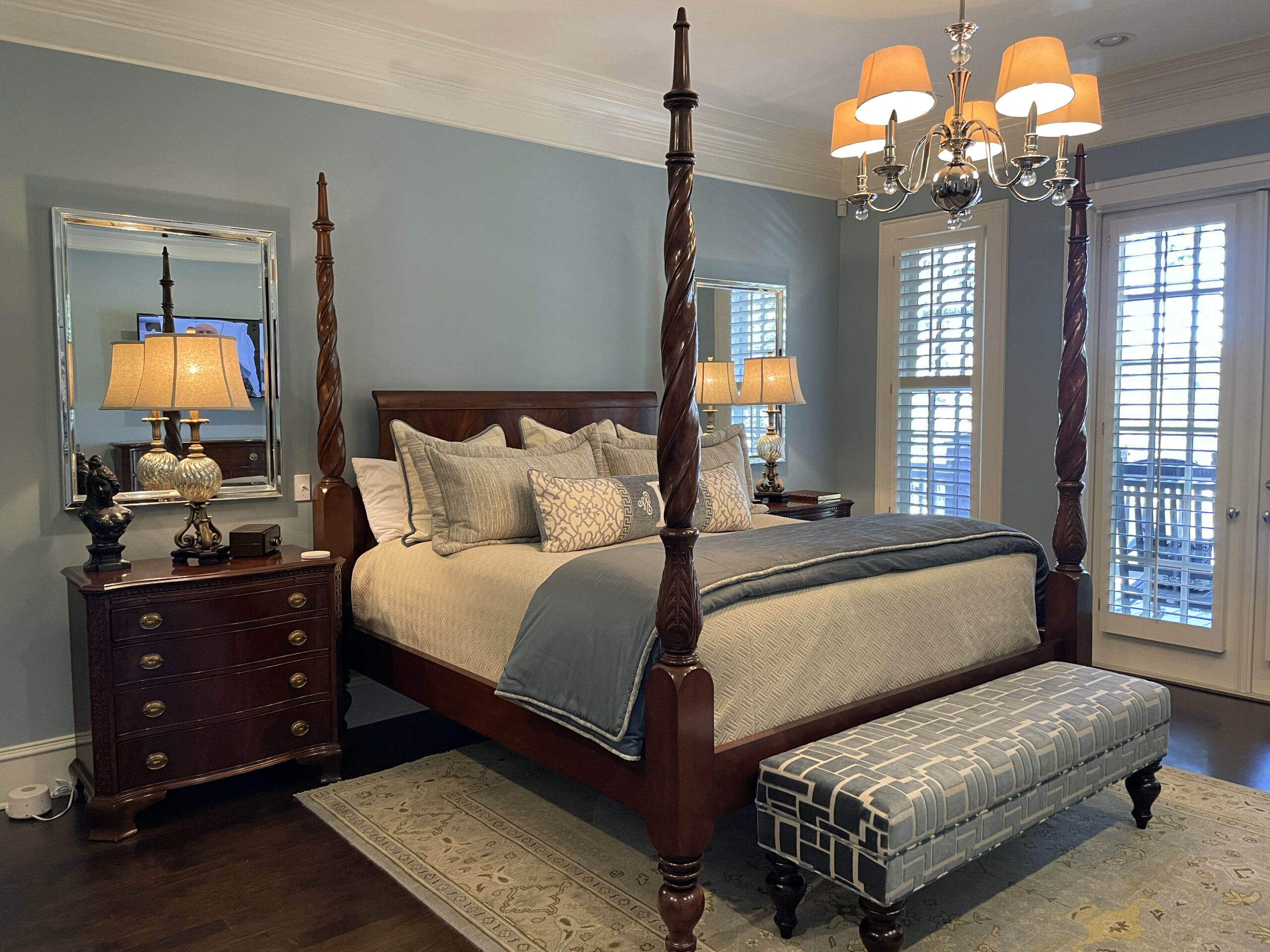 Traditional mahogany carved plantation poster bed. This bed has four hand-carved swirl posters and a swirl mahogany headboard. A scrolled headboard and turned feet.