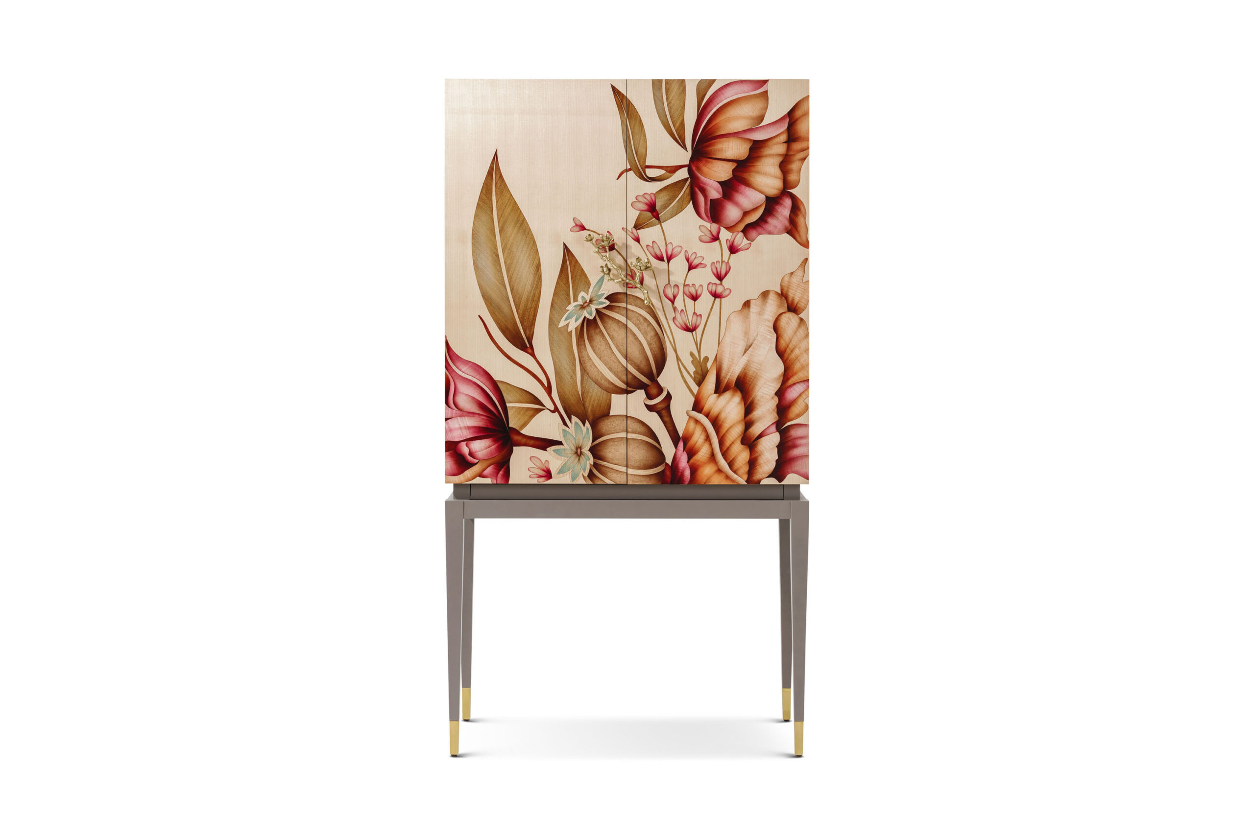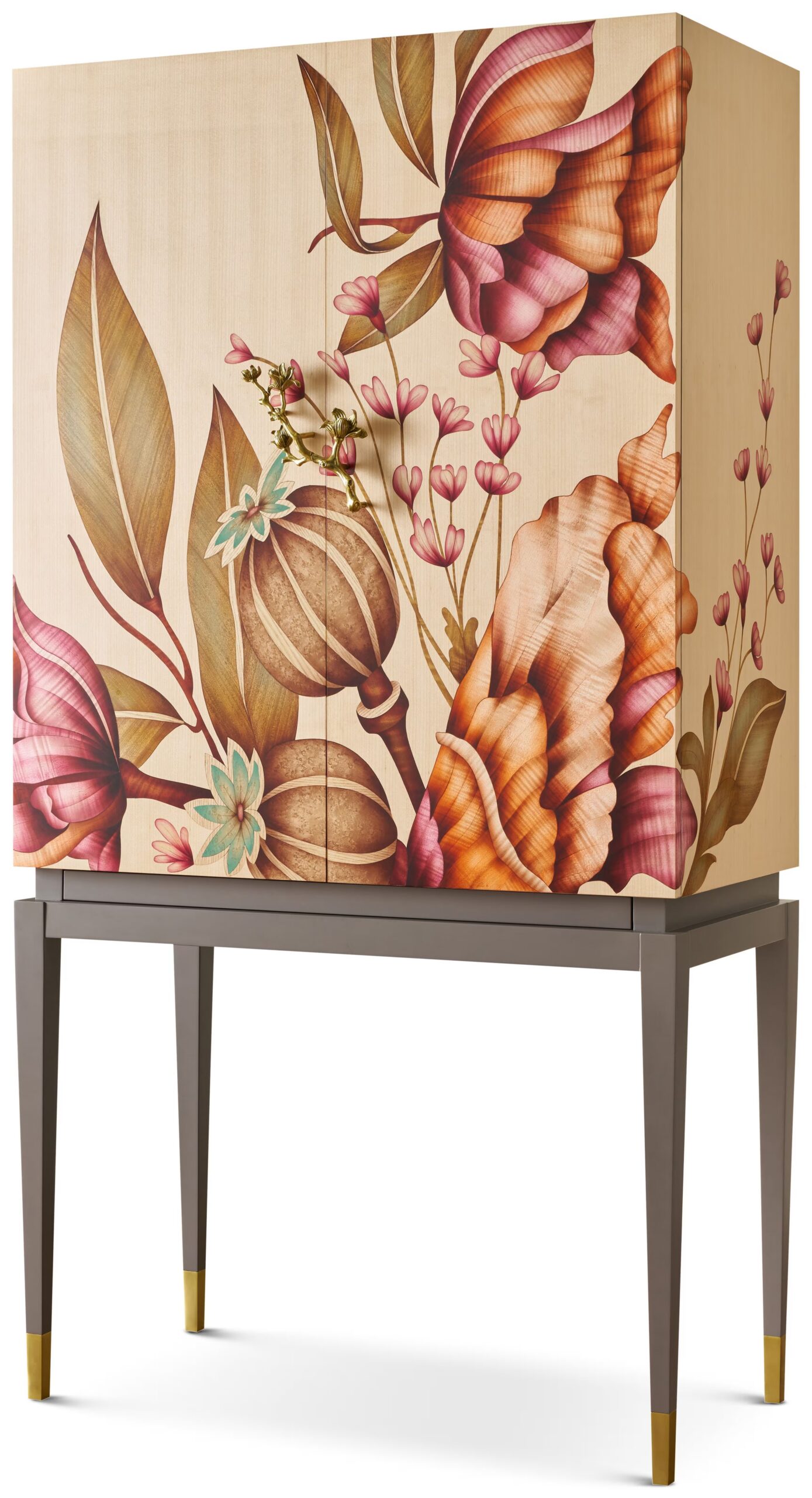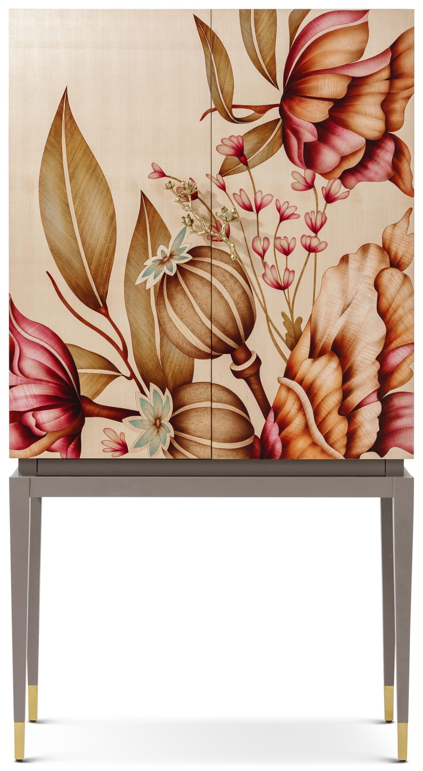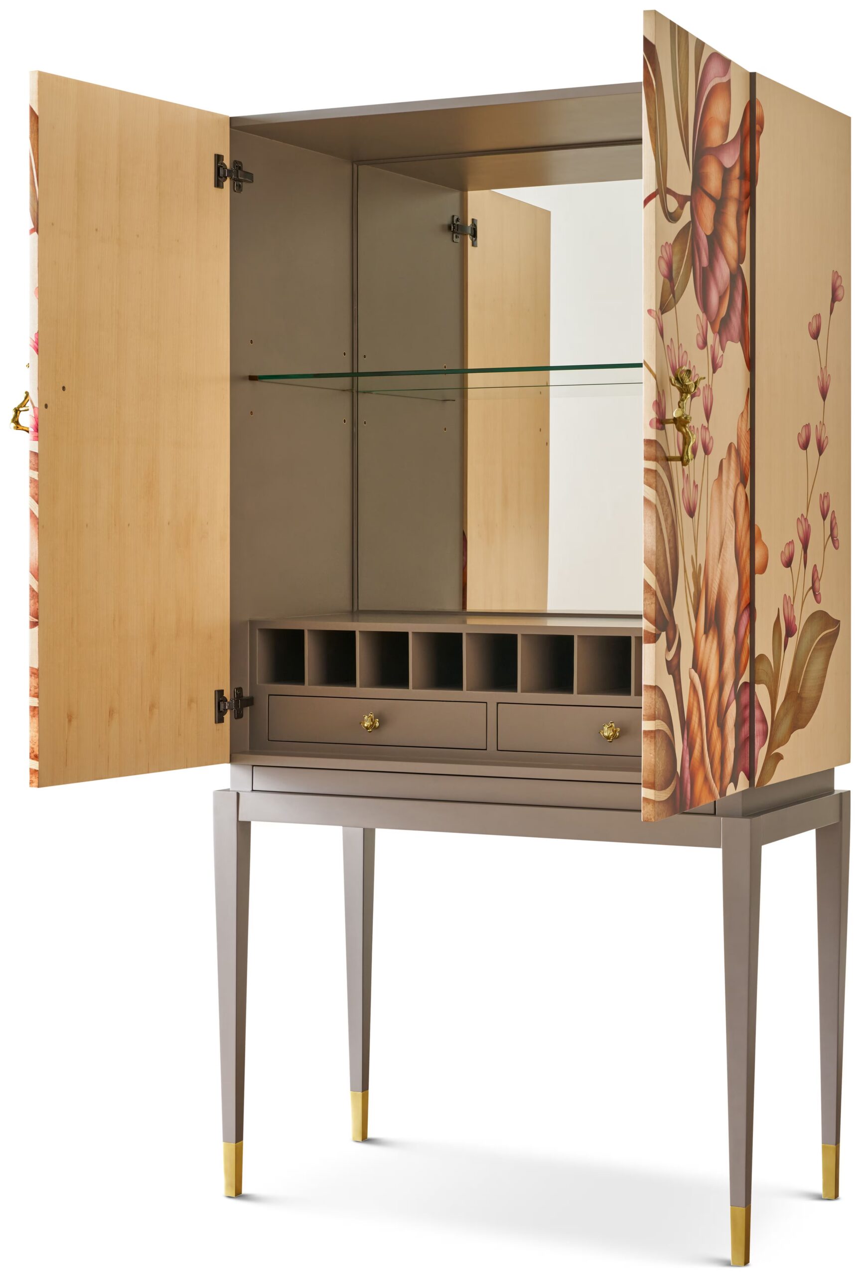 A bar cabinet constructed with veneer inlay doors, featuring a decorative arrangement across the door fronts that forms a structured patterned surface. The case presents a rectilinear profile, with the inlay work providing visual contrast against the surrounding frame. The interior is fitted with a mirrored glass back panel, enhancing light reflection within the storage compartment. The cabinet is supported on a base finished in bronze, creating a separation between the case and floor while introducing a contrasting material tone. The overall composition combines veneered surfaces, reflective interior detailing, and a metal-finished base within a unified storage form designed for bar use.