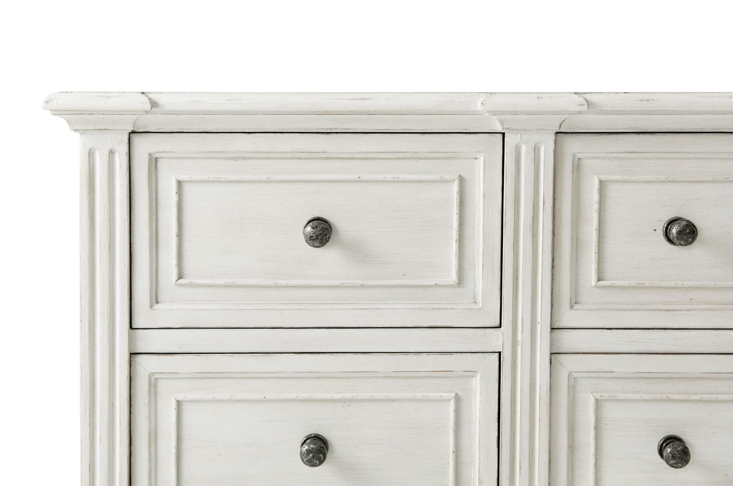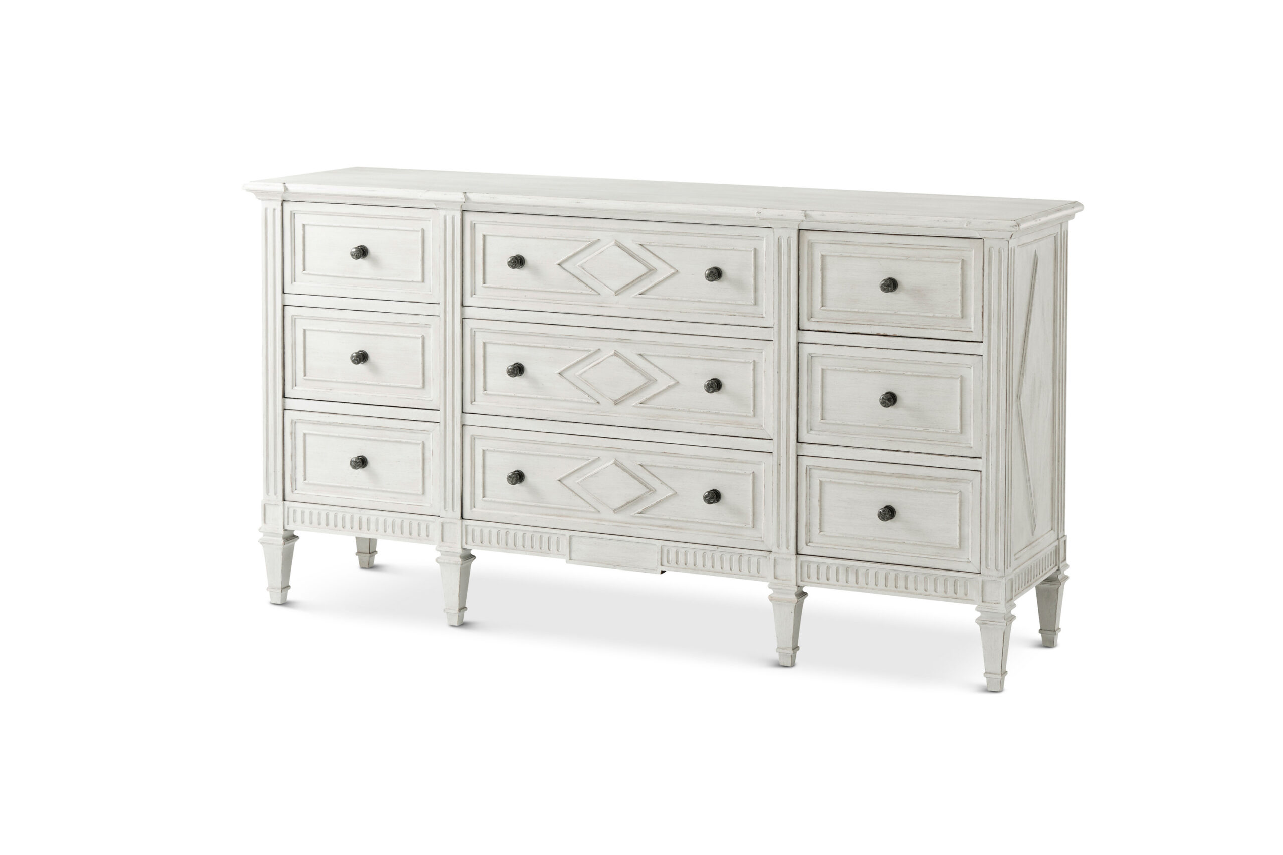 A dresser constructed in beech with veneered surfaces, featuring a molded edge rectangular top that defines the upper profile. The case is arranged with nine paneled drawers, each front detailed with lozenge motifs that introduce geometric surface variation. Antique pewter handles are applied across the drawers, providing consistent hardware alignment throughout the façade. The base incorporates fluted detailing, creating a transitional element between the case and the legs. The dresser is supported by square tapering legs, offering a stable, outward-tapered stance. The paneled drawer fronts and lozenge detailing contribute structured relief across the surface, while the molded edge top frames the overall form.