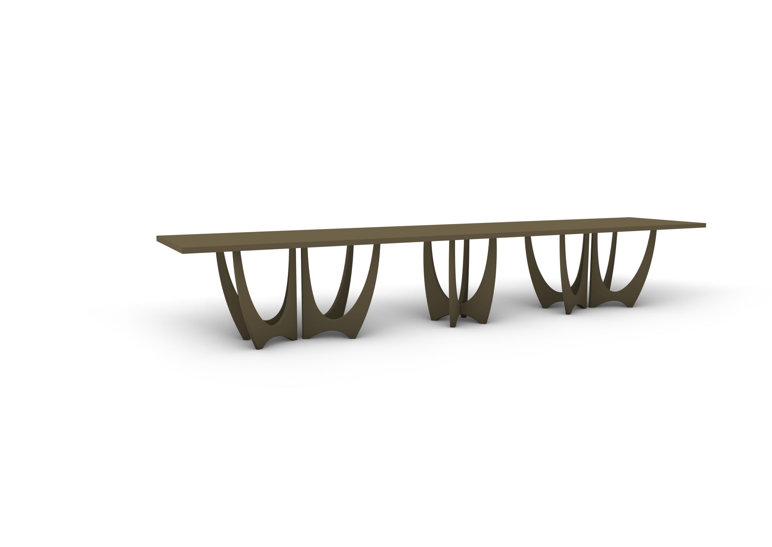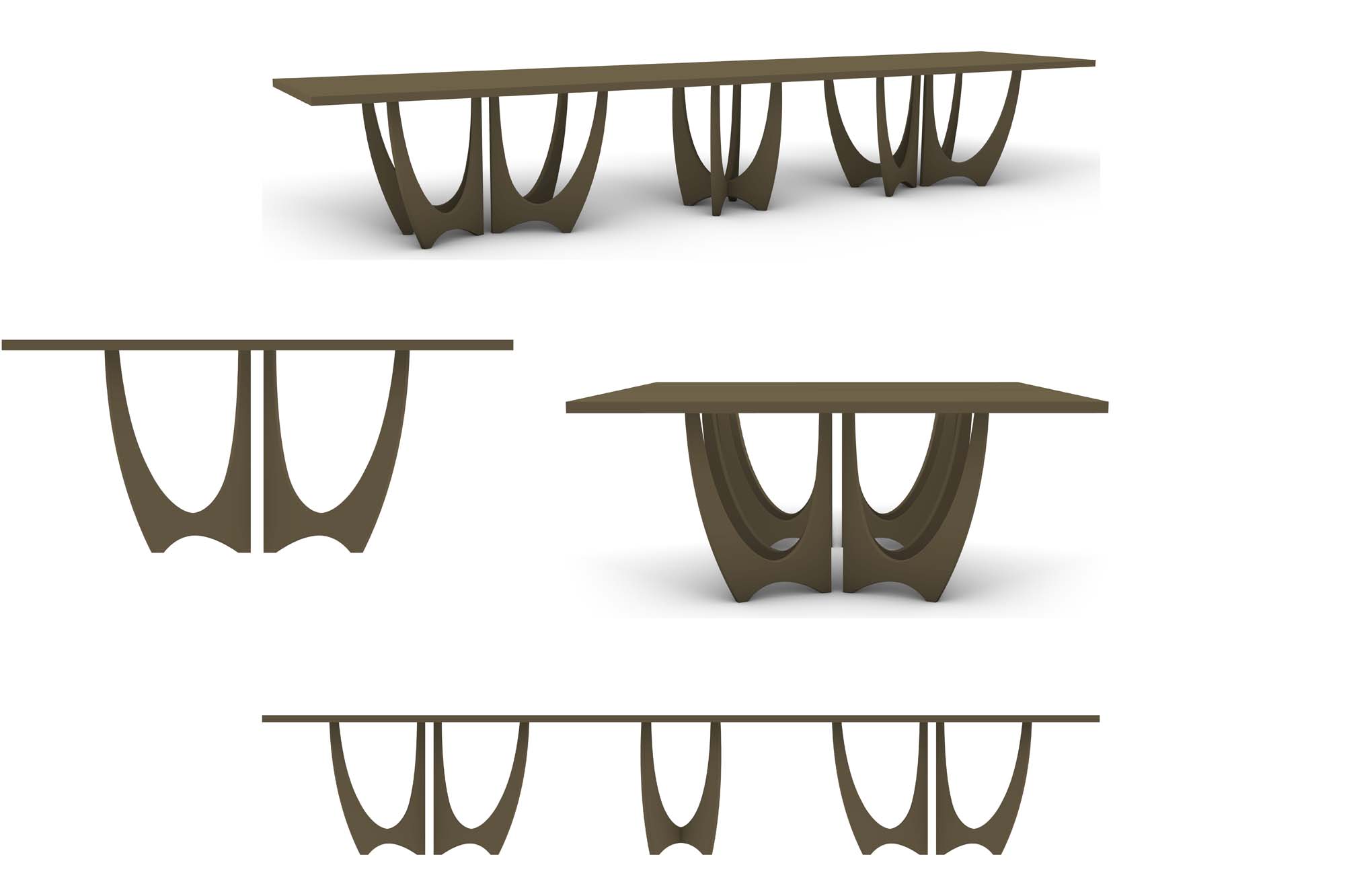 A modular dining table system composed of individual 36 x 36 inch square tables designed to function both independently and as a unified configuration. Each table features a sculptural, arched pedestal base with three-prong or four-prong support geometry, allowing multiple units to align into larger formats. The three-prong tables combine to form a 6-foot square arrangement, while the four-prong center unit integrates with the other tables to create an extended banquet configuration reaching 15 feet in length, seating approximately 18 people. Constructed in hardwood solid base and quality decrative Veneers atop. Table shown in a medium brown finish on black walnut very typical of mid-century period furniture. The bases highlight continuous curved cutouts and thickened structural profiles. The tops are square with straight edges, maintaining a clean, planar surface across joined sections. Table bases structurally come together with dowels and concealed compression hardware. Levelers are incorporated at the base to maintain stability across uneven surfaces.