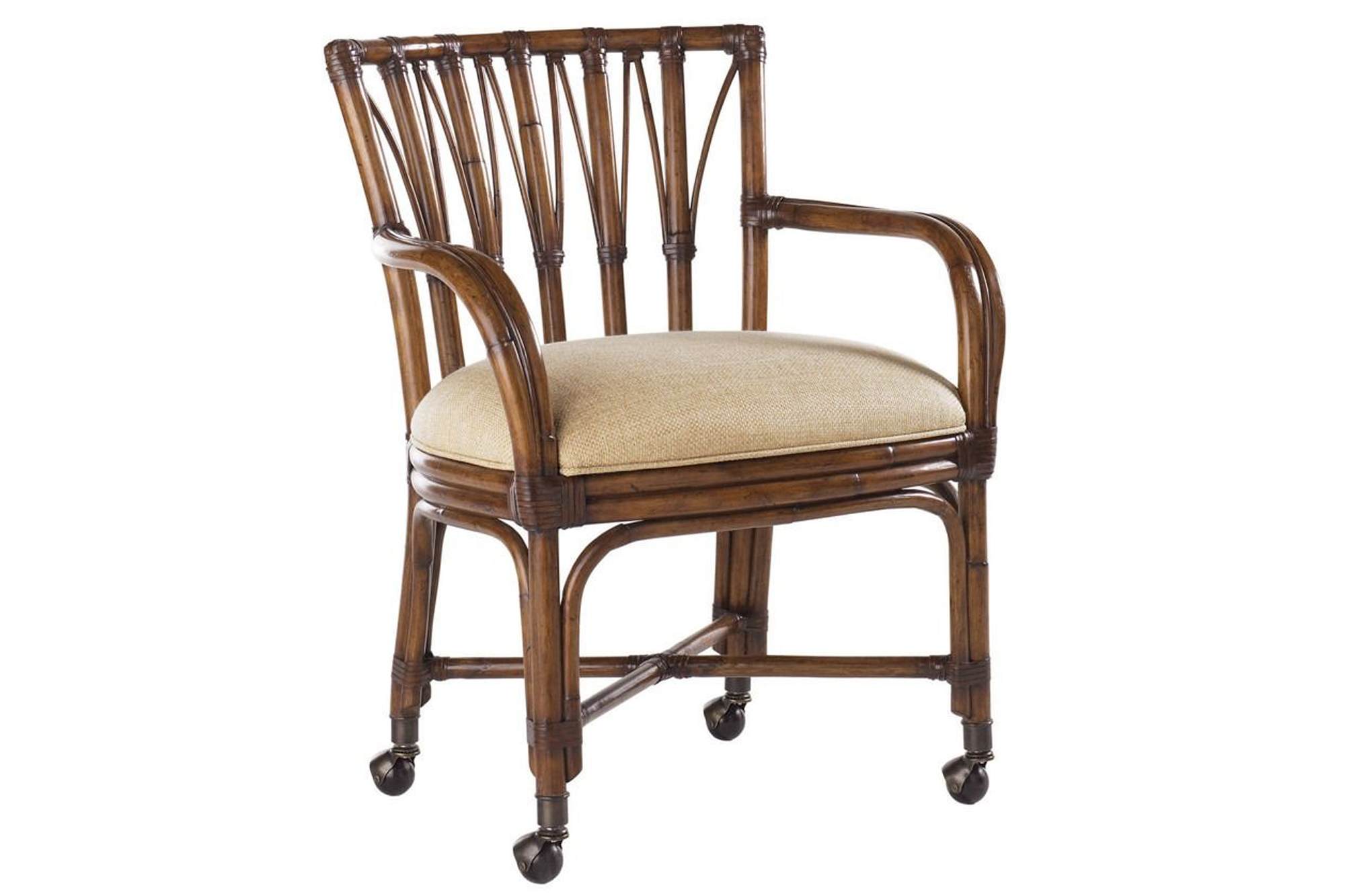 This game chair is constructed with a bent rattan frame and includes an upholstered seat. The seat is upholstered in Macadamia fabric, identified as a basket-weave pattern in a golden sand tone. The chair is fitted with rolling casters to allow mobility. Standard casters are designed for use on carpeted, porcelain, ceramic, or stone floor surfaces. When used on hardwood, engineered wood, or vinyl flooring, the standard casters may leave tracking marks and are recommended to be replaced with hardwood-safe casters. The chair is intended for residential game or table seating use where mobility is required.