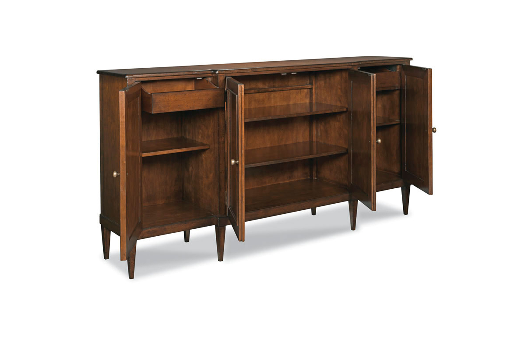 A handsome cabinet with a rectangular top resting over square posts that flank four framed cherry veneered doors raised by tapering feet.