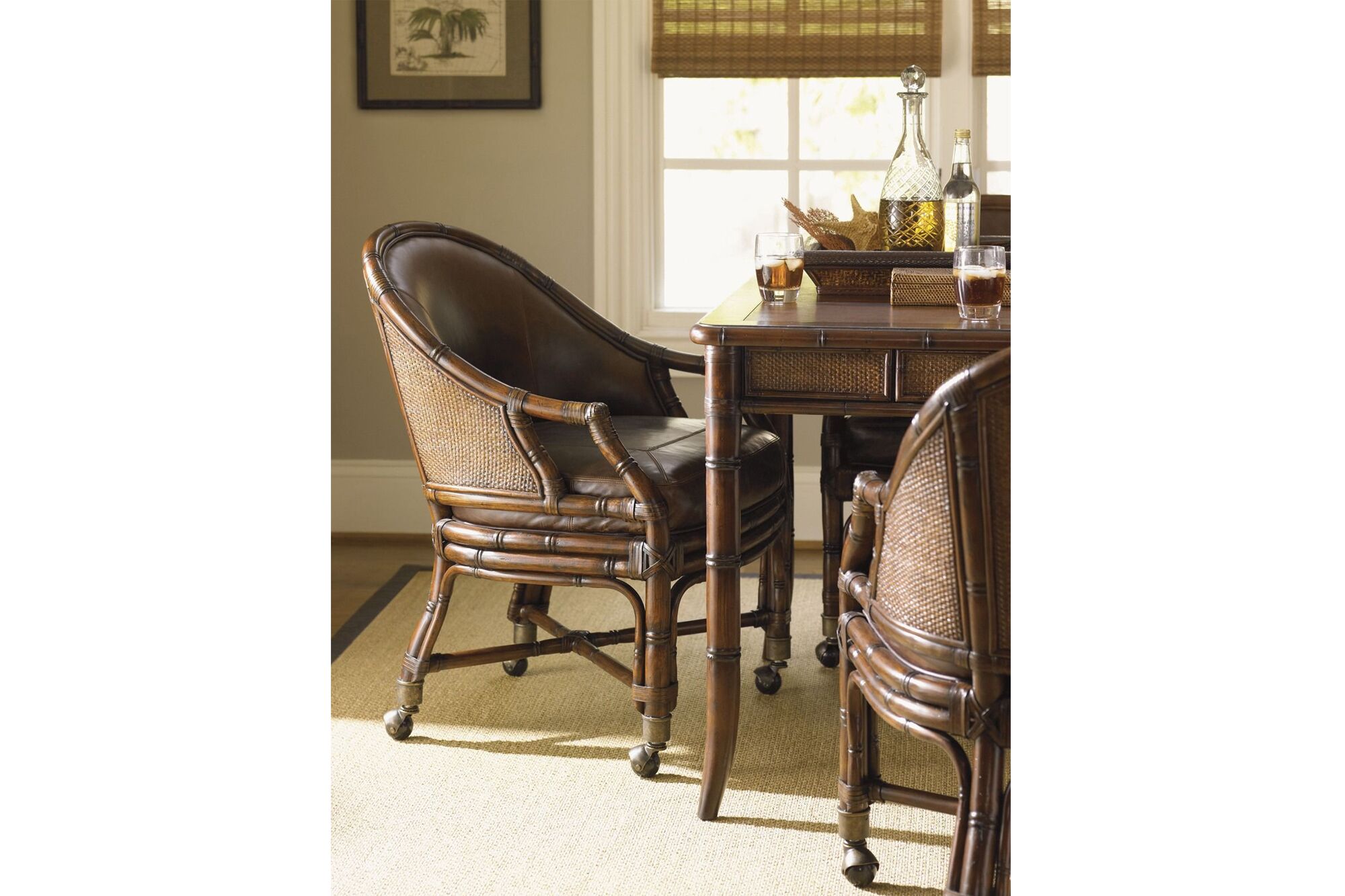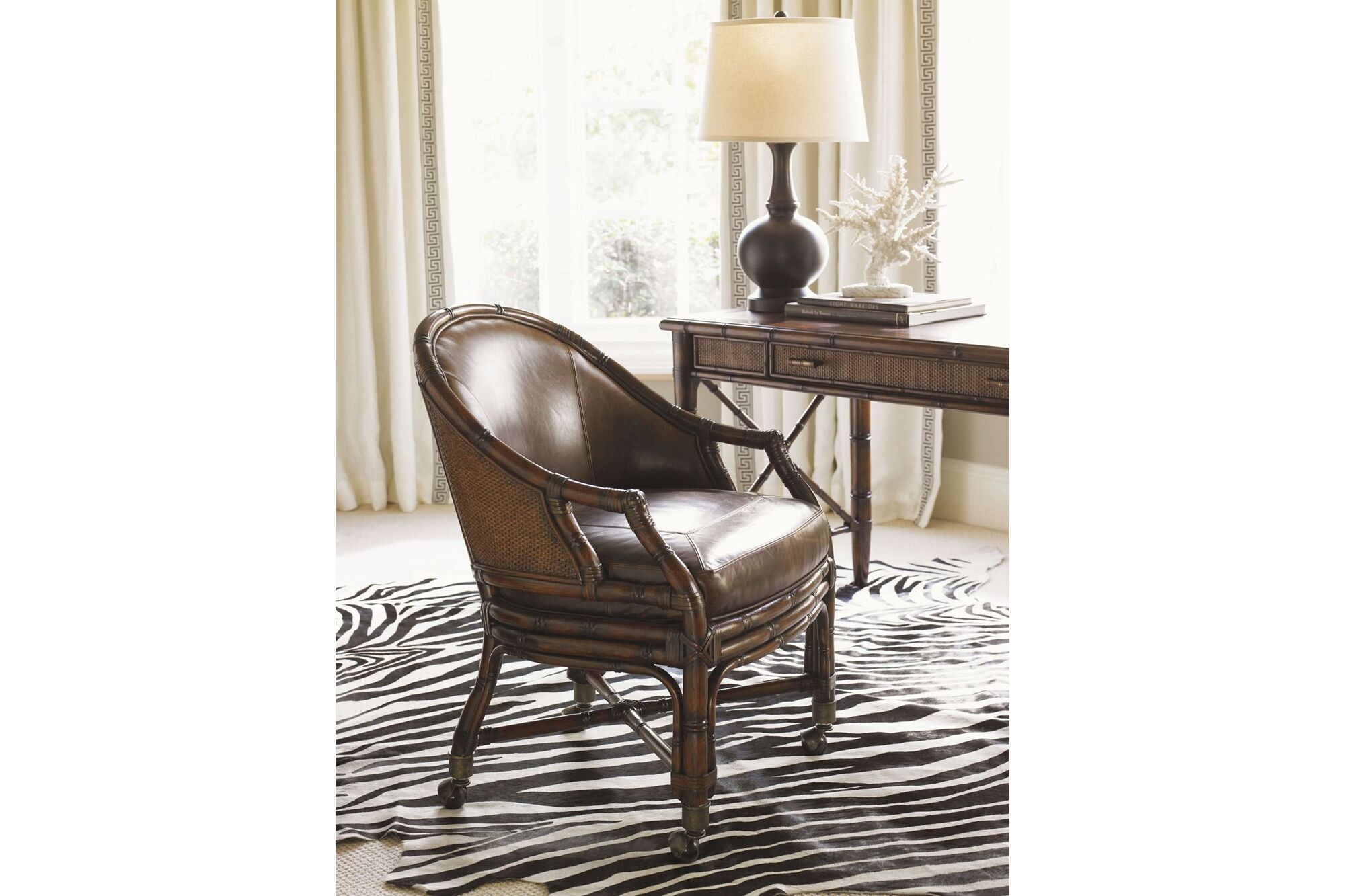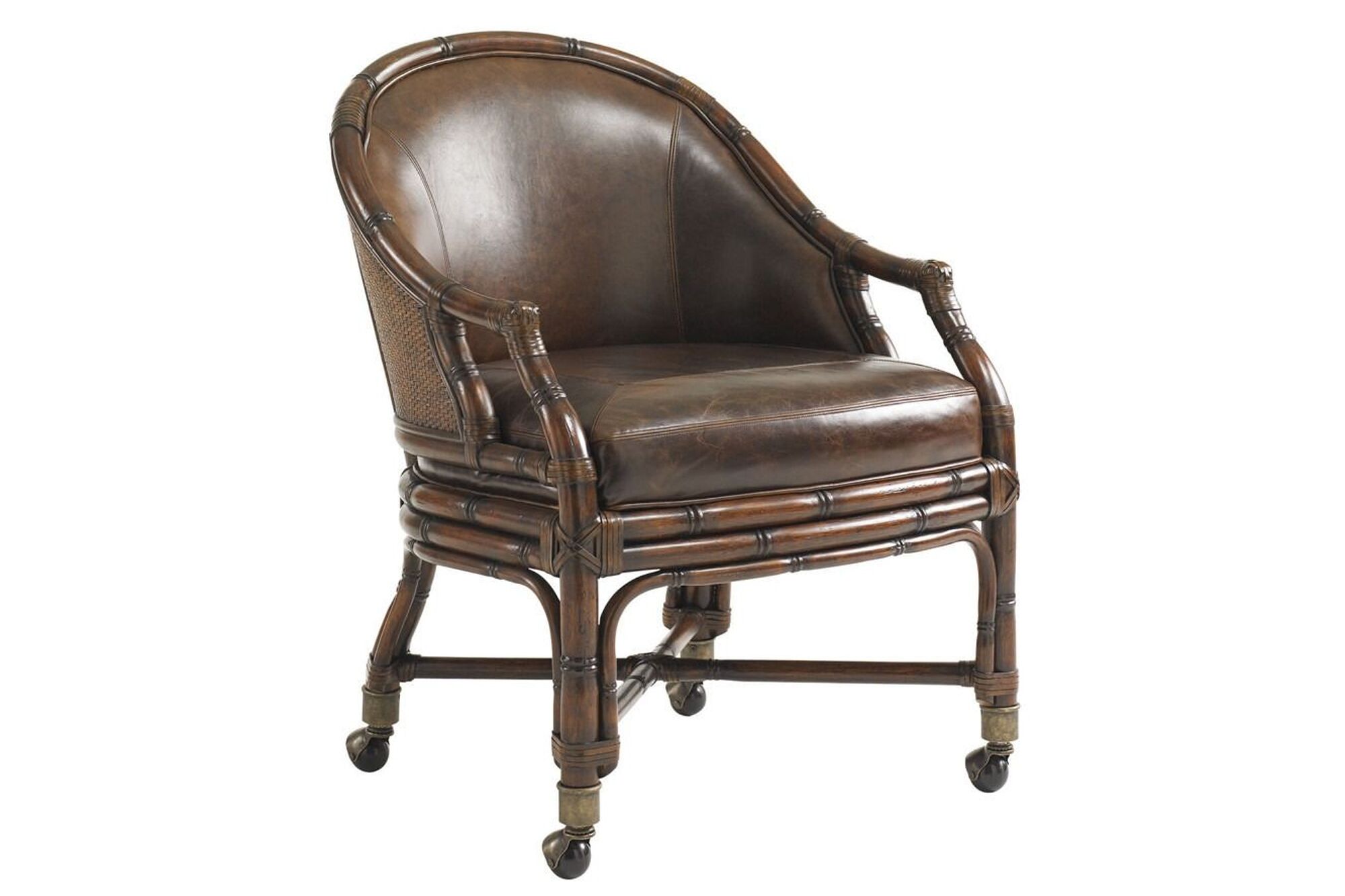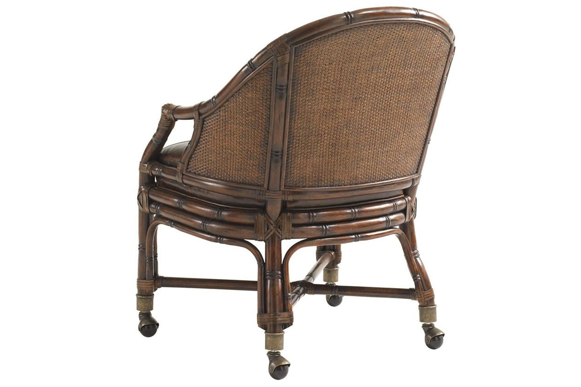 This desk chair features a leather-upholstered seat and inside back with a woven rattan outside back panel. The chair is finished in a chestnut brown leather identified as Leather 928371 – Padgett. The base is fitted with burnished brass casters. The chair is available only in the specified leather upholstery. Standard casters are designed for use on carpeted, porcelain, ceramic, or stone floor surfaces. When used on hardwood, engineered wood, or vinyl flooring, the standard casters may leave tracking marks and are recommended to be replaced with hardwood-safe casters.