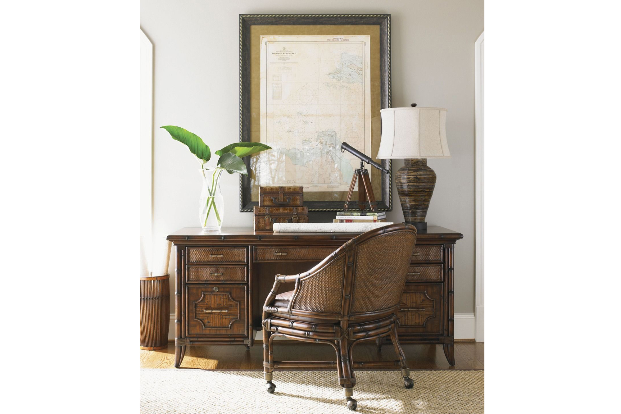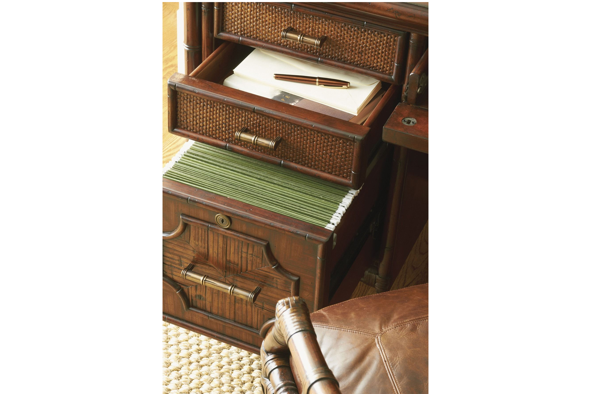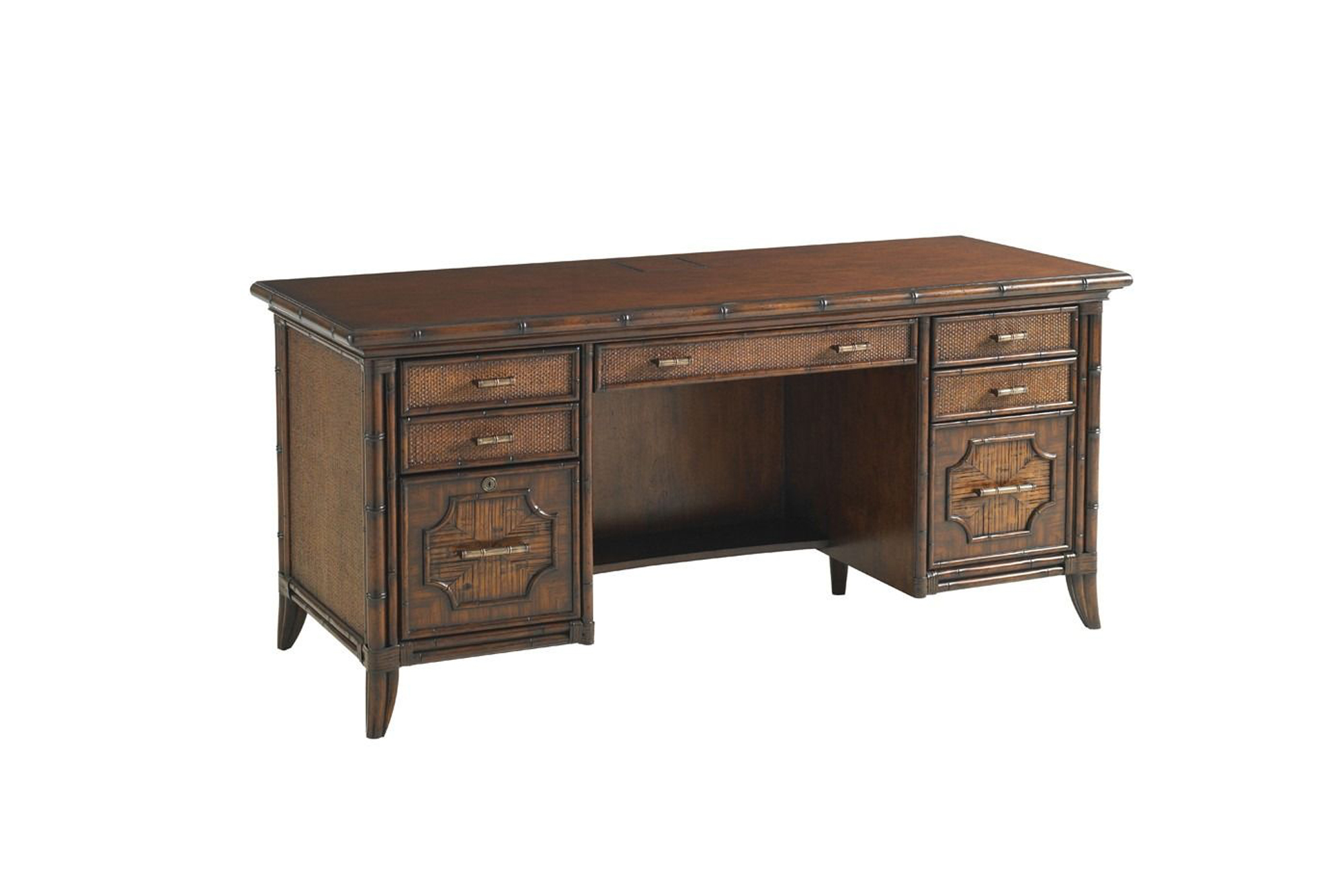 This credenza desk features a crushed bamboo frame and woven cane elements. The desktop is trimmed with rattan and includes a touch-latch laptop docking station with an integrated electrical power supply, surge protector, phone, data, and USB connections. Storage on each side consists of two drawers with woven rattan fronts and one full-extension file drawer positioned below. The left file drawer includes a locking mechanism. The center section features a drop-front keyboard drawer with an ergonomic palm rest and a shelf located beneath. An optional hutch is available. The piece is designed for residential or office use where integrated storage and power access are required.
