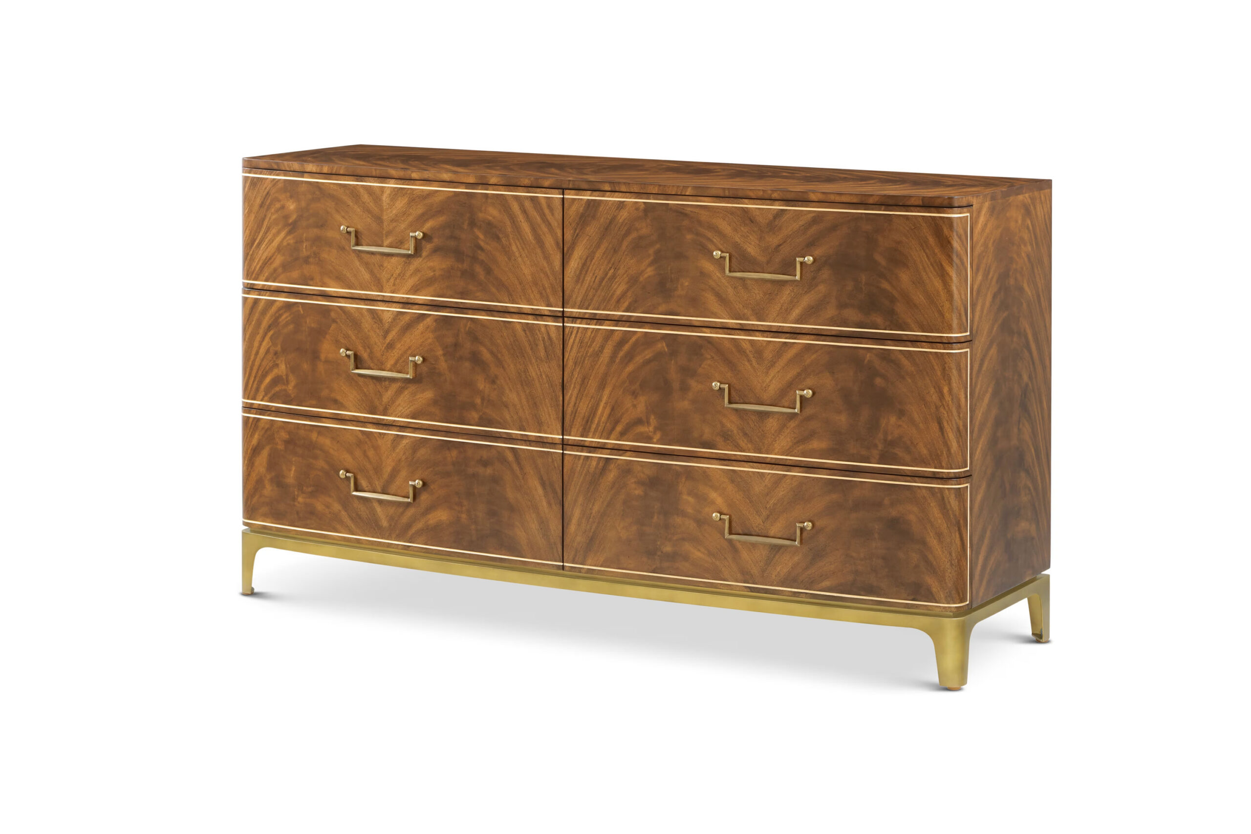 A six-drawer dresser constructed in crotch khaya veneer, featuring a symmetrical double-column drawer layout with three drawers per side. The drawer fronts display a bookmatched burl pattern, creating a mirrored grain figure across each row. Each drawer is fitted with brass drop handles mounted on shaped backplates, aligned consistently across the facade. Horizontal banding defines each drawer division, reinforcing the structured layout. The case is raised on a recessed base with a brass-clad plinth and integrated low-profile legs, providing a floating visual effect. The overall form is rectilinear with softened edge transitions, emphasizing the veneer figure while maintaining a controlled, architectural presentation.