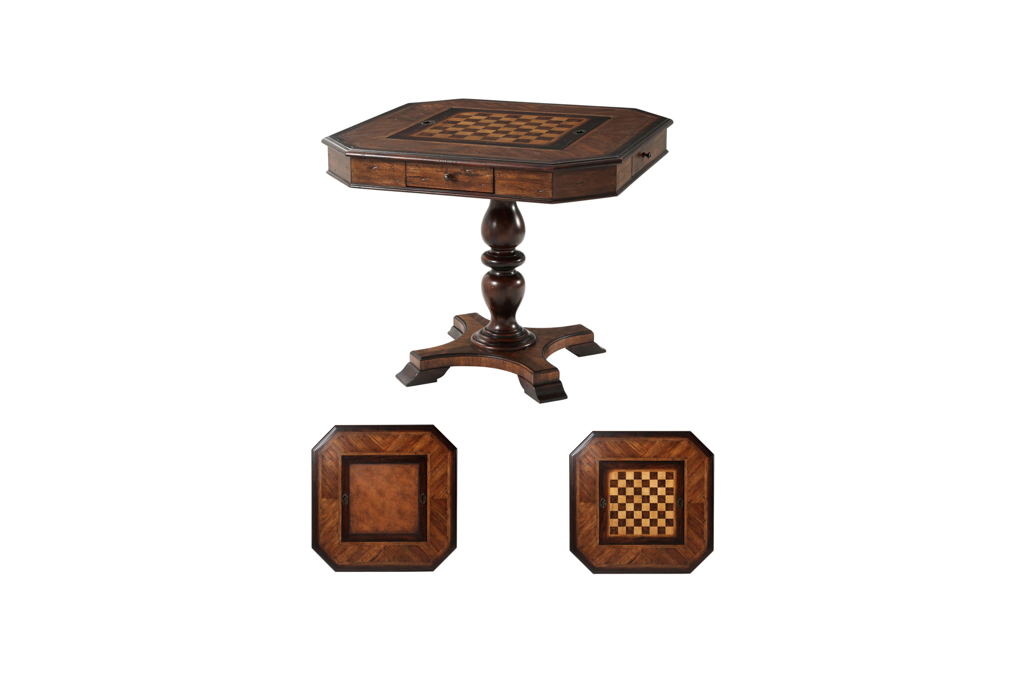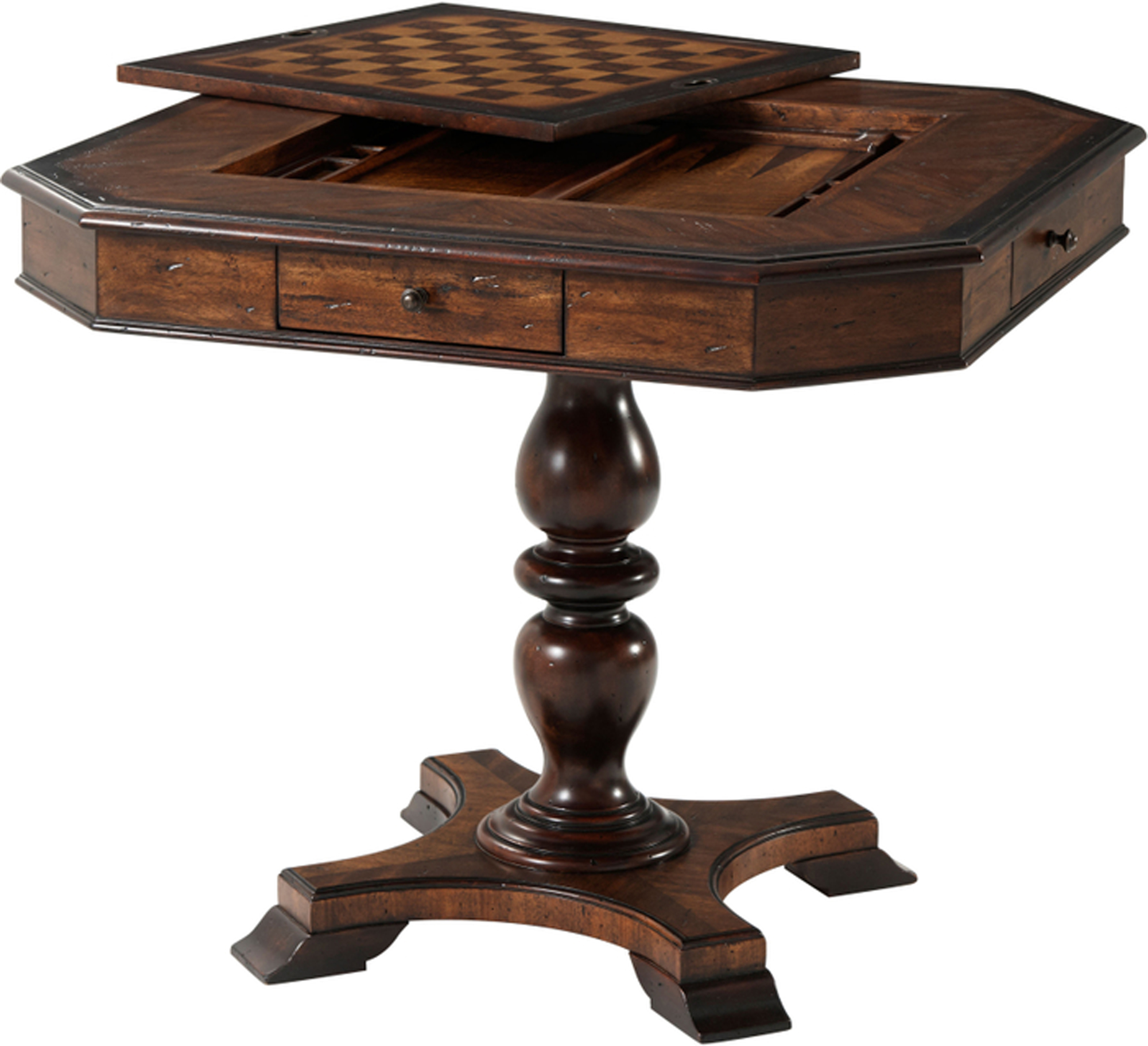 Square game table with a canted top featuring mahogany, acacia, and oak parquetry. A reversible center panel provides a leather playing surface on one side and a chess-inlaid surface on the other, with an inlaid backgammon board well. The table stands on a turned column with a quatrefoil base and includes a wooden chess set and backgammon counters.