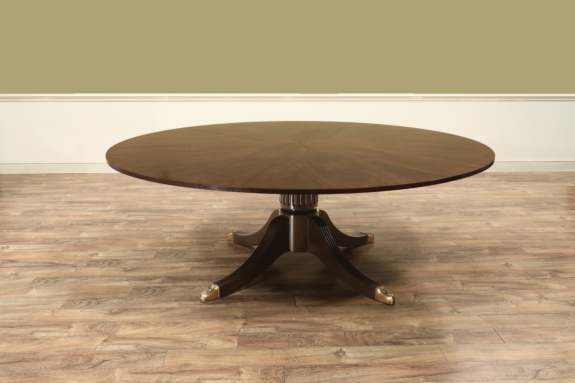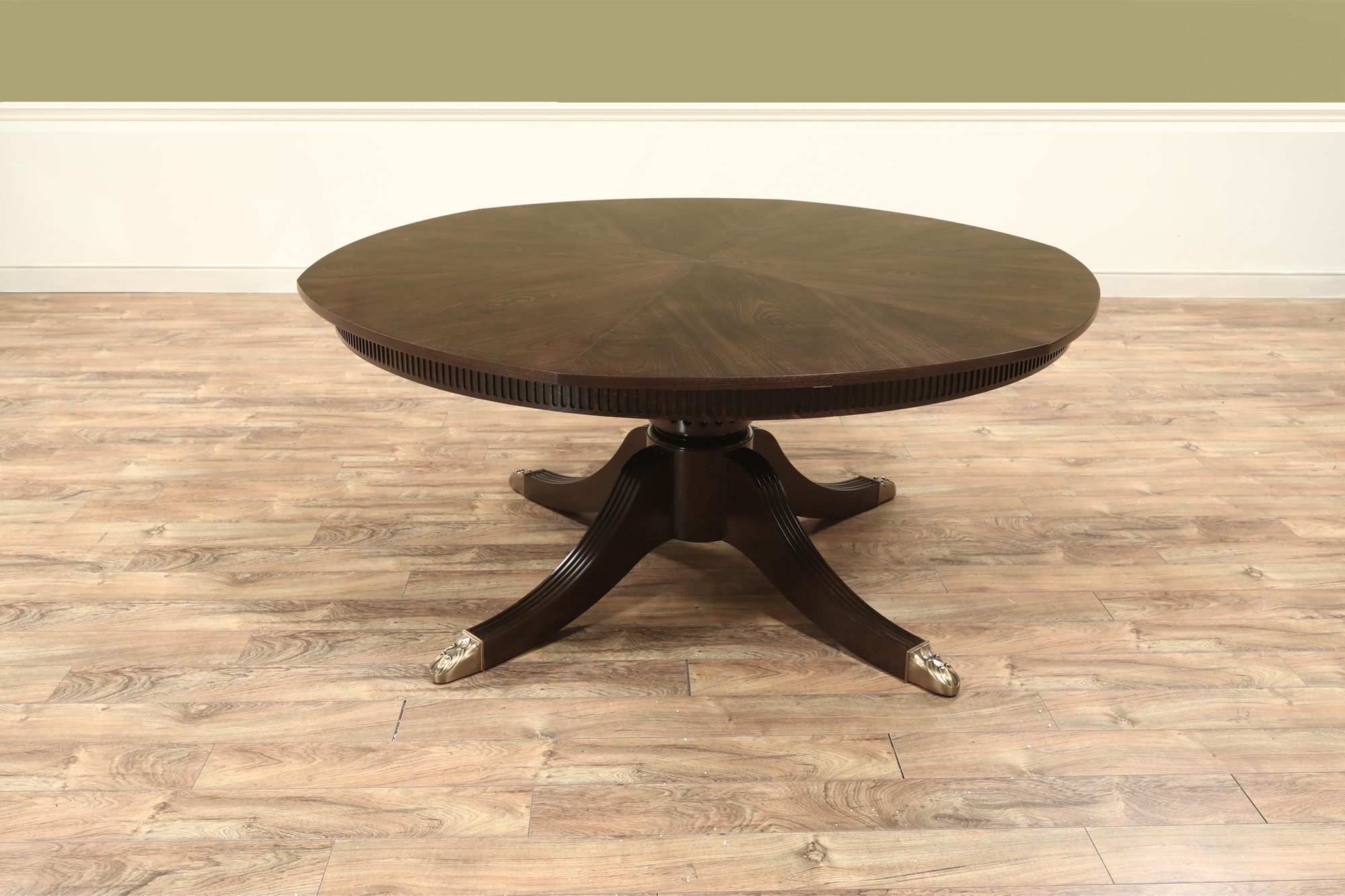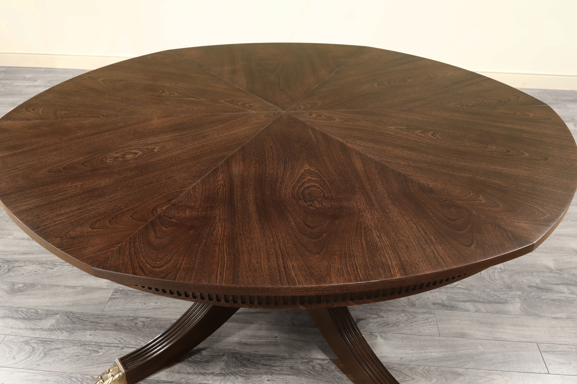 An expandable round dining table, a high-end reproduction of the Stately Home Baker Capstan table, an AP Exclusive by AntiquePurveyor. This round pedestal table has self-storing leaves and seats 6-10 people. It can be used at 64″ round or 84″ round. It has a simplistic, classical “understated” sapele mahogany field with a brown walnut finish.