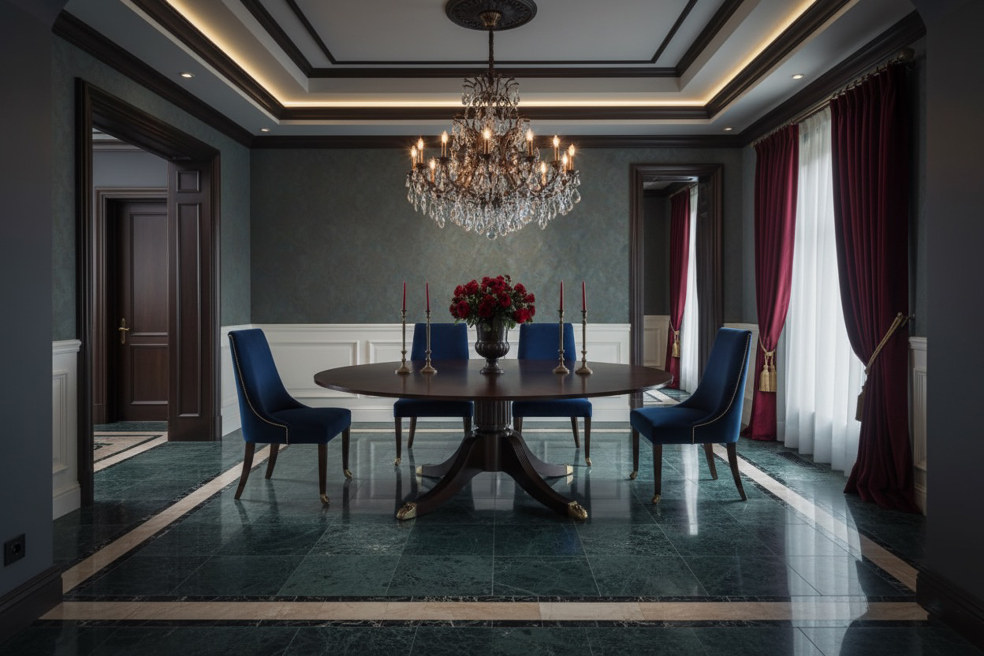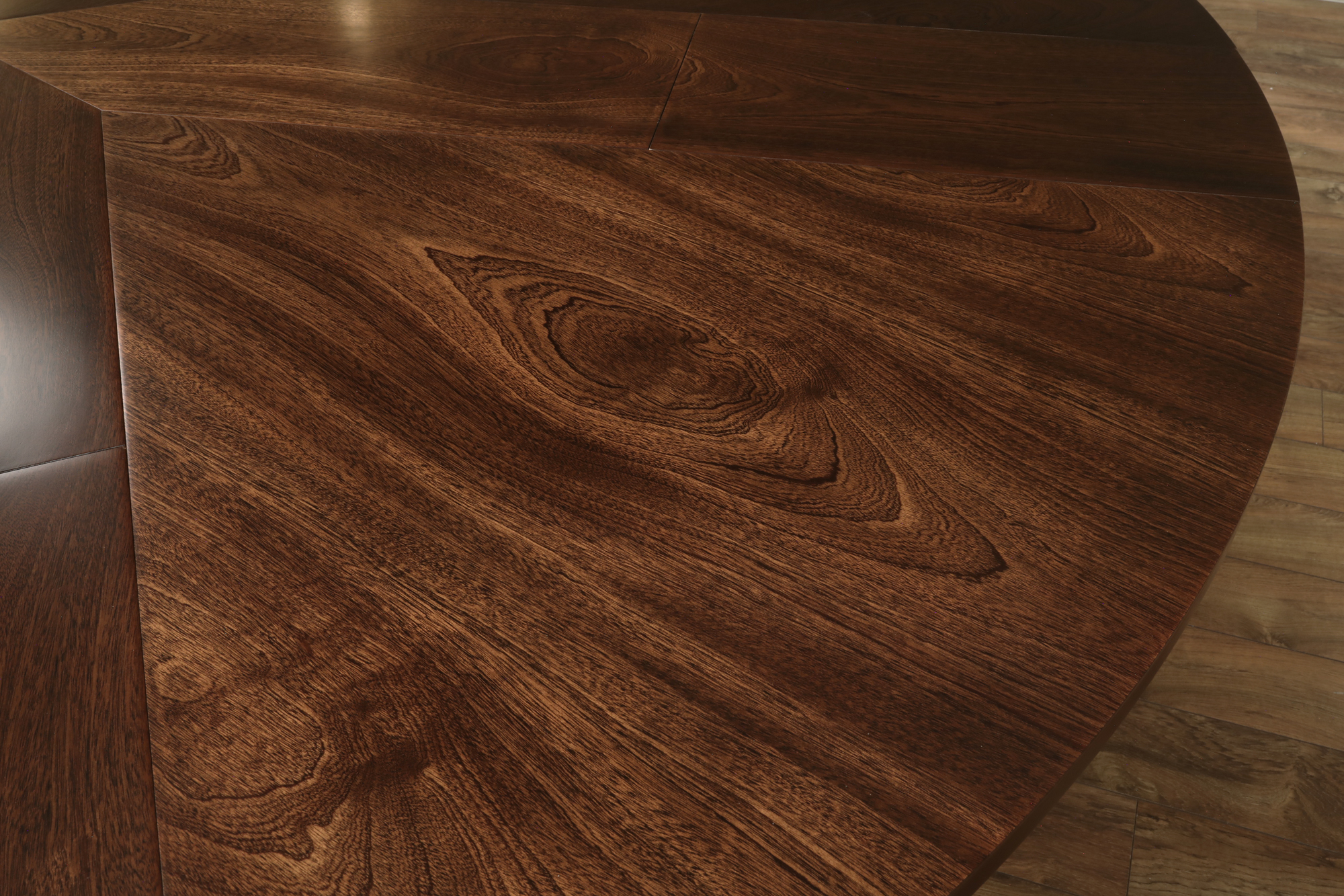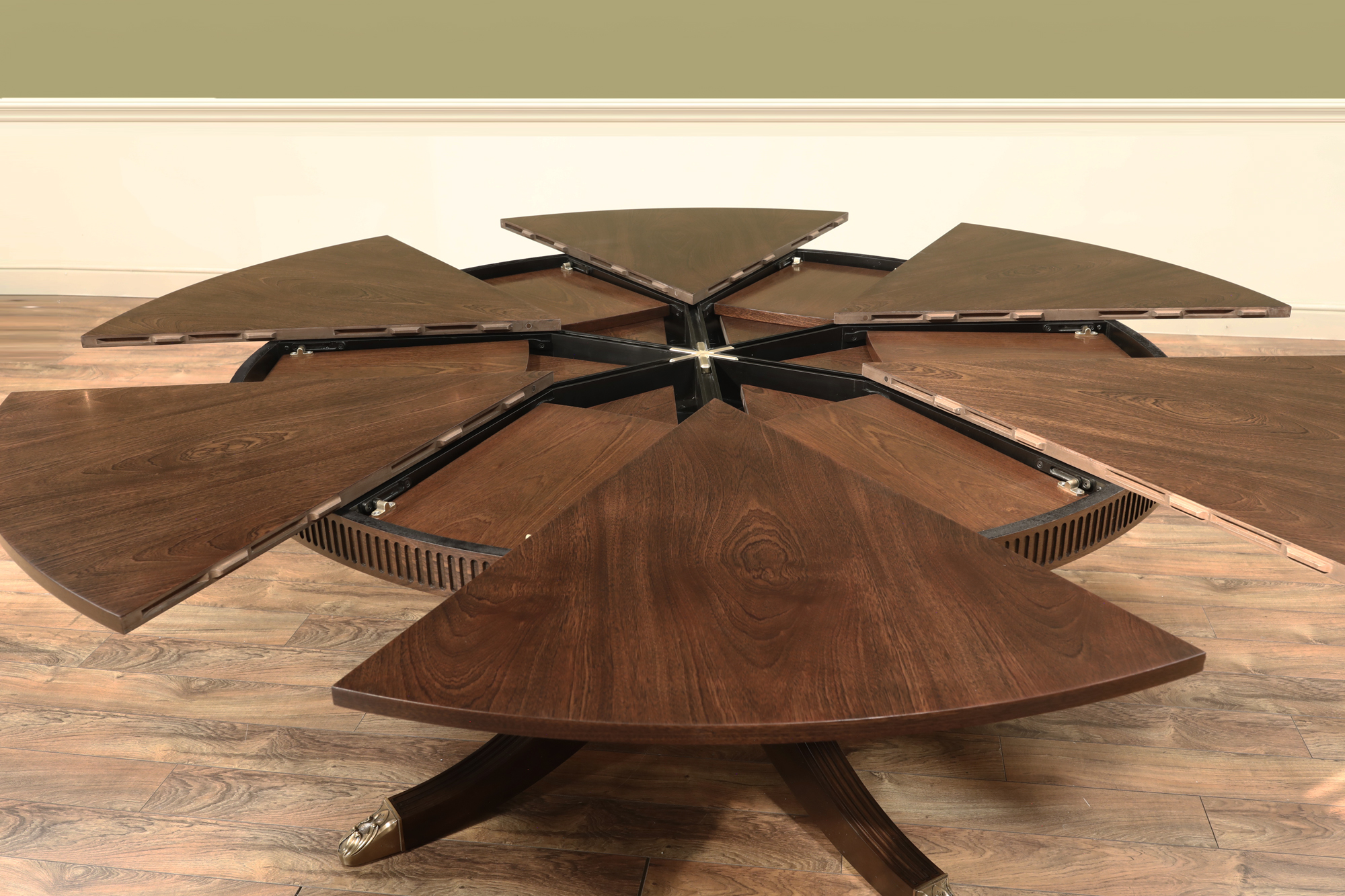 An expandable round dining table, a high-end reproduction of the Stately Home Baker Capstan table, an AP Exclusive by AntiquePurveyor. This round pedestal table has self-storing leaves and seats 6-10 people. It can be used at 64″ round or 84″ round. It has a simplistic, classical “understated” sapele mahogany field with a brown walnut finish.