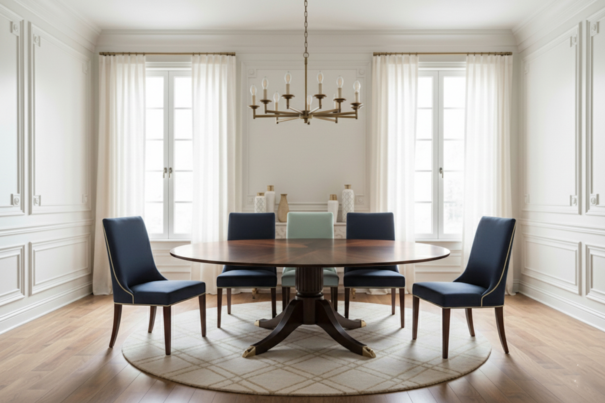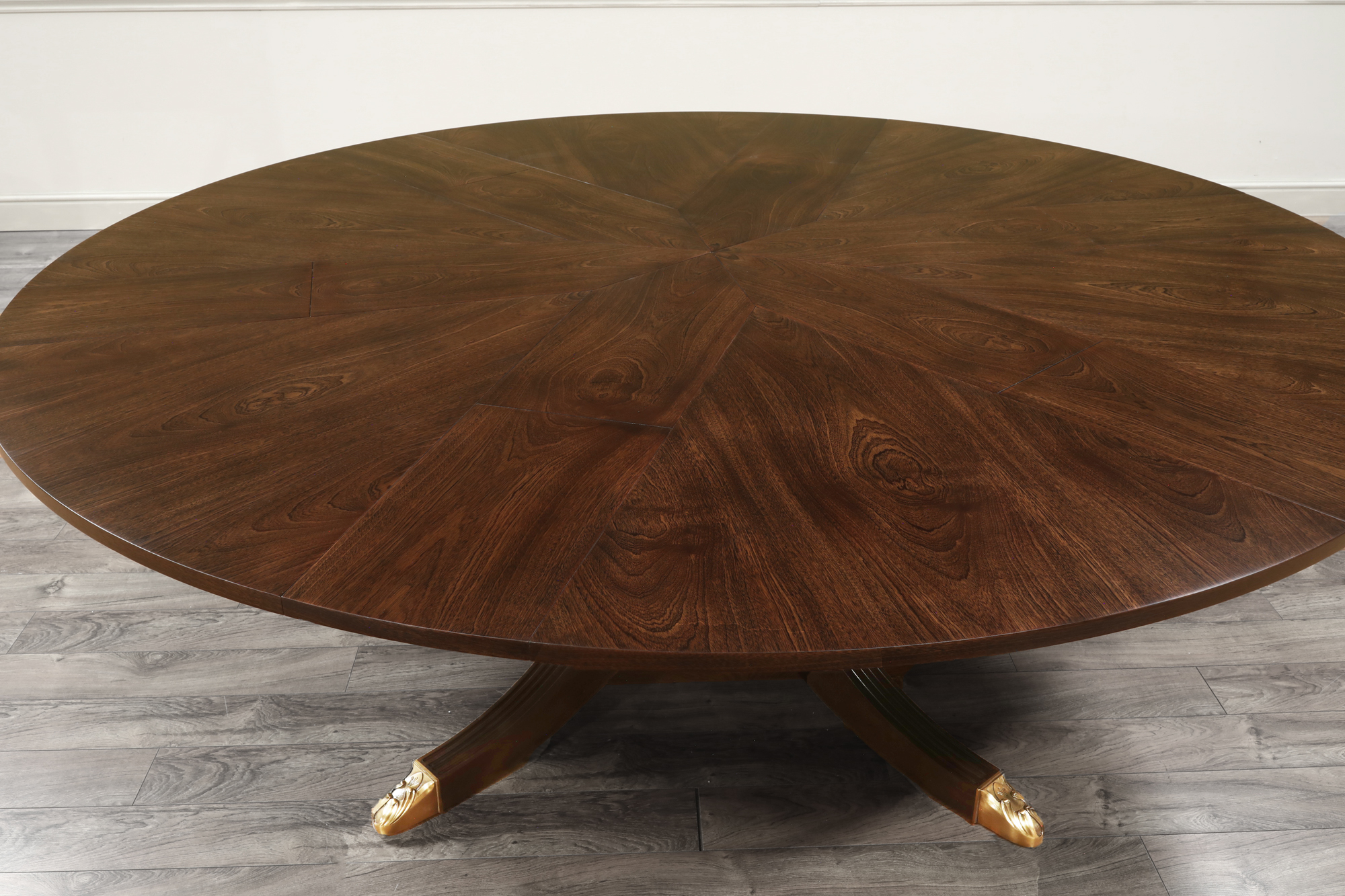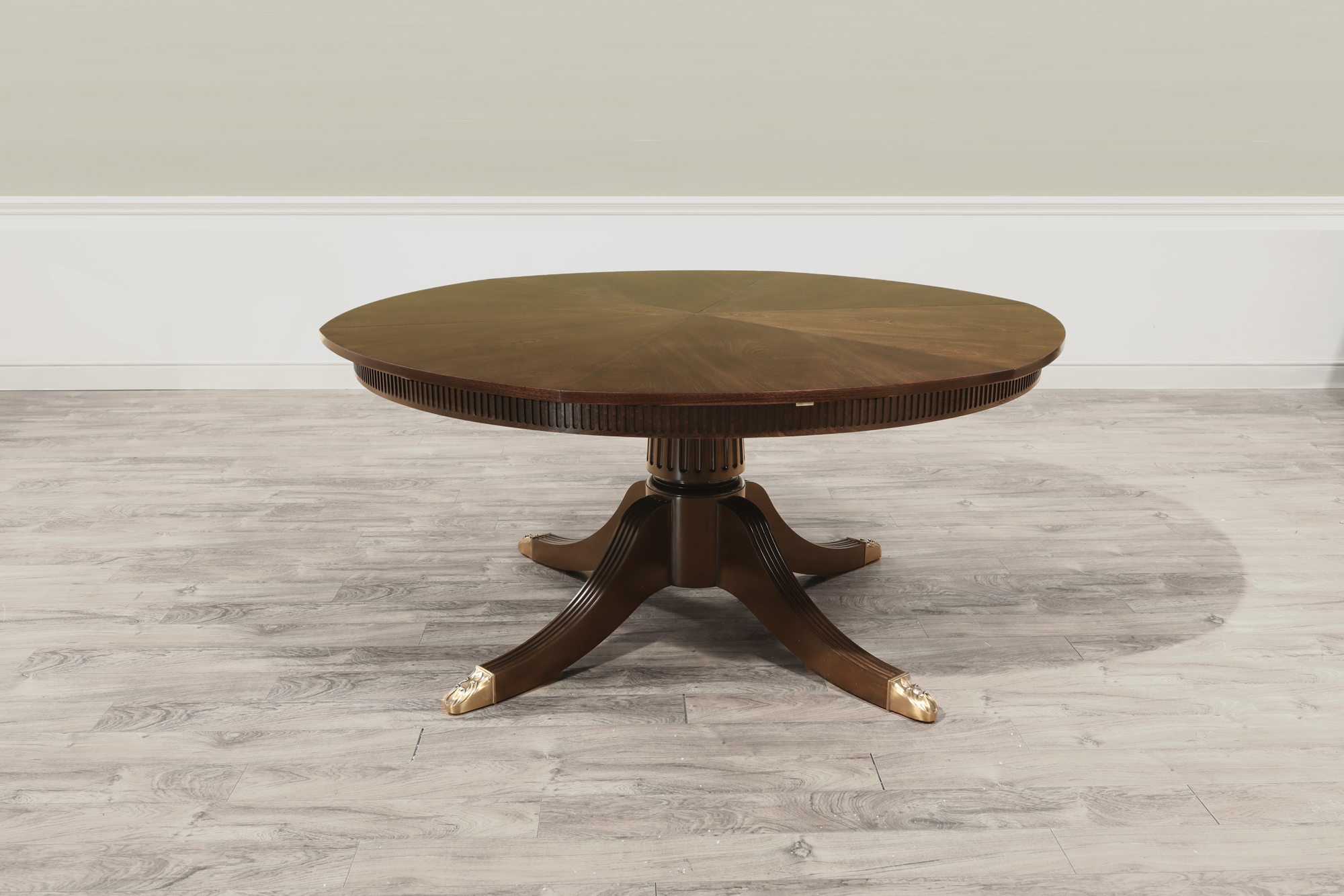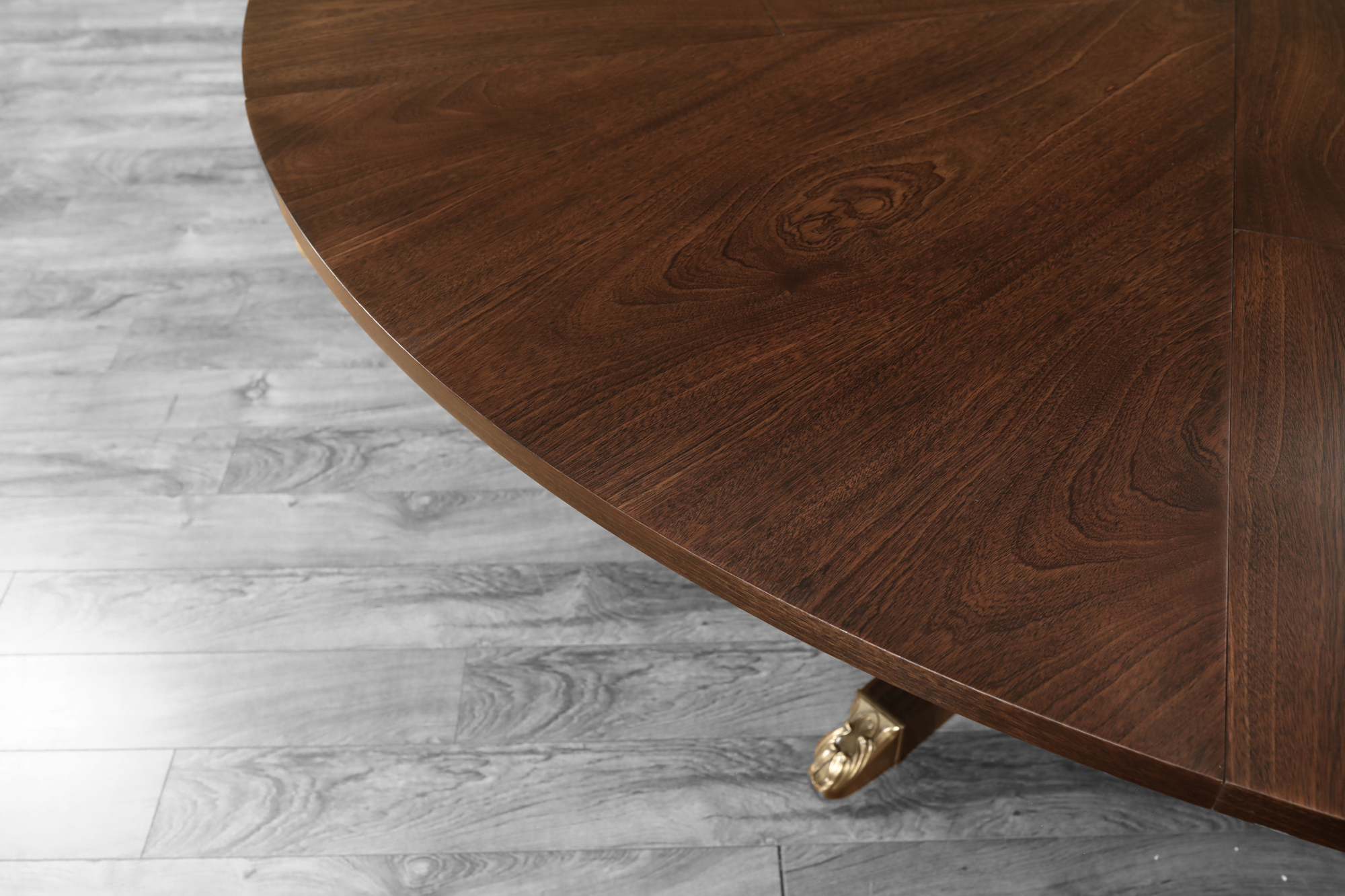 Home » Catalog » 64-84 Inch Expandable Round Dining Table, Mahogany Jupe Table w Self-Storing Leaves Brass Feet an AP Exclusive by AntiquePurveyor