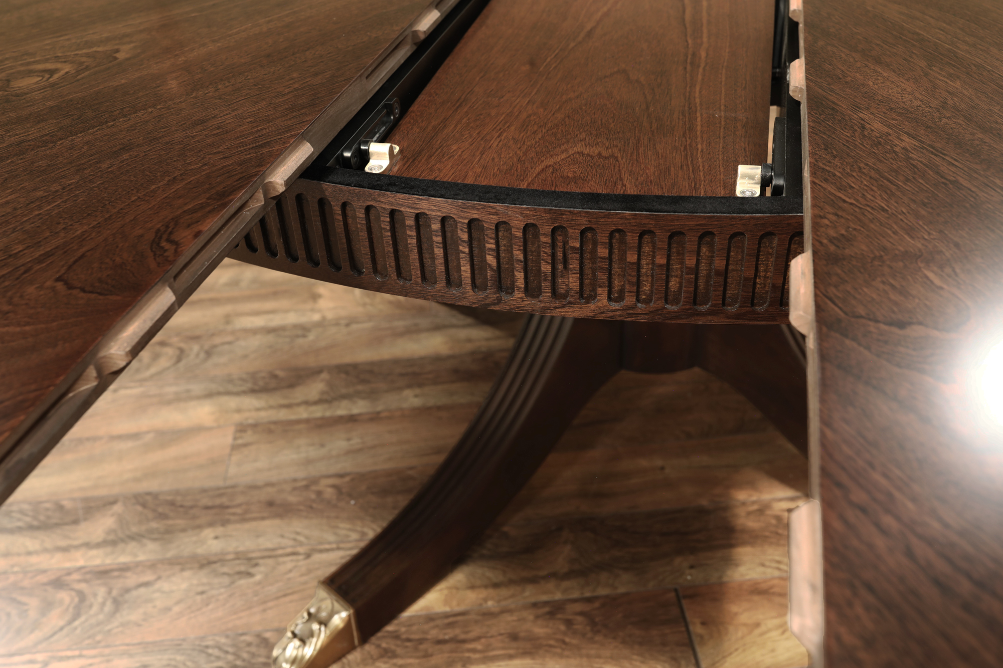 We measured every detail of the original Baker table; therefore, this reproduction table will be very accurate if compared to the Stately Homes original. The table stands on four heavy saber legs, each terminating in a polished brass foot cap, which is cast and polished to an amazing detail using the lost wax casting method. Unlike the original Baker table, these leaves are self-storing; therefore, you do not need a storage cabinet. They will stow away inside the table and behind the apron. The apron, the column, and the legs are very significant, heavy, and sturdy. The outswept tapered legs are fluted to match the similarly decorated apron and oversized fluted column.