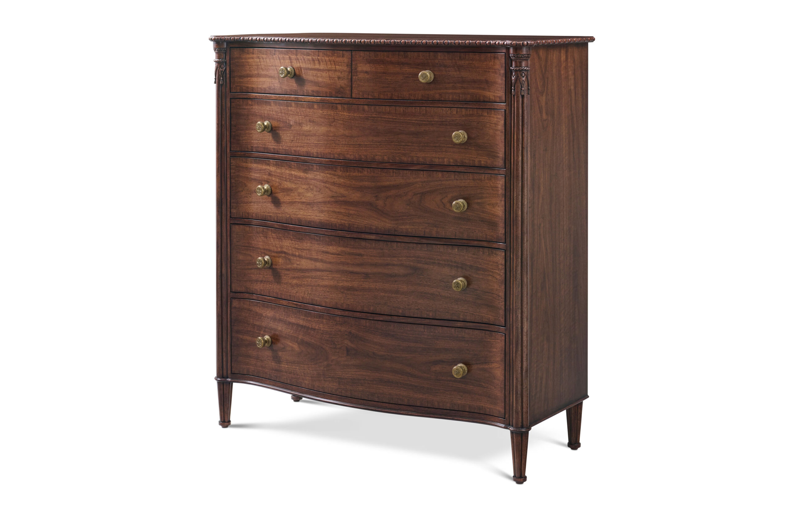 A chest of drawers featuring a six-drawer configuration within a figured walnut frame and case. The drawer layout consists of multiple stacked drawers arranged vertically, each fitted with brass drawer pulls that provide consistent hardware across the front. The case and legs are framed with carved detailing, introducing ornamentation along the edges and structural elements of the piece. Inlay accents are integrated into the design, contributing additional surface detail across the drawer fronts and surrounding framework. The figured walnut construction presents natural variation in the grain, while the carved elements define the overall profile of the chest. The piece is supported by integrated legs that continue the carved motif.