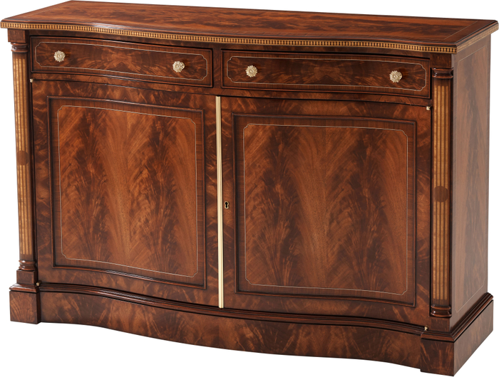 Flame mahogany serpentine buffet or side cabinet. A finely inlaid 2-door buffet on a plinth base, two flanking inlaid columns. two drawers and locking cabinet doors with raised panels. Antiqued solid brass drawer pulls, slip-matched flame mahogany door panels, cross-banded top, and satinwood inlaid edge.