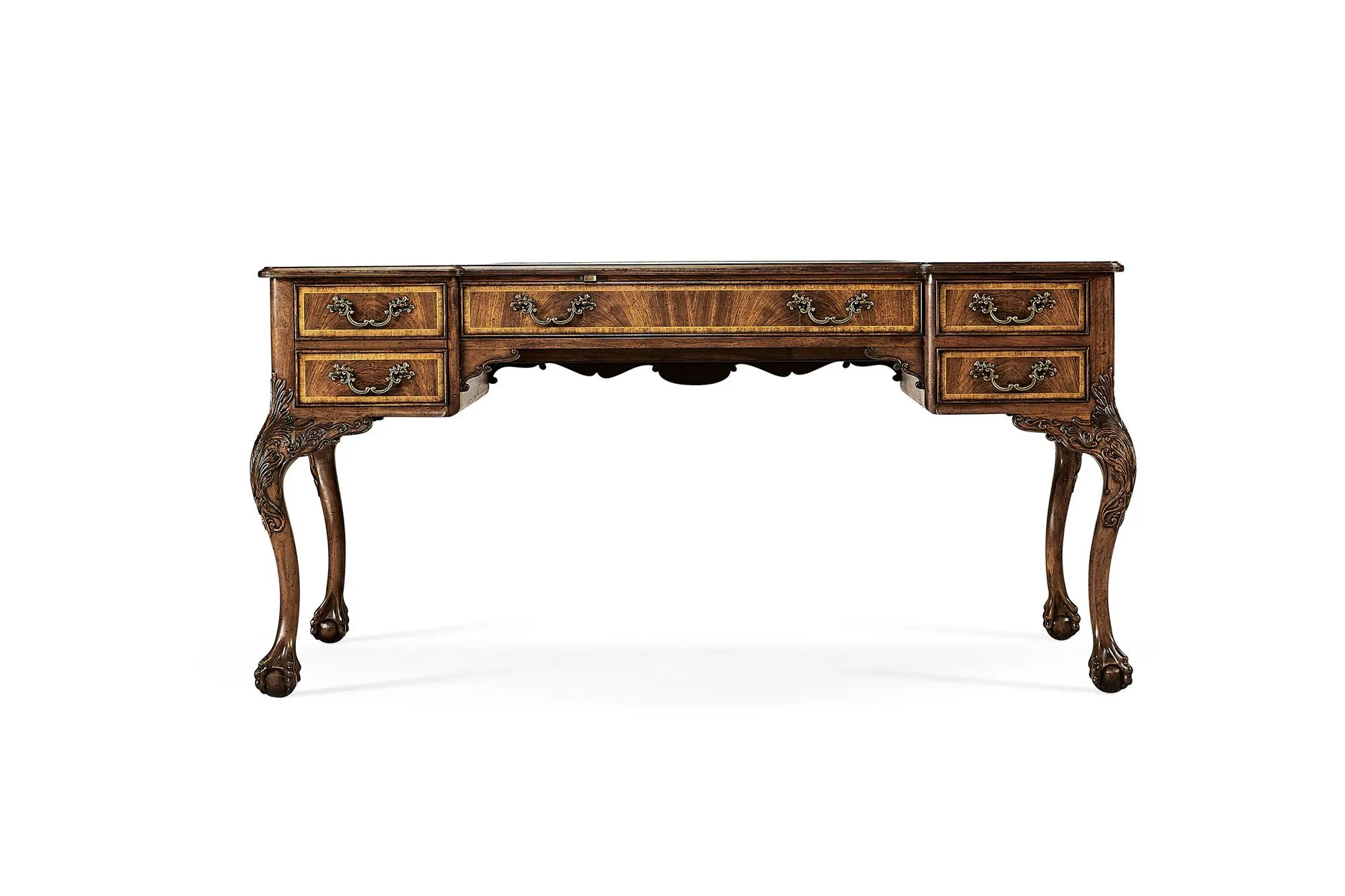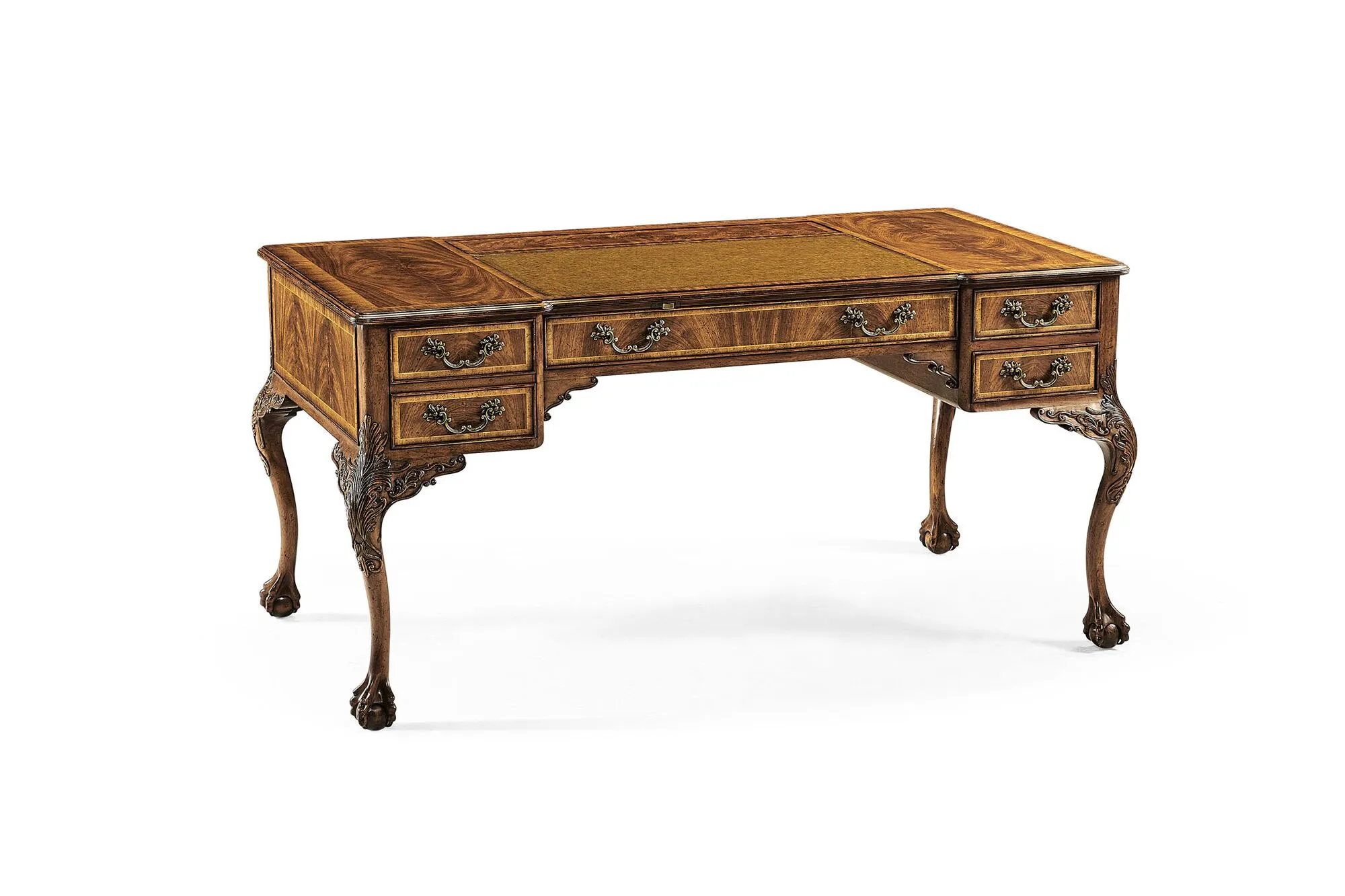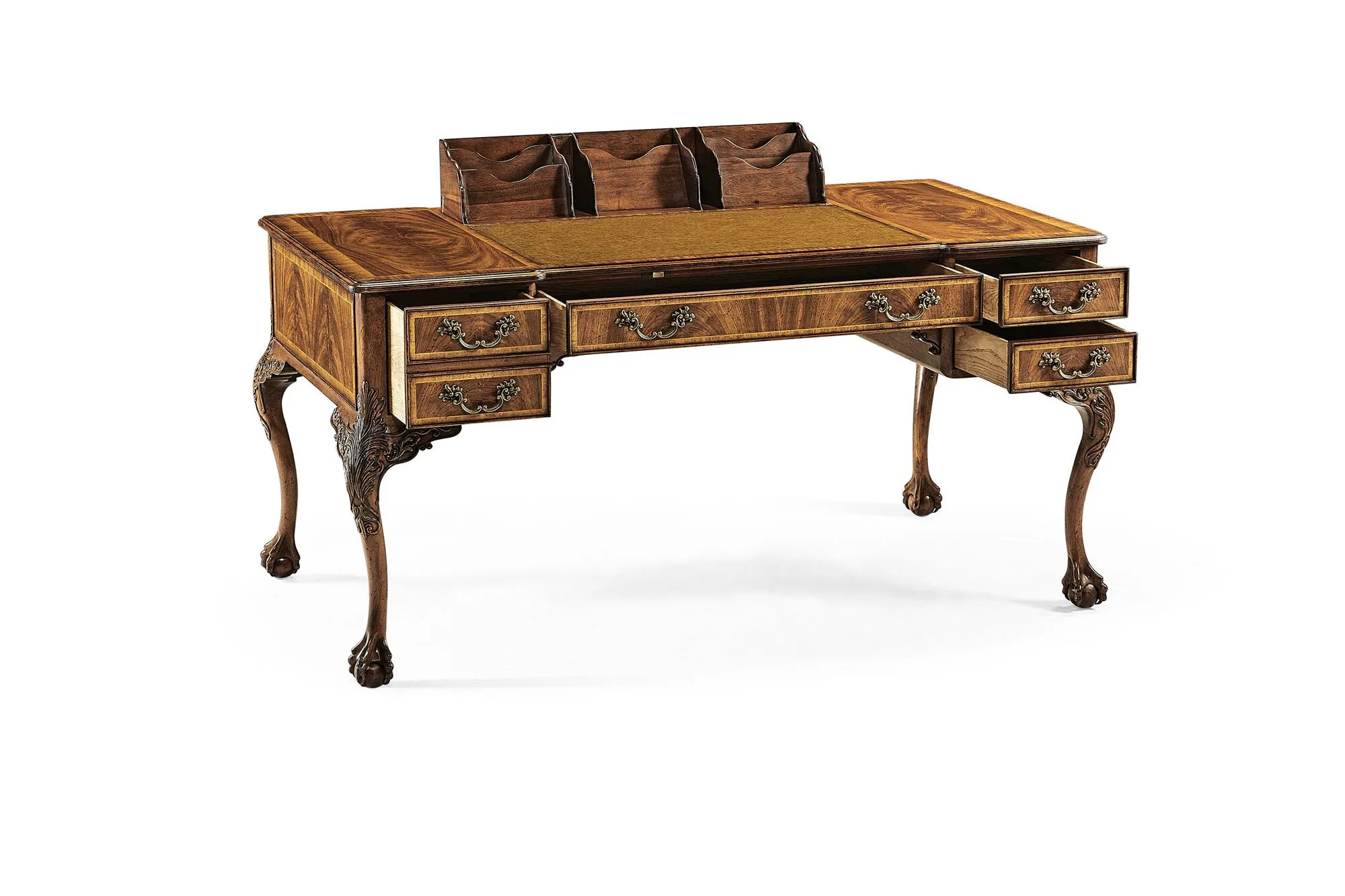 Imposing George II style walnut desk with tan leather inset surface, fine carving to the shoulders of the cabriole legs and with a secret pop-up compartment. The desk supported on detailed ball and claw feet.