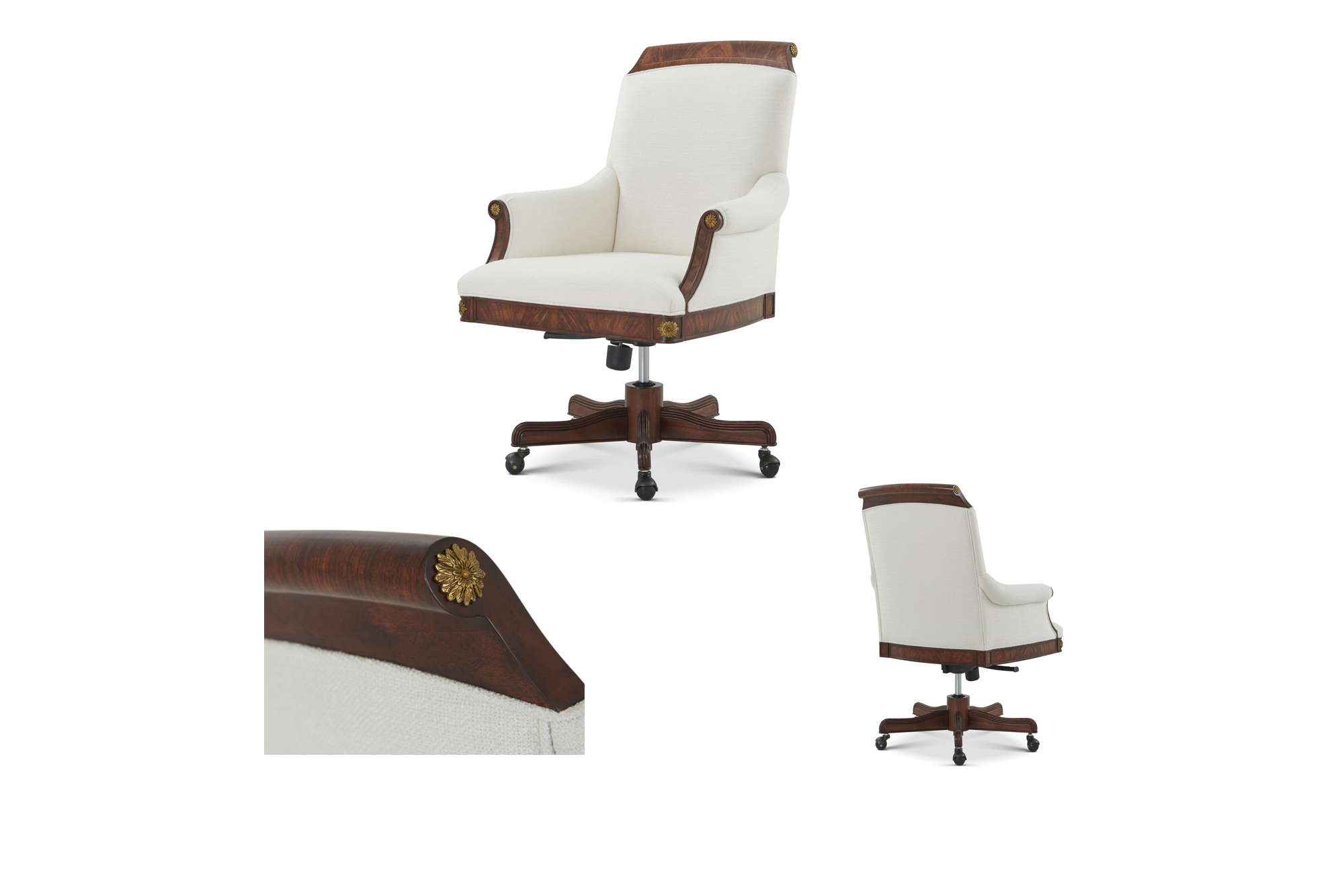 Upholstered desk chair featuring a shaped back and seat with classic tailoring. Raised on turned legs with brass casters, the chair combines traditional detailing with functional mobility suitable for home office or writing desk use.