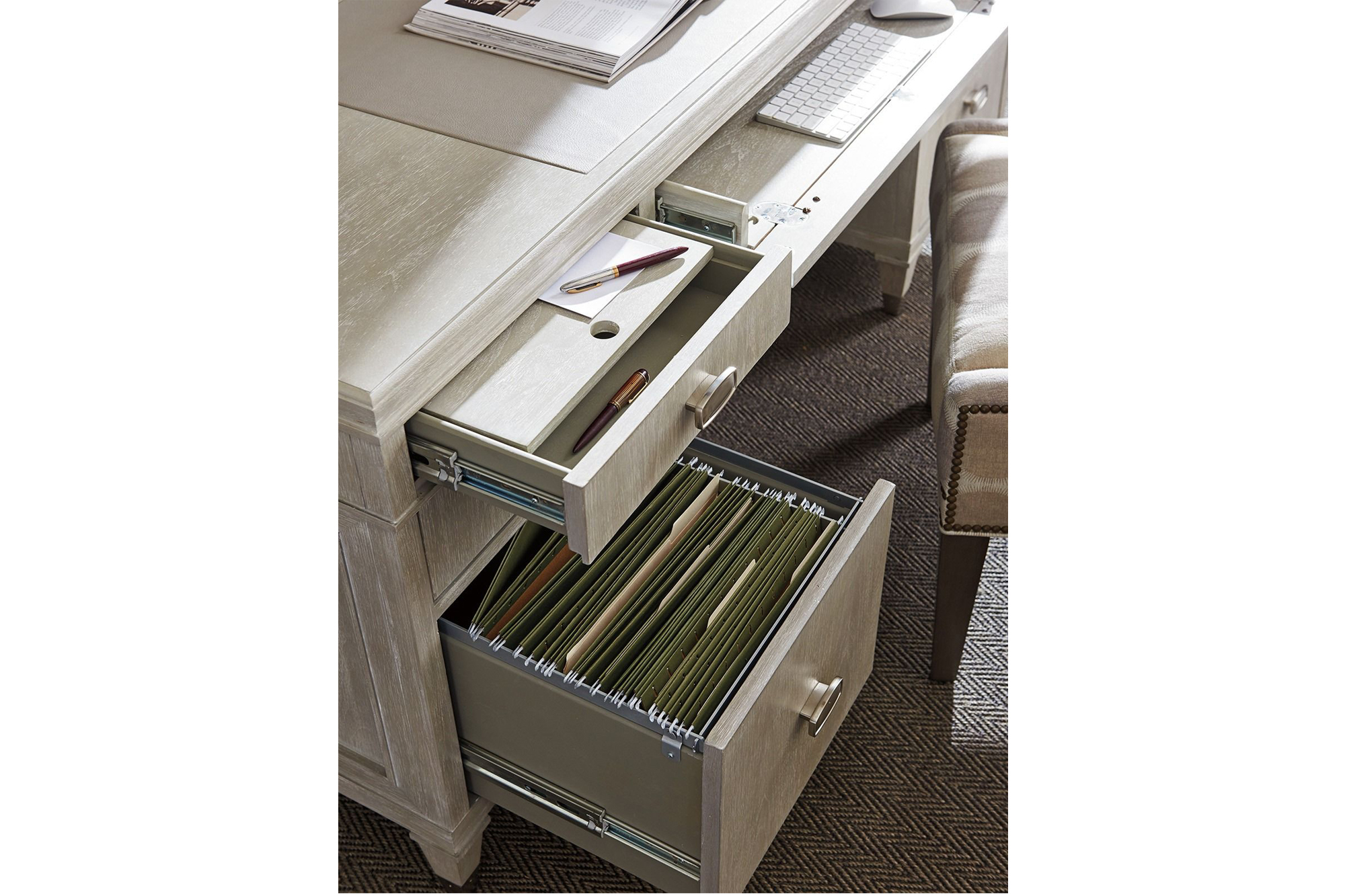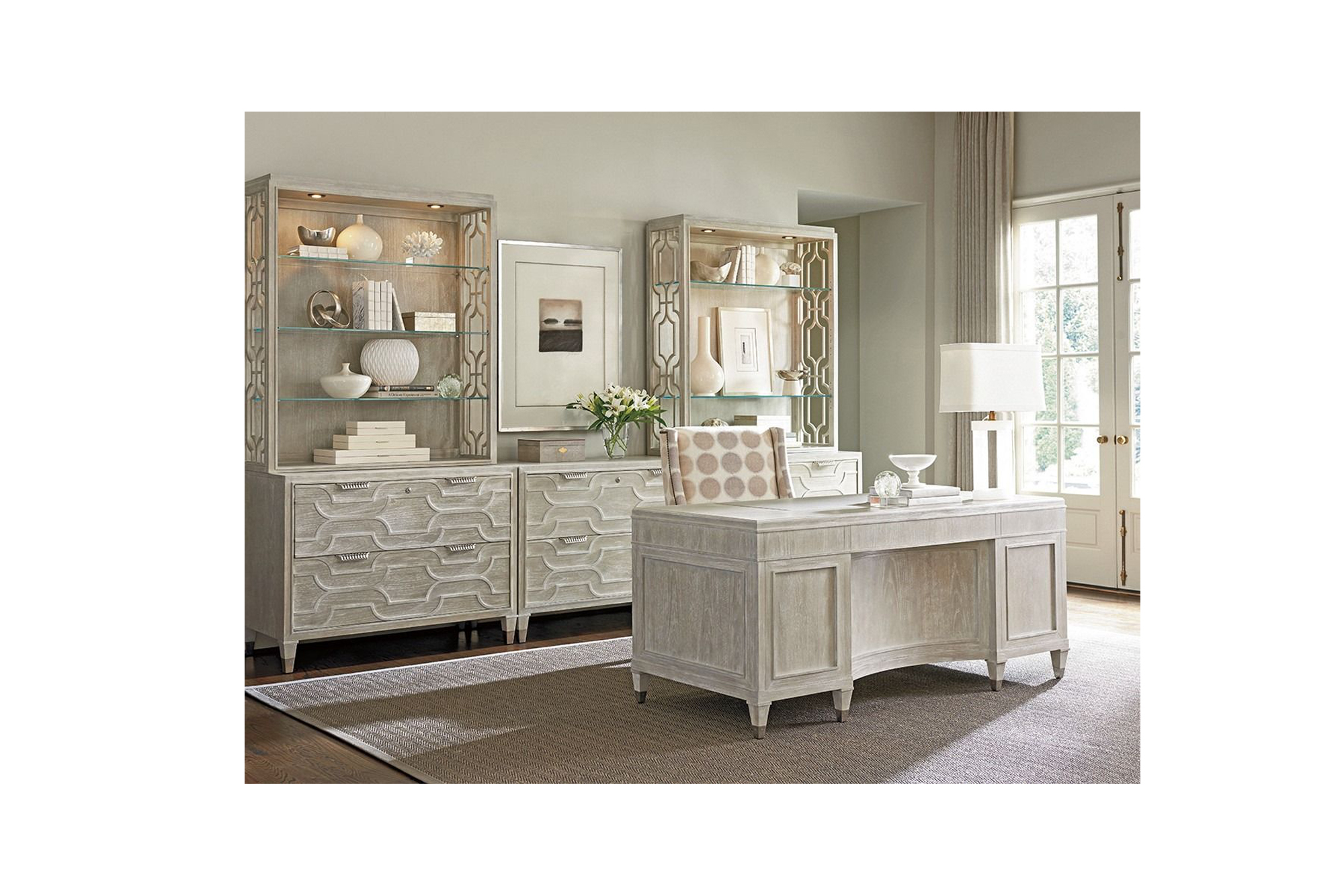 This executive desk is finished in a gray tone and designed with a curved privacy panel at the front. The desk is supported by spade-style feet that form part of the base structure. The work surface is fixed and intended for seated use. The curved privacy panel provides frontal coverage beneath the desktop while maintaining an open rear configuration. The desk is suitable for placement in a home office, study, or workspace where a fixed writing surface and frontal panel are required.