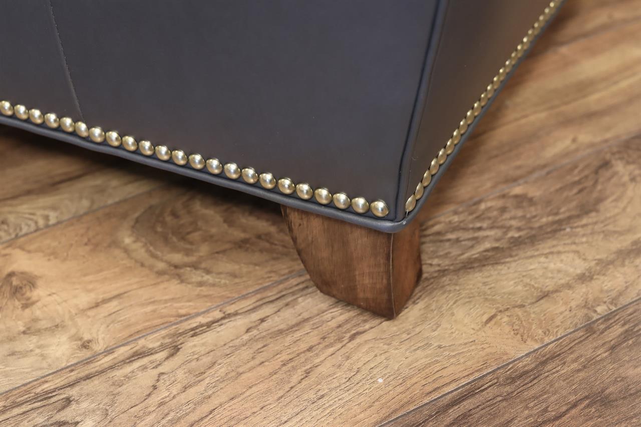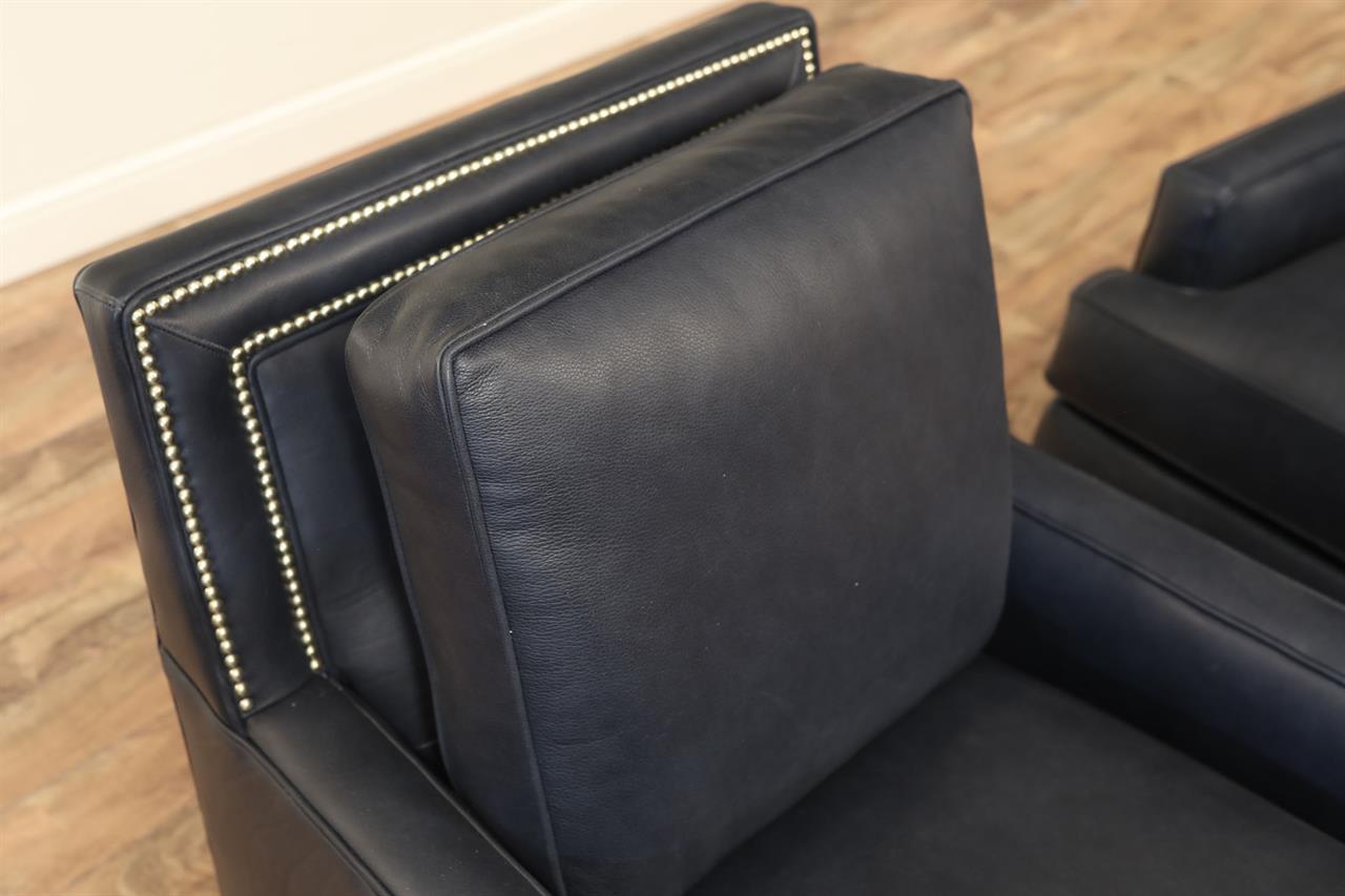 American-made fully customizable leather living room chair with brass nail trim. This chair is shown with Denmark-finished frames which have a lightly distressed ash color finish and Memphis Shutter leather which is a dark deep ocean-blue leather.