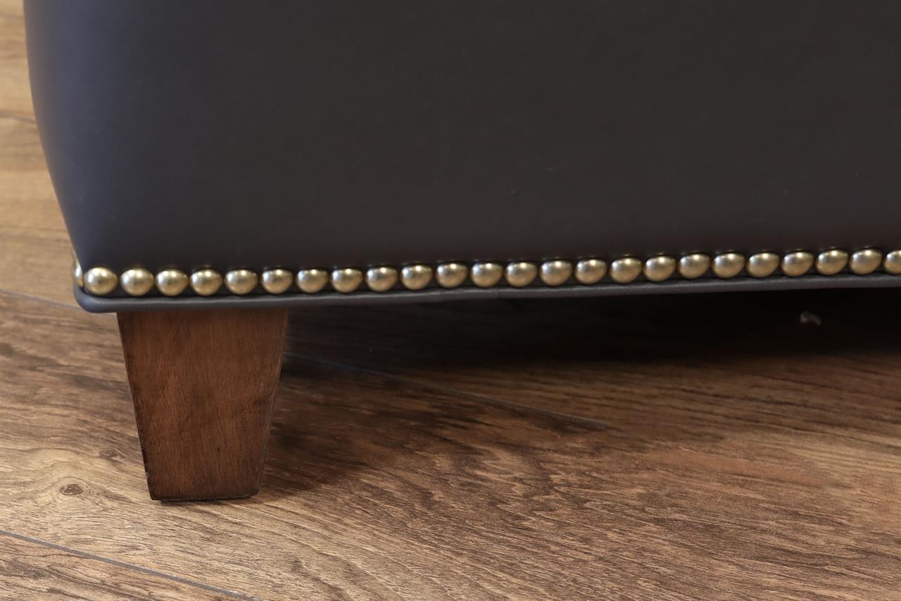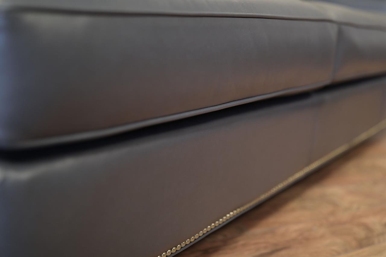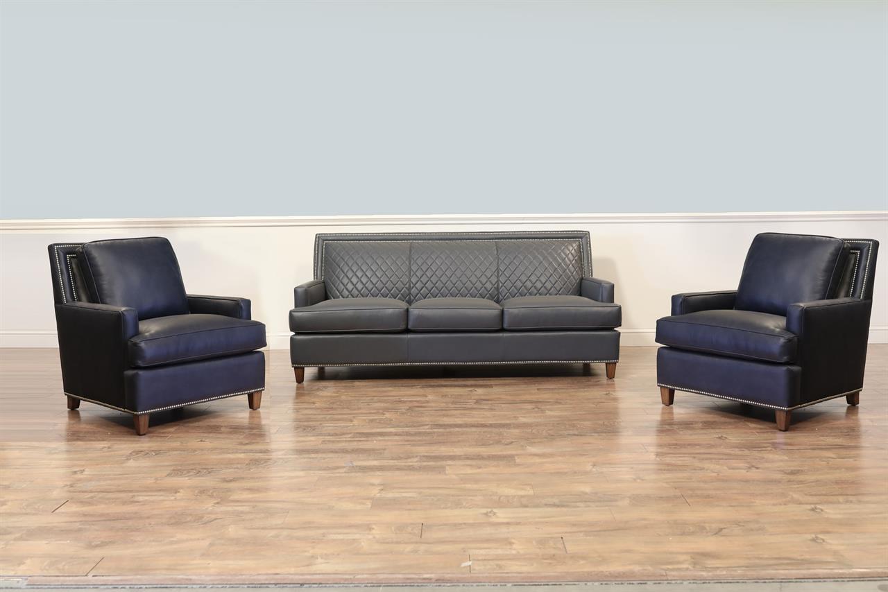 An American-made leather quilted sofa with customizable leather, solid hardwood frames, and nail trim options. This sofa is shown with a medium blue leather, called Nirvana lagoon and an ash color Denmark finished frame. Matching chairs are also available