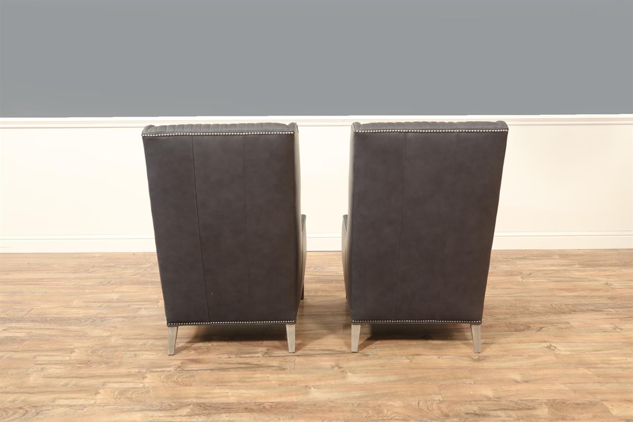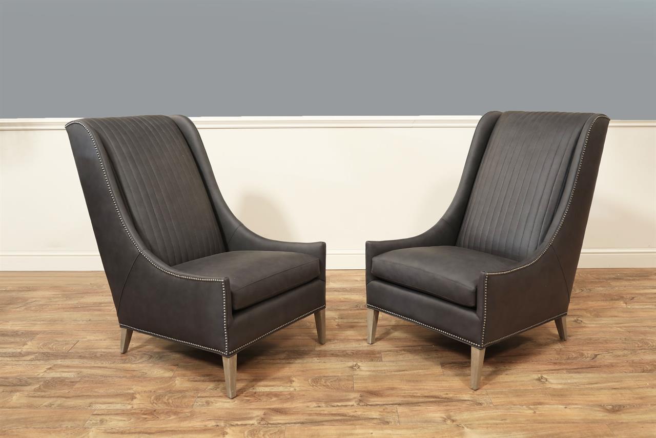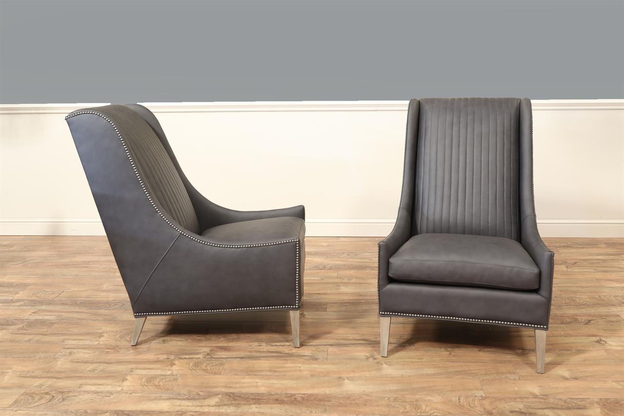 American-made, customizable channel back chairs. These chairs are shown with Juno soft blue leather, driftwood-finished frames, and nail trim. A modern or transitional wing-back chair with low profile and gently curved hip-hugger arms and spade feet.
