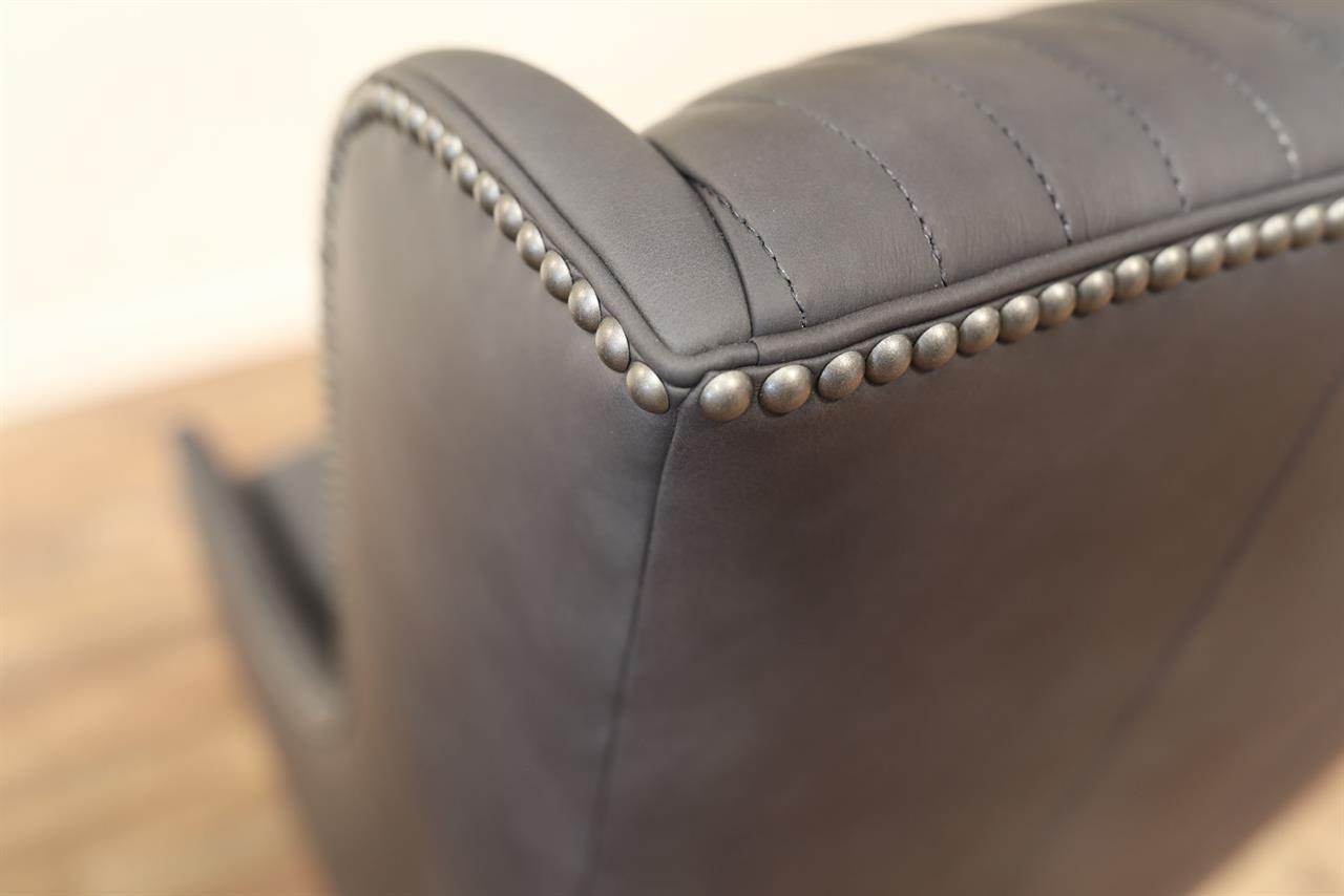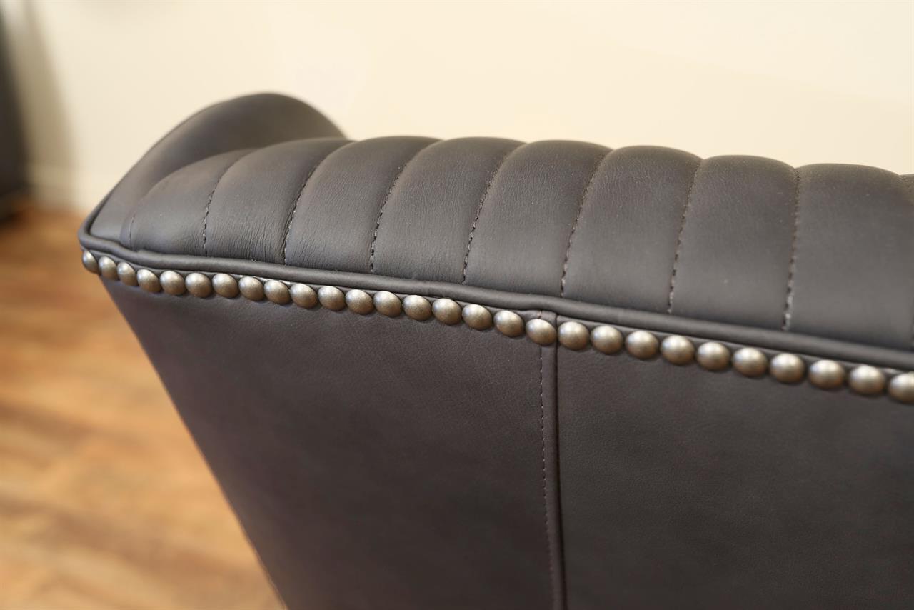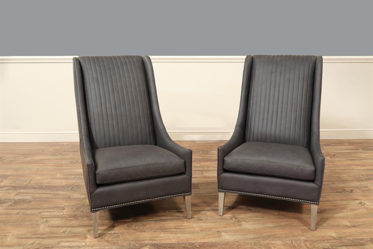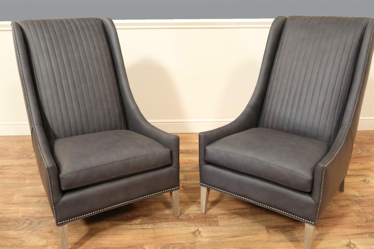 American-made, customizable channel back chairs. These chairs are shown with Juno soft blue leather, driftwood-finished frames, and nail trim. A modern or transitional wing-back chair with low profile and gently curved hip-hugger arms and spade feet.