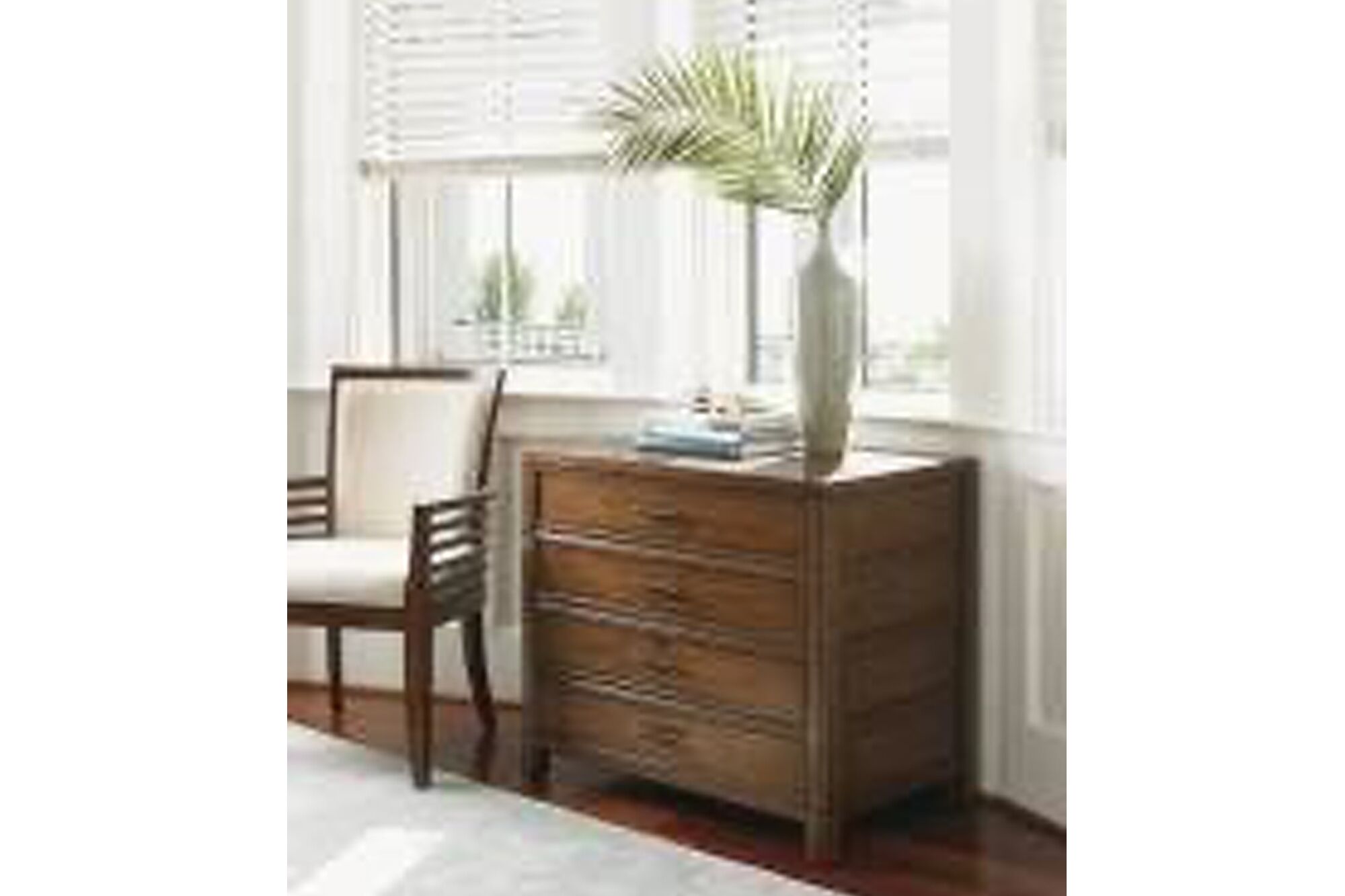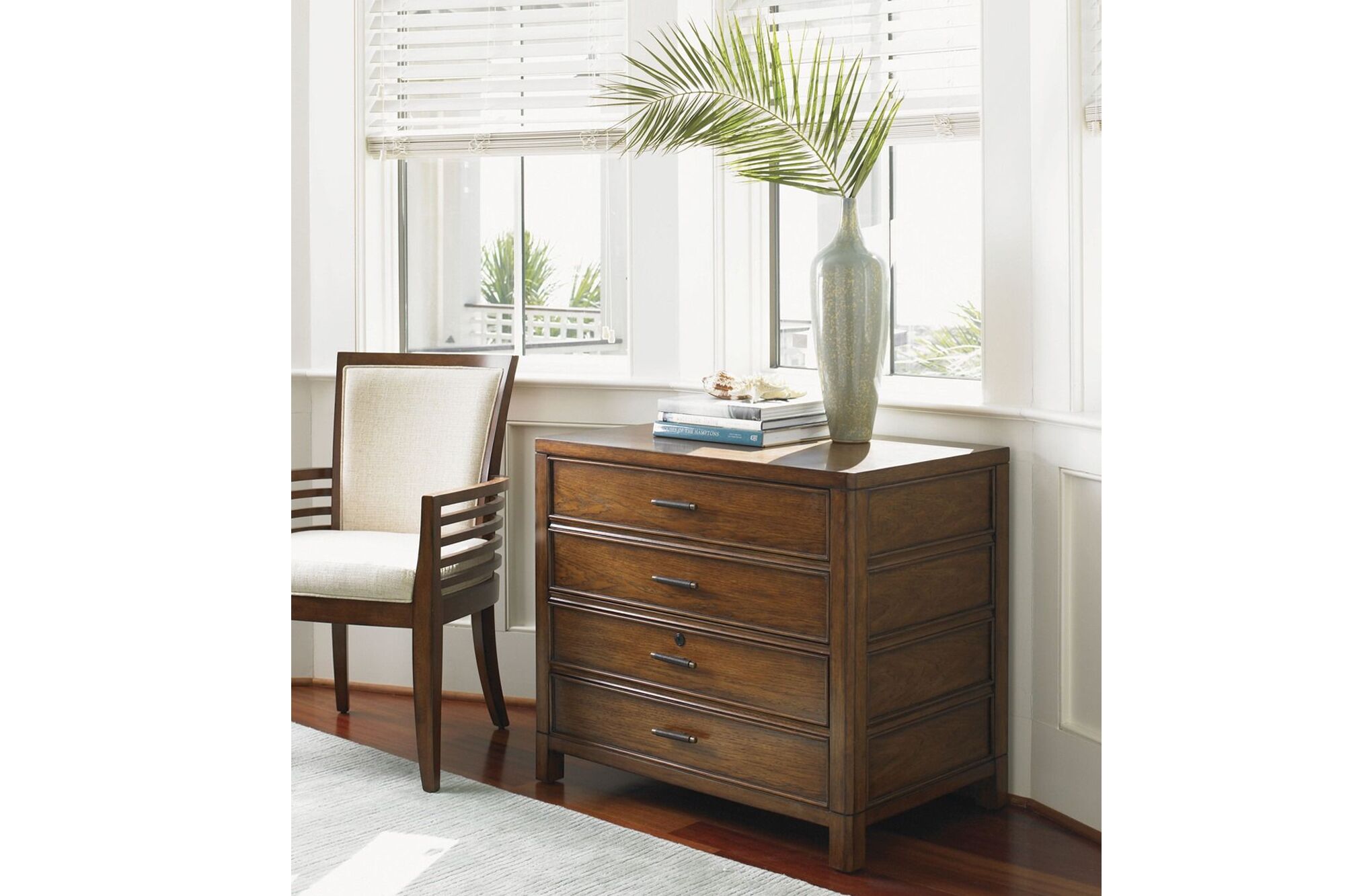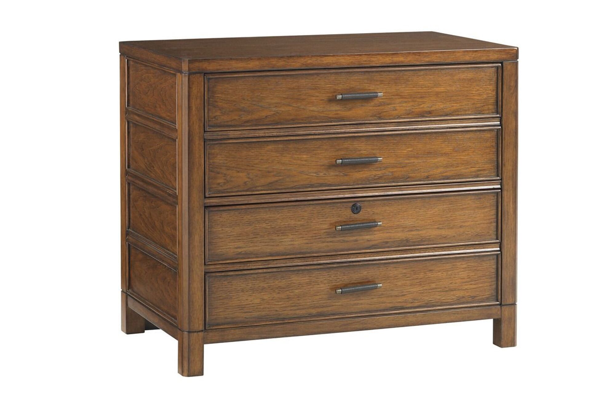 This file chest is finished in hickory and designed with a drawer facade that presents as four drawers with metal and faux leather pulls. The internal configuration consists of two file drawers sized to accommodate letter or legal files. The drawers operate on ball-bearing slides and incorporate an anti-tip mechanism. The bottom file drawer includes a locking feature. The chest is intended for document storage in a residential or office setting where enclosed file organization is required.