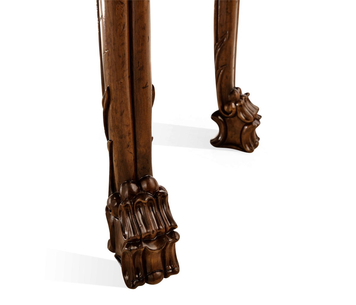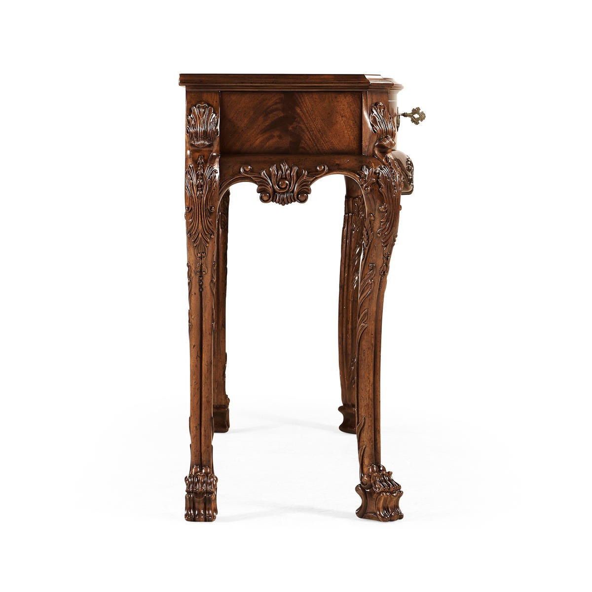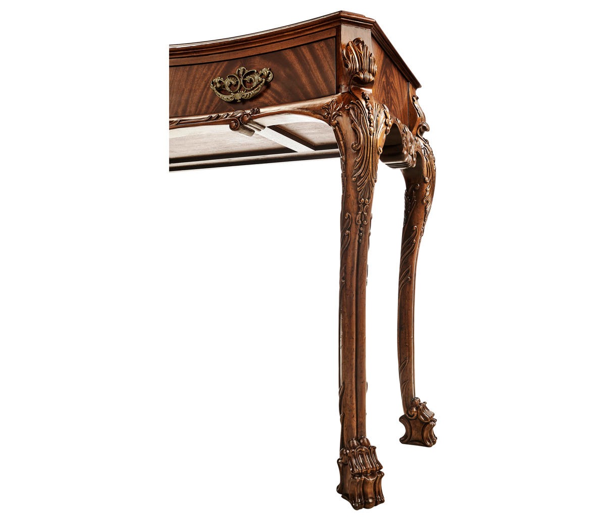 Mahogany veneered rococo-style console with shallow carved floral details, a single long drawer, and four cabriole legs with stylized lion’s paw feet; Traditional execution in medium antique mahogany.