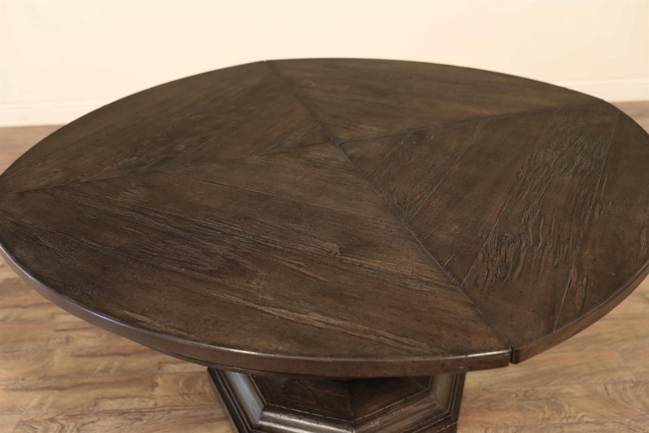 Antique reproduction Jupe dining room table by Jonathan Charles Furniture. This is a high-end expandable wood Jupe table with a universal walnut finish. It has self-storing leaves that expand the table to 74″ round. This table is new in the box, and it is part of a closeout sale. Backorders not available, Jonathan Charles Furniture SKU 491130-59D-DTD.