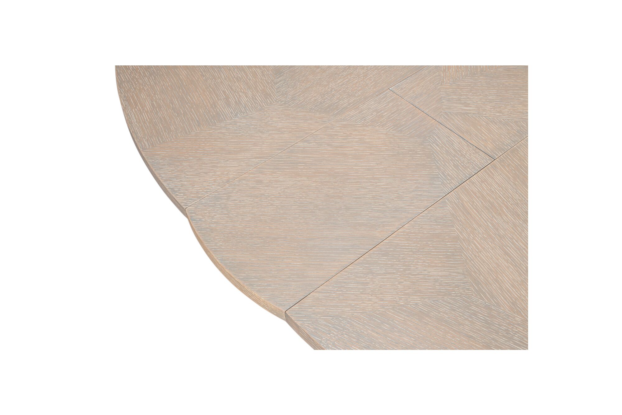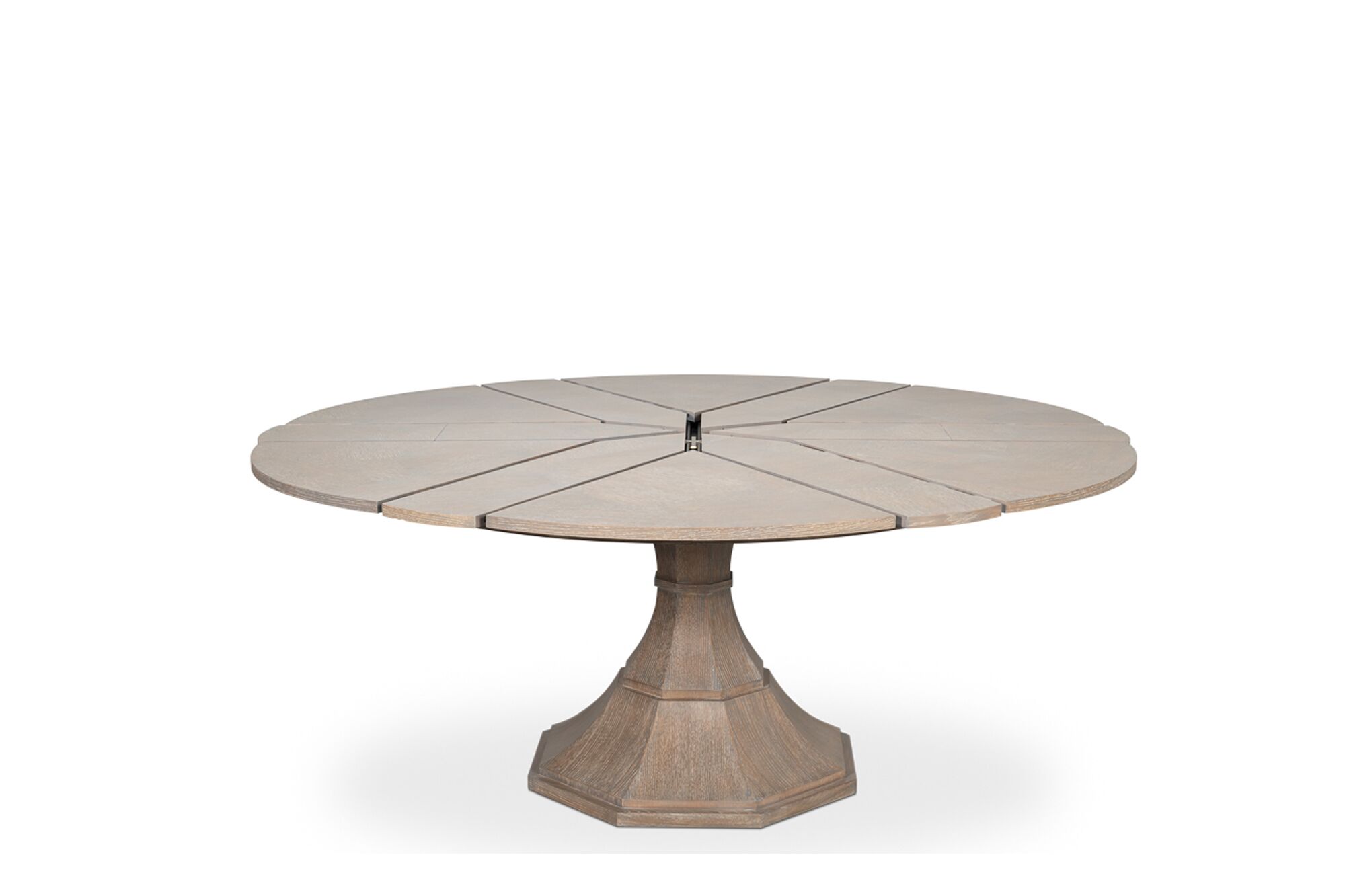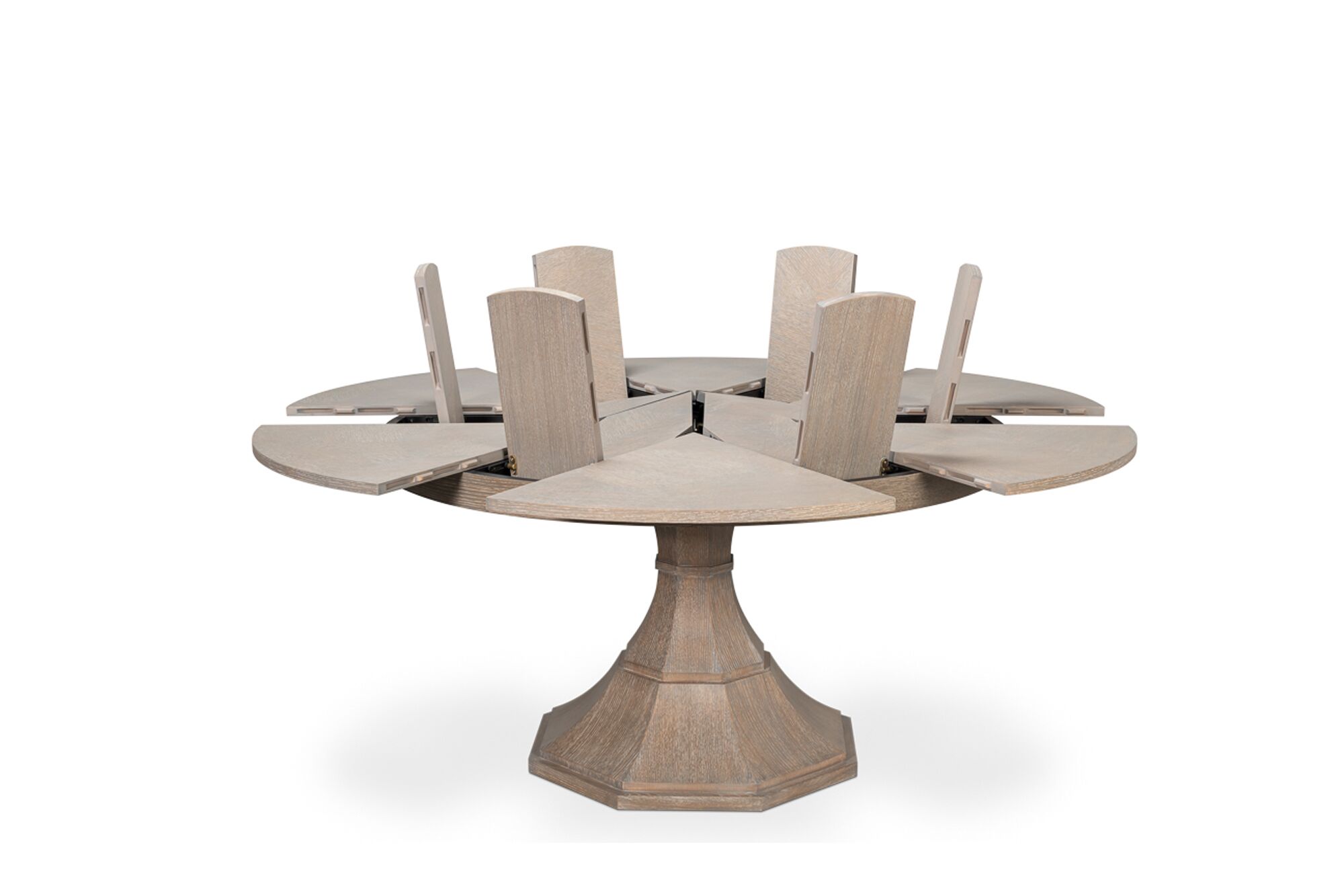 The Giselle Jupe Table exemplifies transitional style. The herringbone marquetry on the top and curved facets of the octagonal base make it a beautiful and functional addition to any dining space. Sarreid”s newly reengineered Jupe Dining Tables bring a timeless 19th-century innovation into the modern age. Featuring a self-storing expansion mechanism crafted from extruded aluminum , these tables expand effortlessly, providing both smooth operation and simplified assembly.
