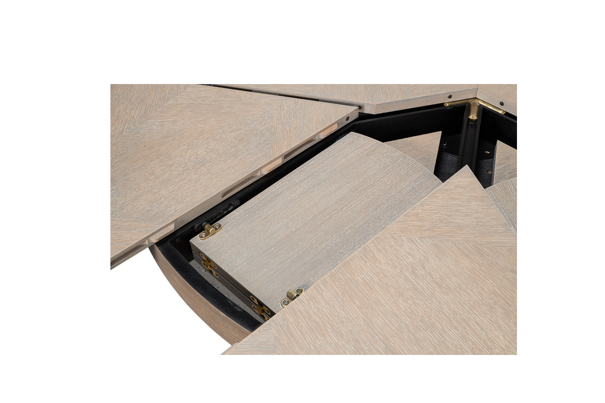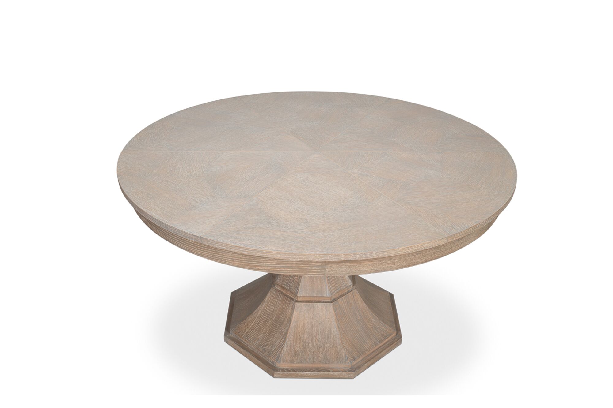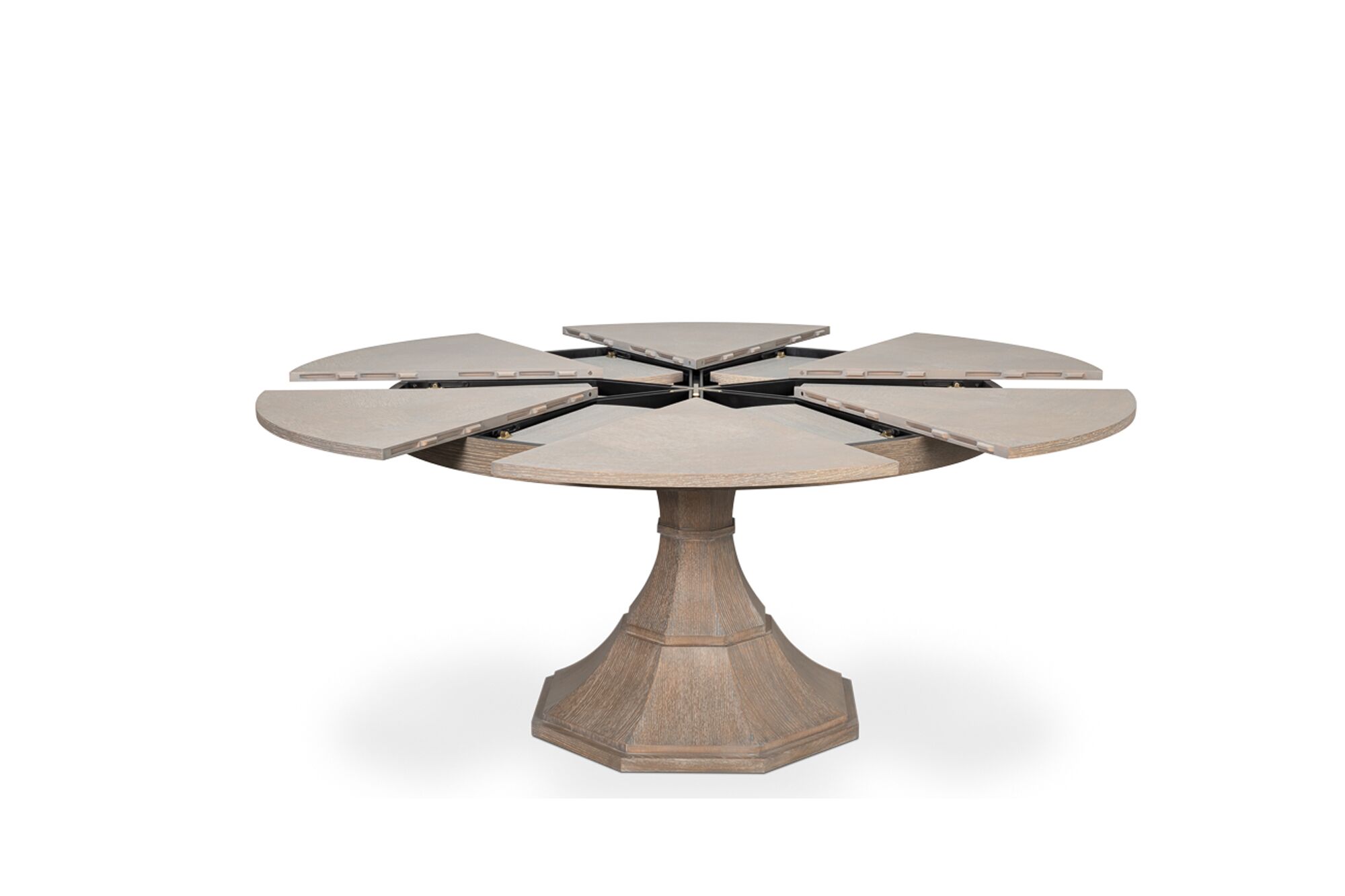 The Giselle Jupe Table exemplifies transitional style. The herringbone marquetry on the top and curved facets of the octagonal base make it a beautiful and functional addition to any dining space. Sarreid”s newly reengineered Jupe Dining Tables bring a timeless 19th-century innovation into the modern age. Featuring a self-storing expansion mechanism crafted from extruded aluminum , these tables expand effortlessly, providing both smooth operation and simplified assembly.