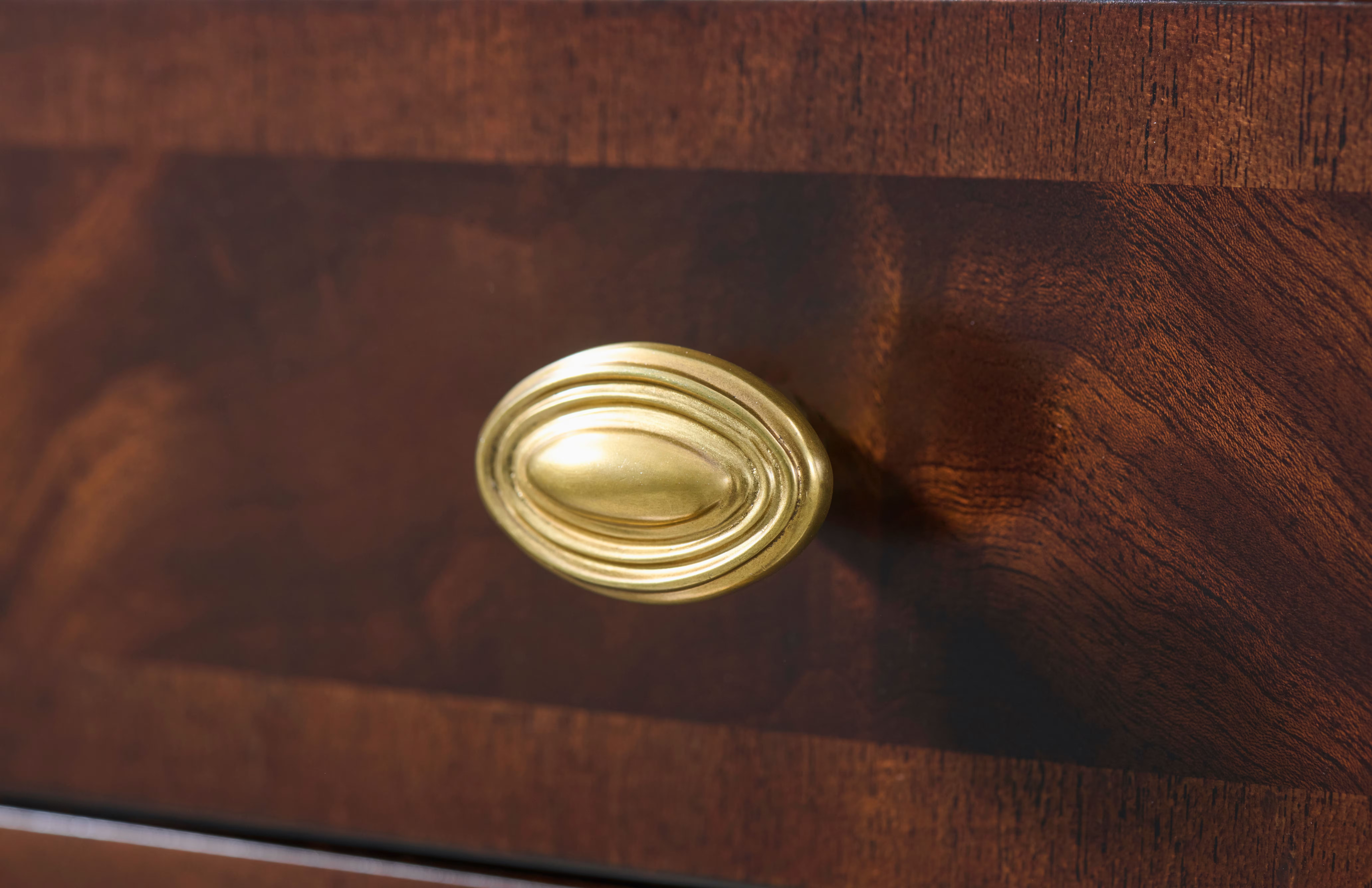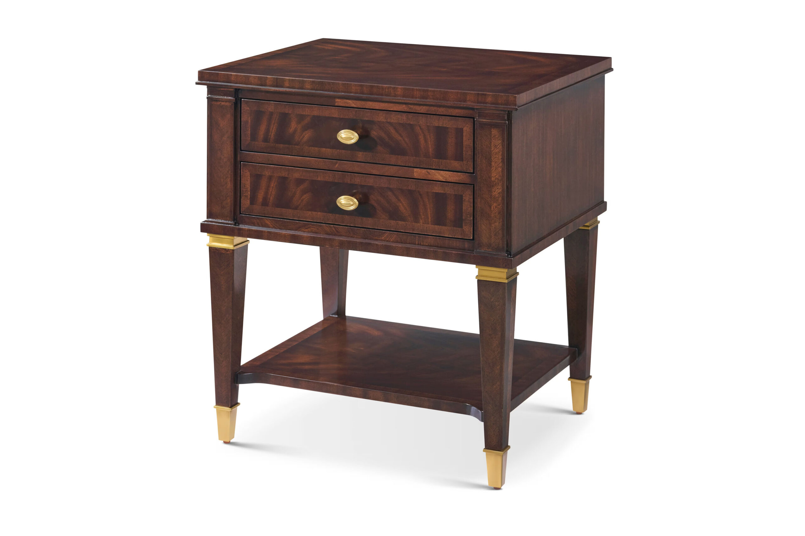 A nightstand constructed in khaya swirl veneer, featuring a rectangular tabletop above a dual-drawer configuration. The case includes two pull-out drawers arranged beneath the top, each fitted with oval-shaped brass pulls in a Hampton finish. Below the drawers is an open lower shelf, providing additional storage within the compact form. The nightstand is supported by legs fitted with brass ferrules, introducing a defined base element. The combination of enclosed drawers and an open shelf creates a layered storage layout. This format is suited for bedside use where both concealed and open storage are required.