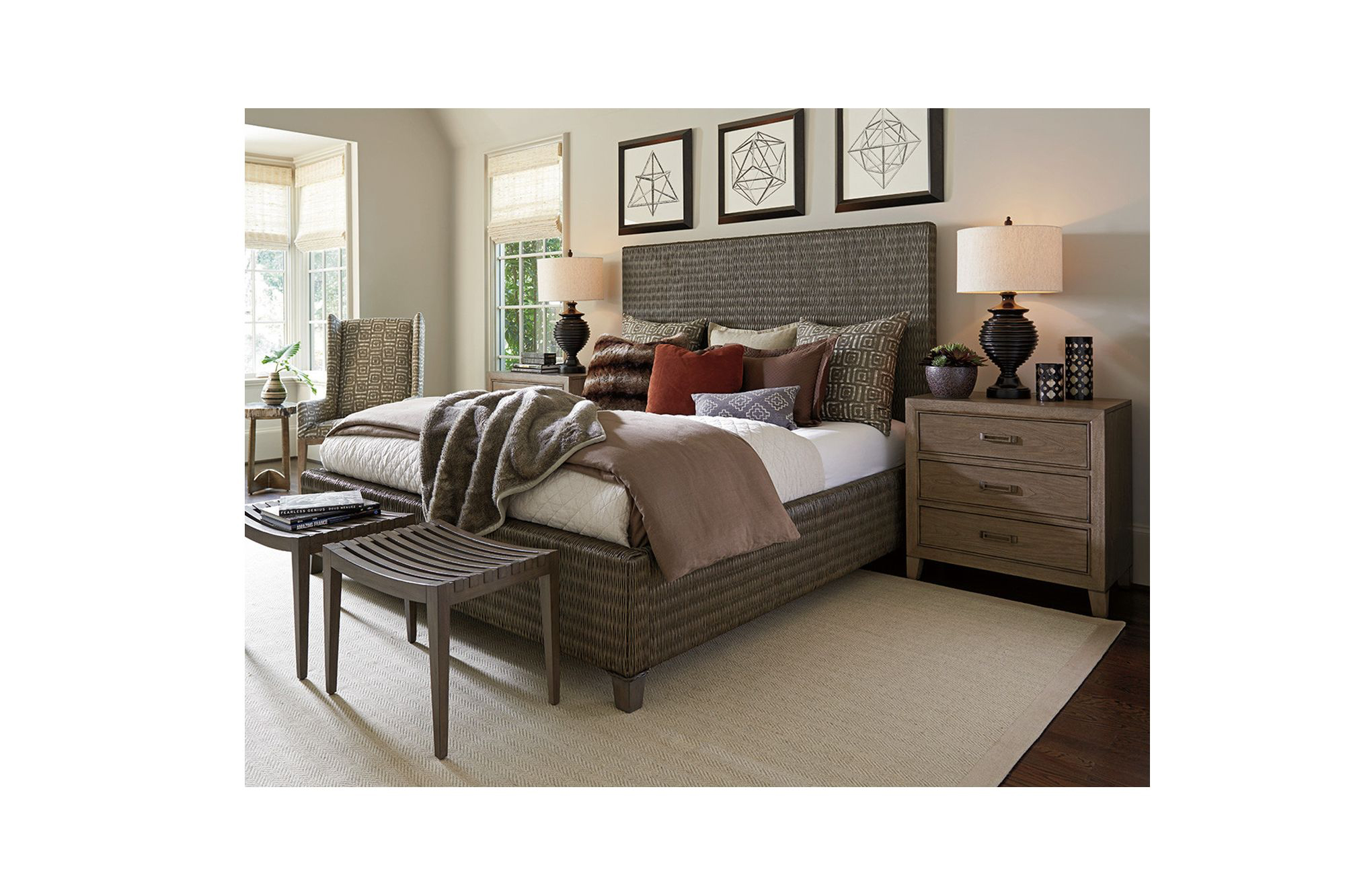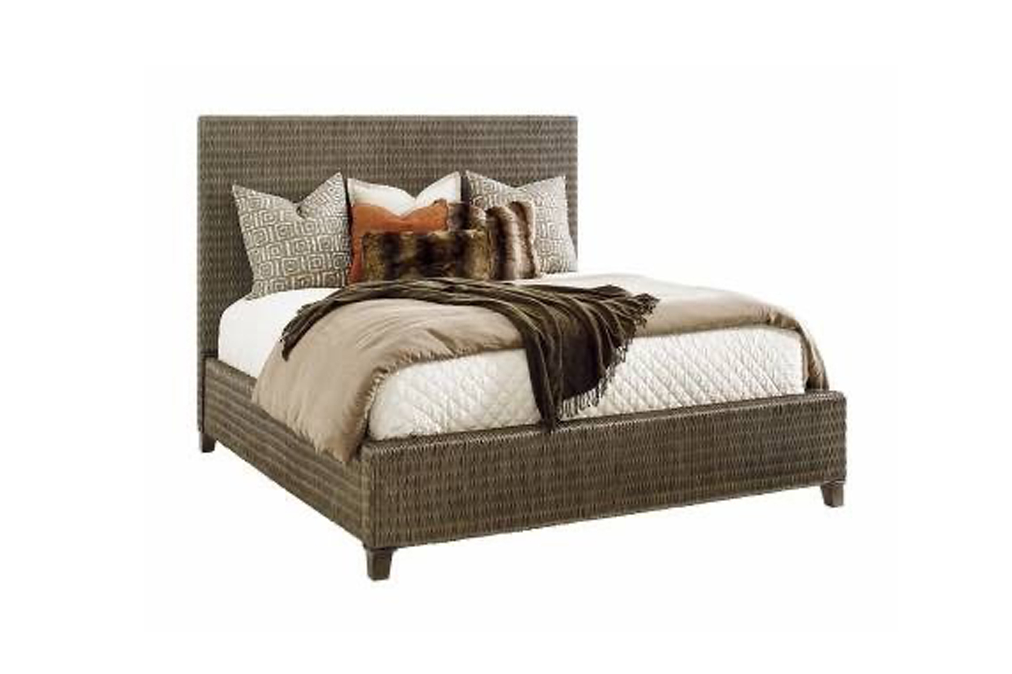 This king-size platform bed includes a headboard, footboard, side rails, and a wood frame. The headboard, footboard, and side rails are constructed from woven rattan in an elongated v-weave pattern and finished in smoke gray, a dark pewter gray tone. The exposed feet are constructed of wood. The woven rattan design is applied consistently across all visible bed components. The bed is designed for use with a king-size mattress. Box springs are required for proper use.