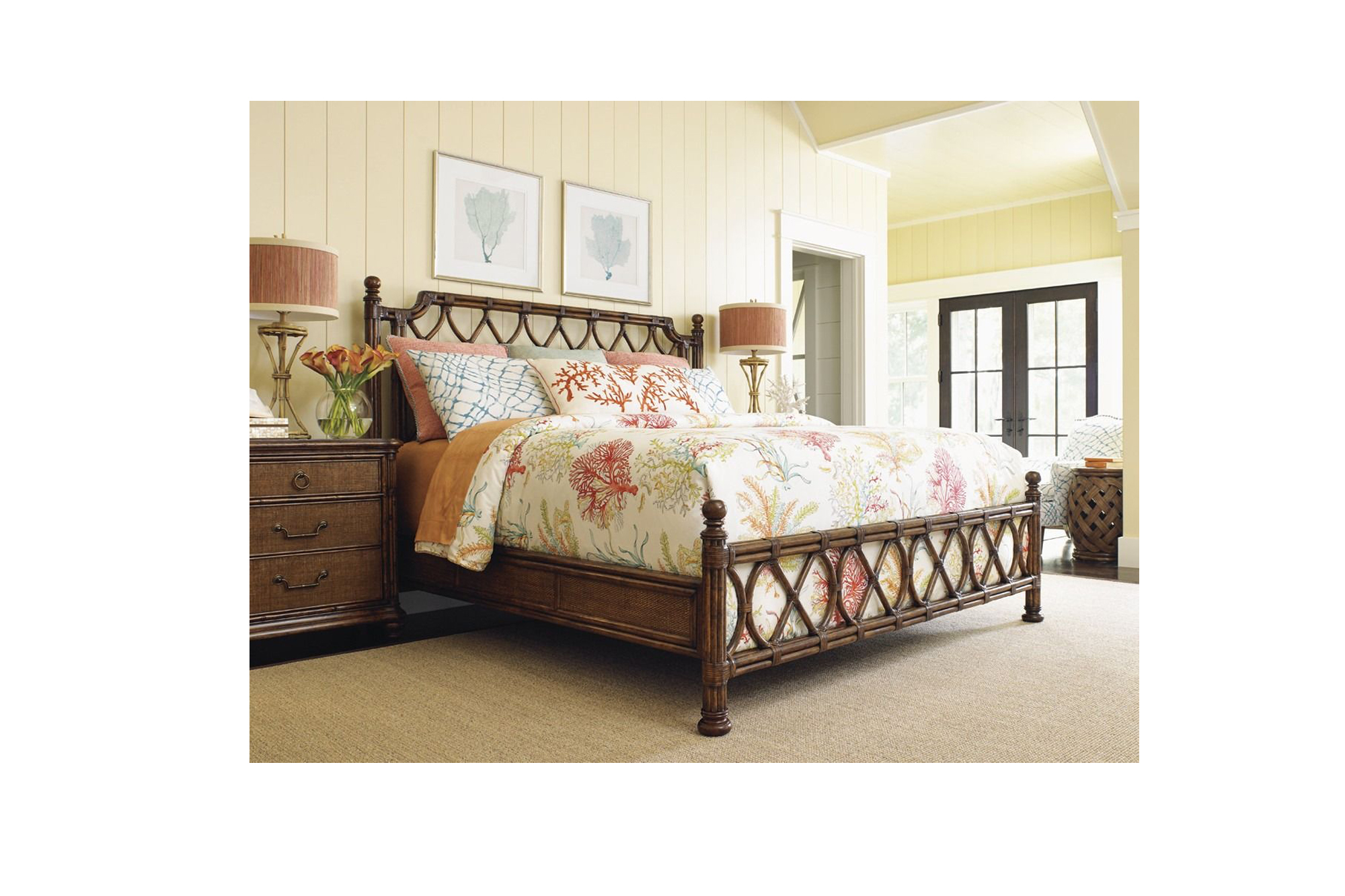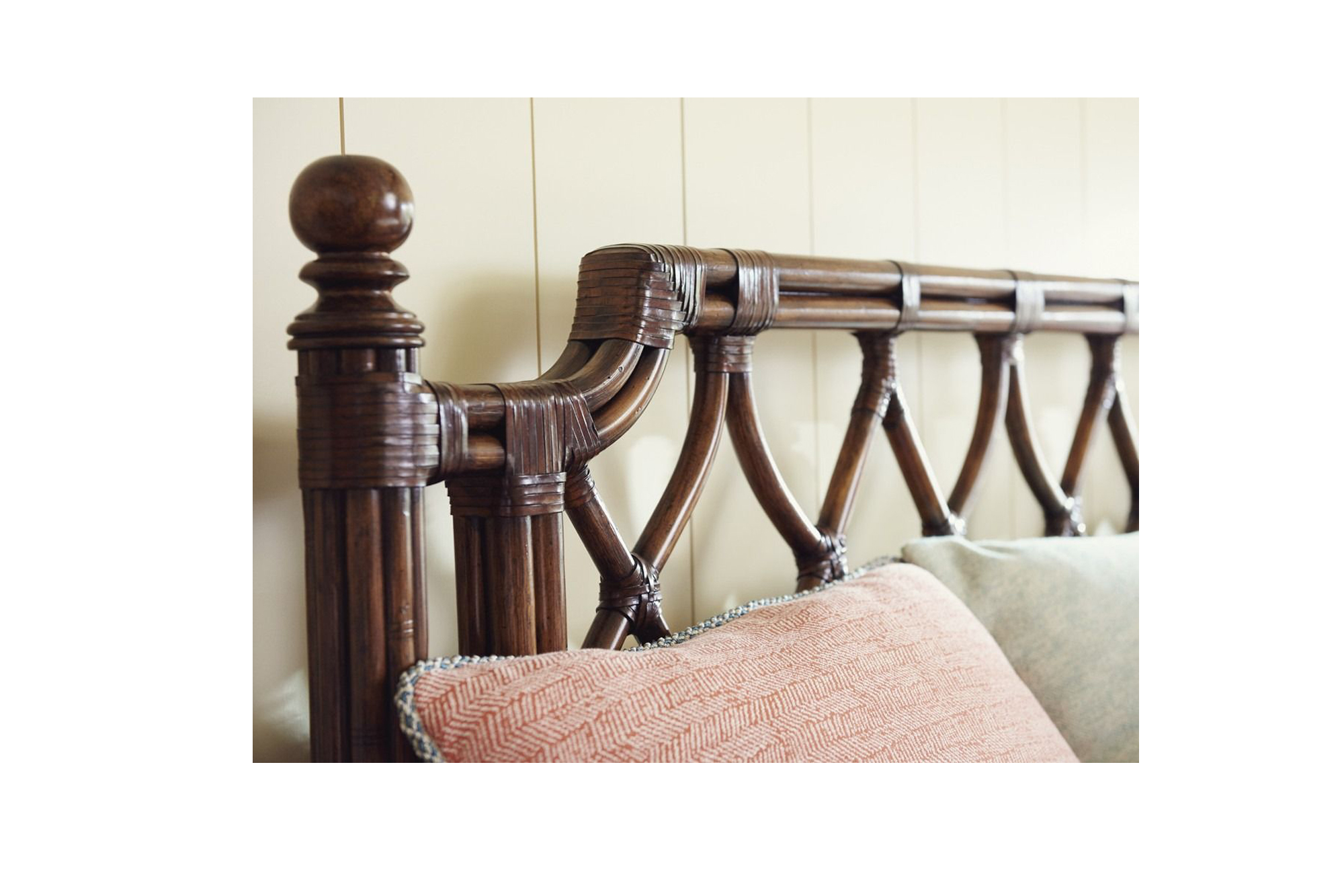 This king-size rattan bed includes a headboard, footboard, side rails, and a woven rattan frame. The headboard and footboard are constructed with bent rattan wrapped in leather. The side rails incorporate woven raffia panels framed by bamboo carvings. The bed is designed for use with a king-size mattress. A headboard-only configuration is also available and is specified for use with a metal frame. The bed is intended for residential bedroom use, where a woven rattan bed structure or headboard-only option is required.