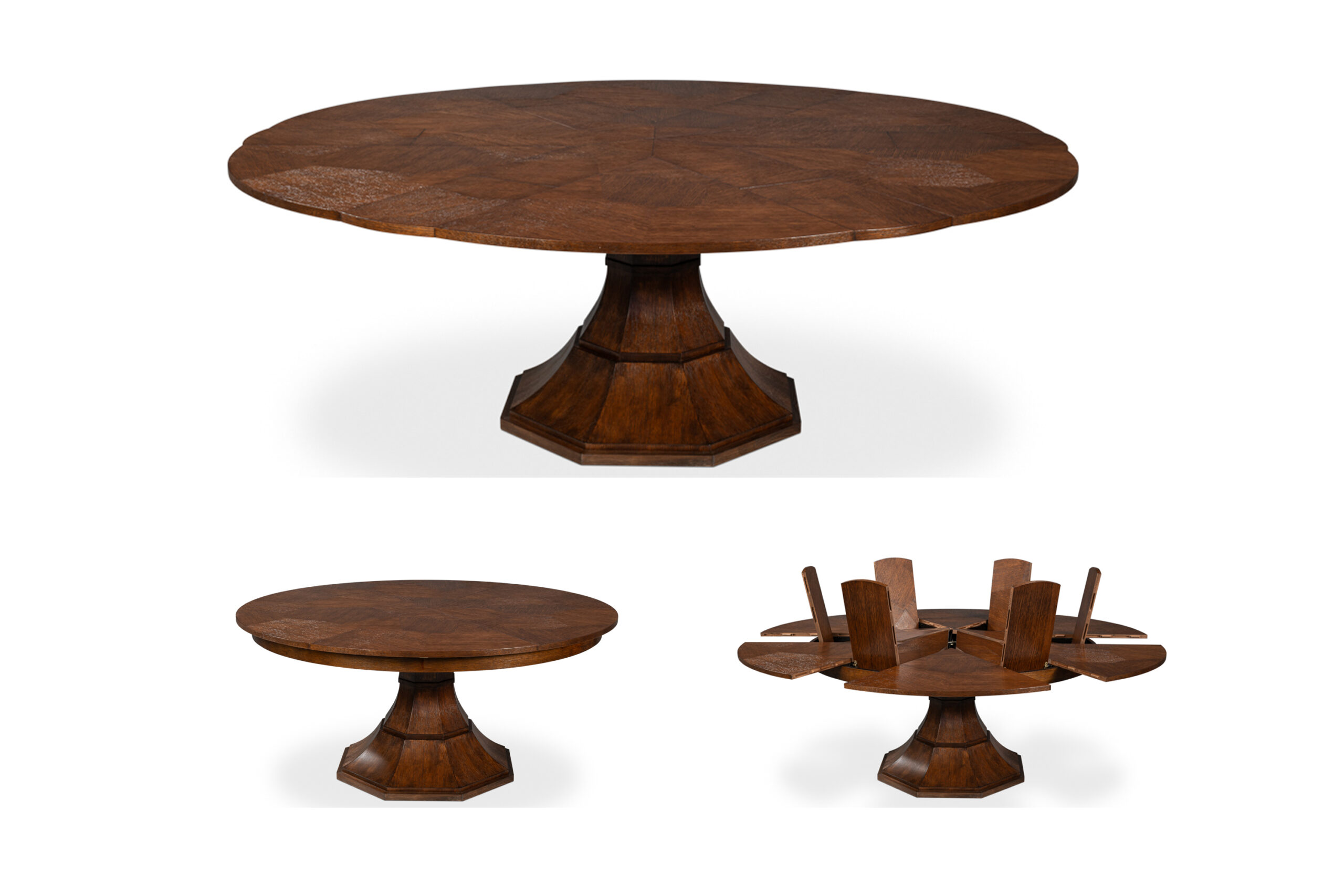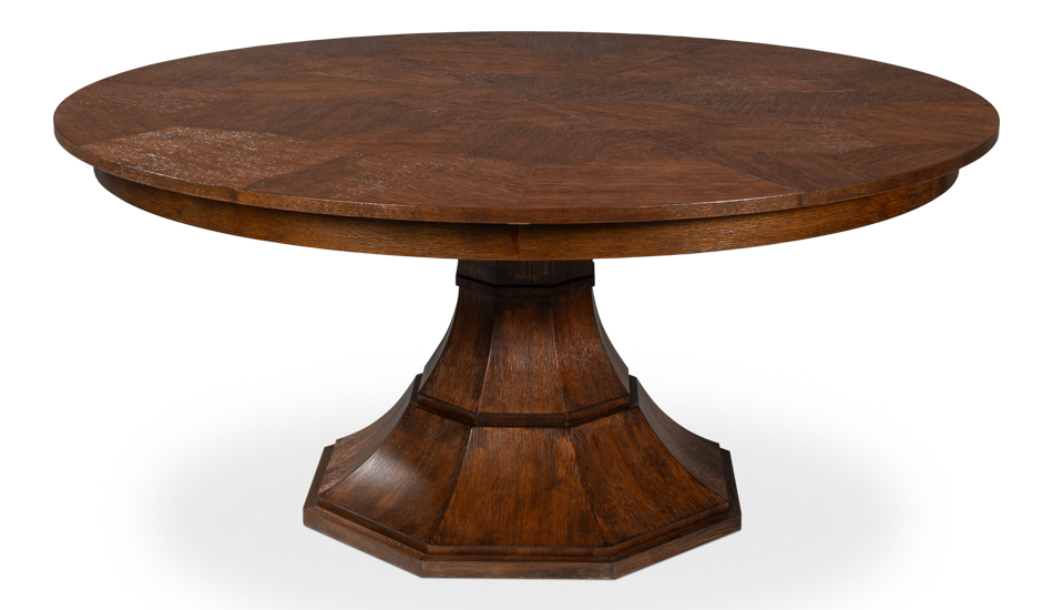 Expandable round to round Jupe table with self-storing leaves. A contemporary pedestal table for the dining room. This table can be used from 66 to 86 inches round and will seat 6-10 people. This table has a rich, dark brown finish. Measurements: 66″ Round to 86″ Round, 30″ High