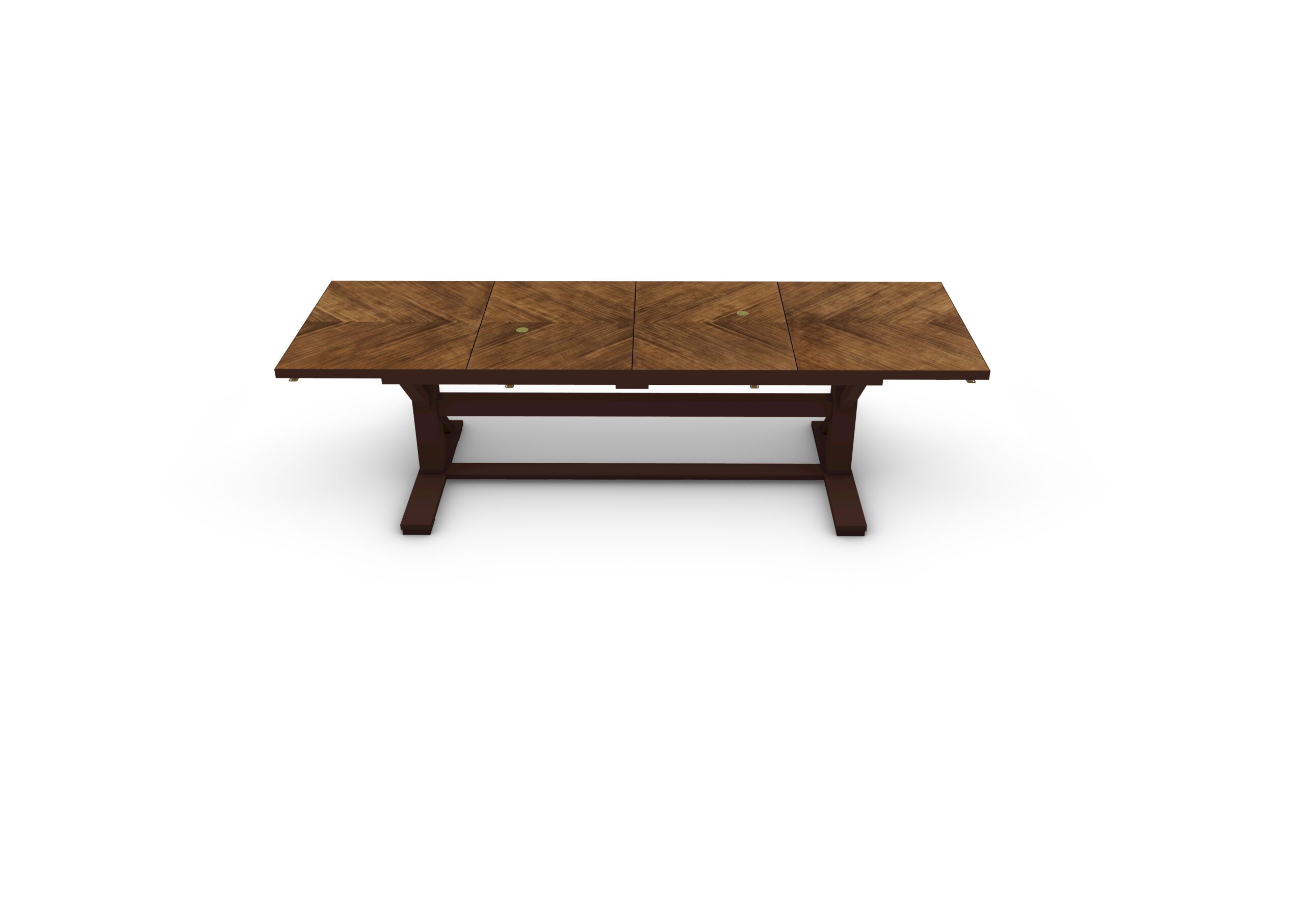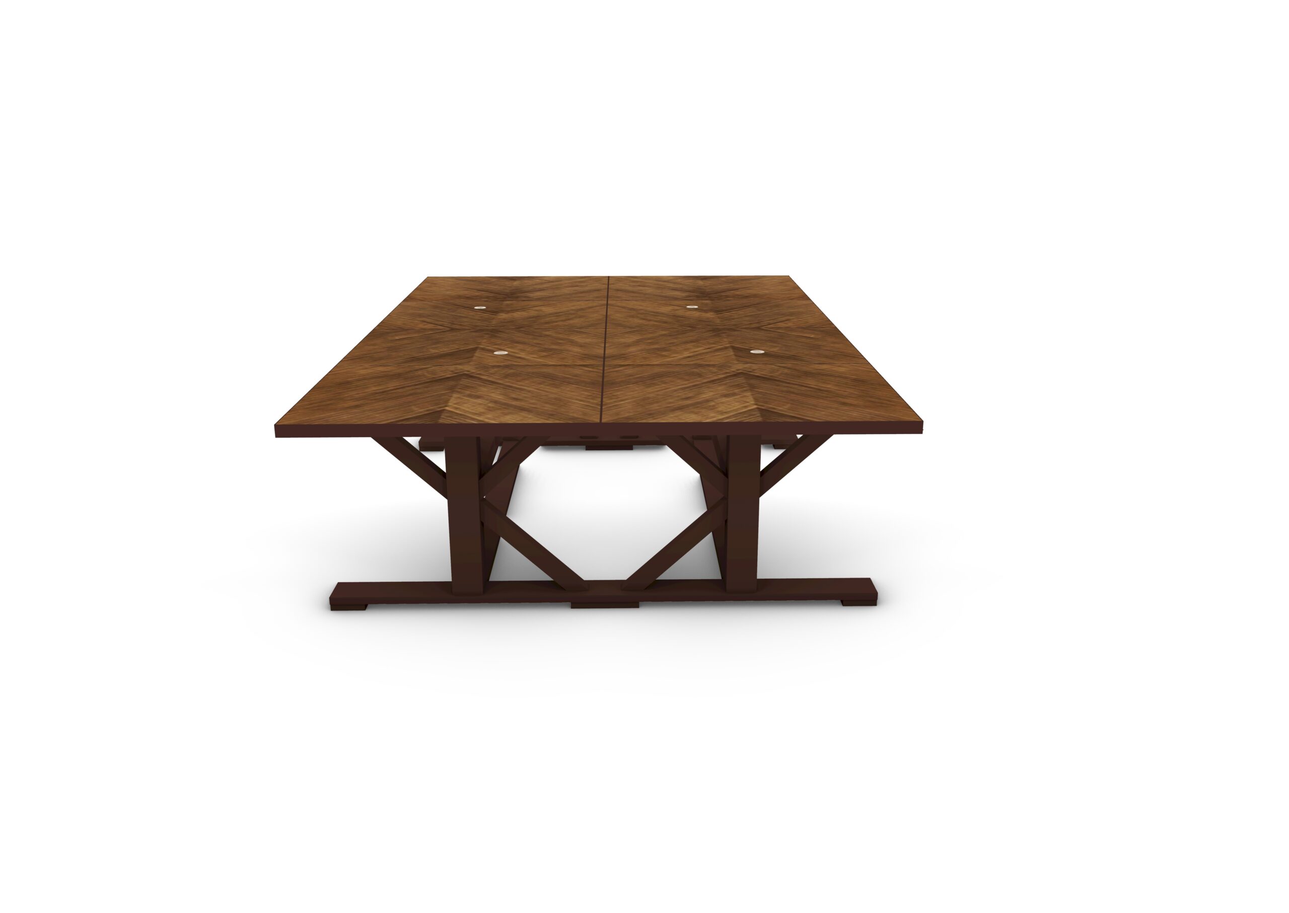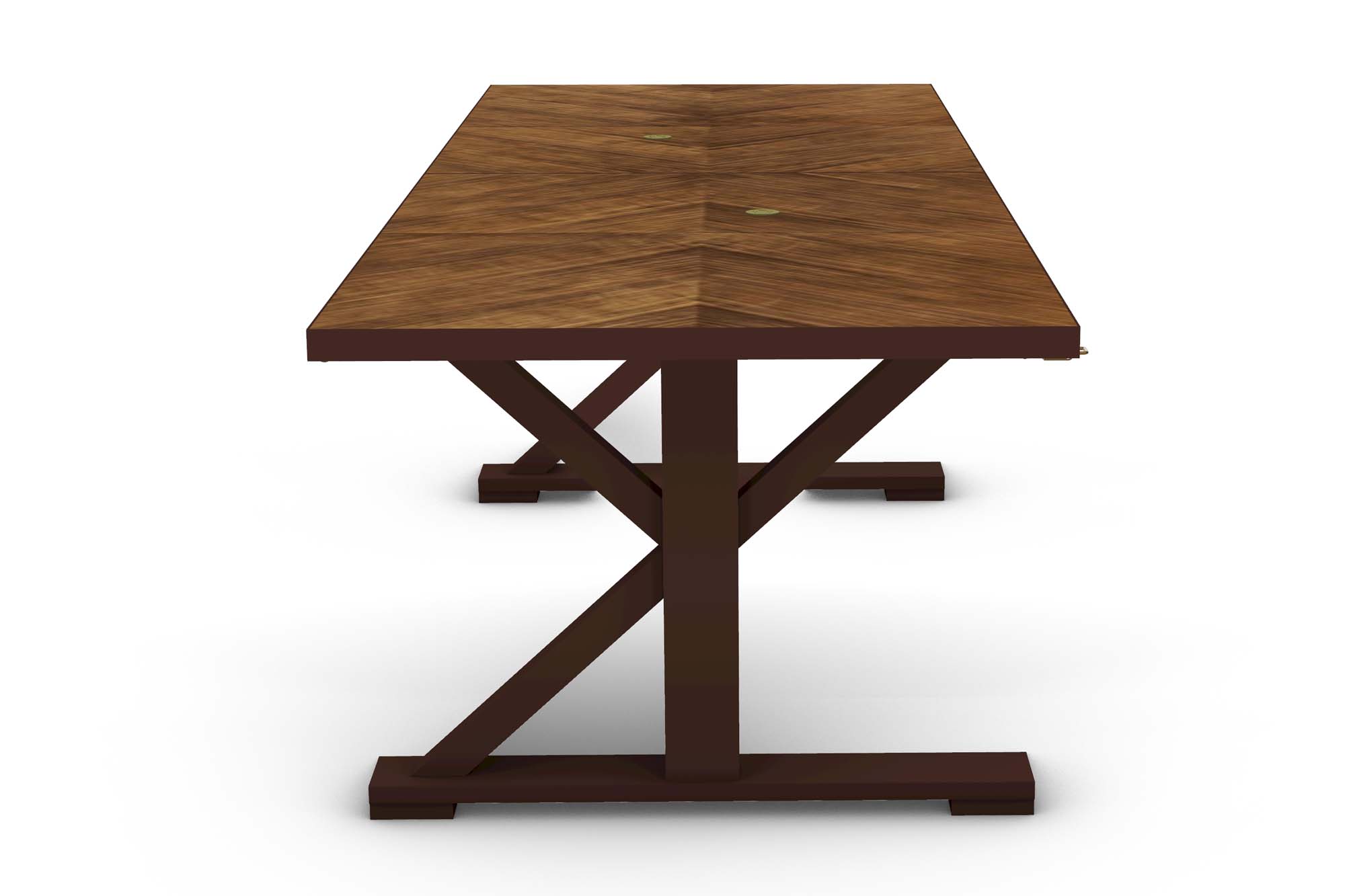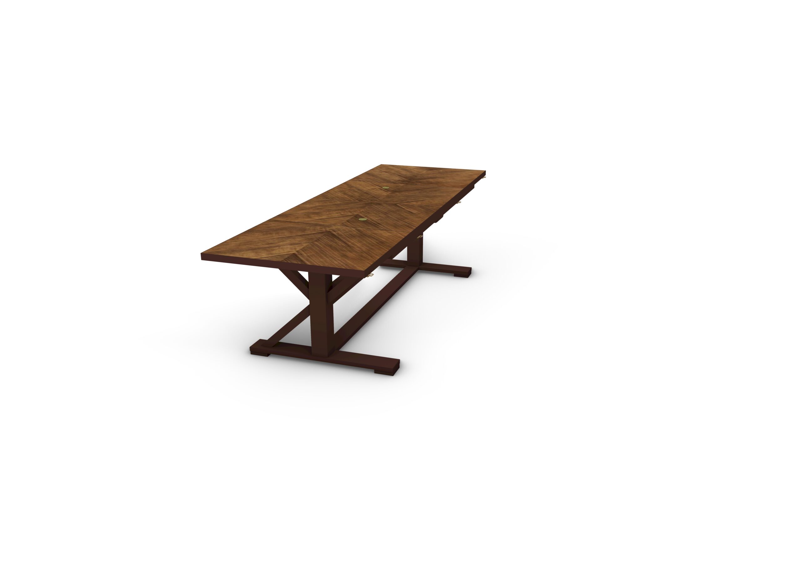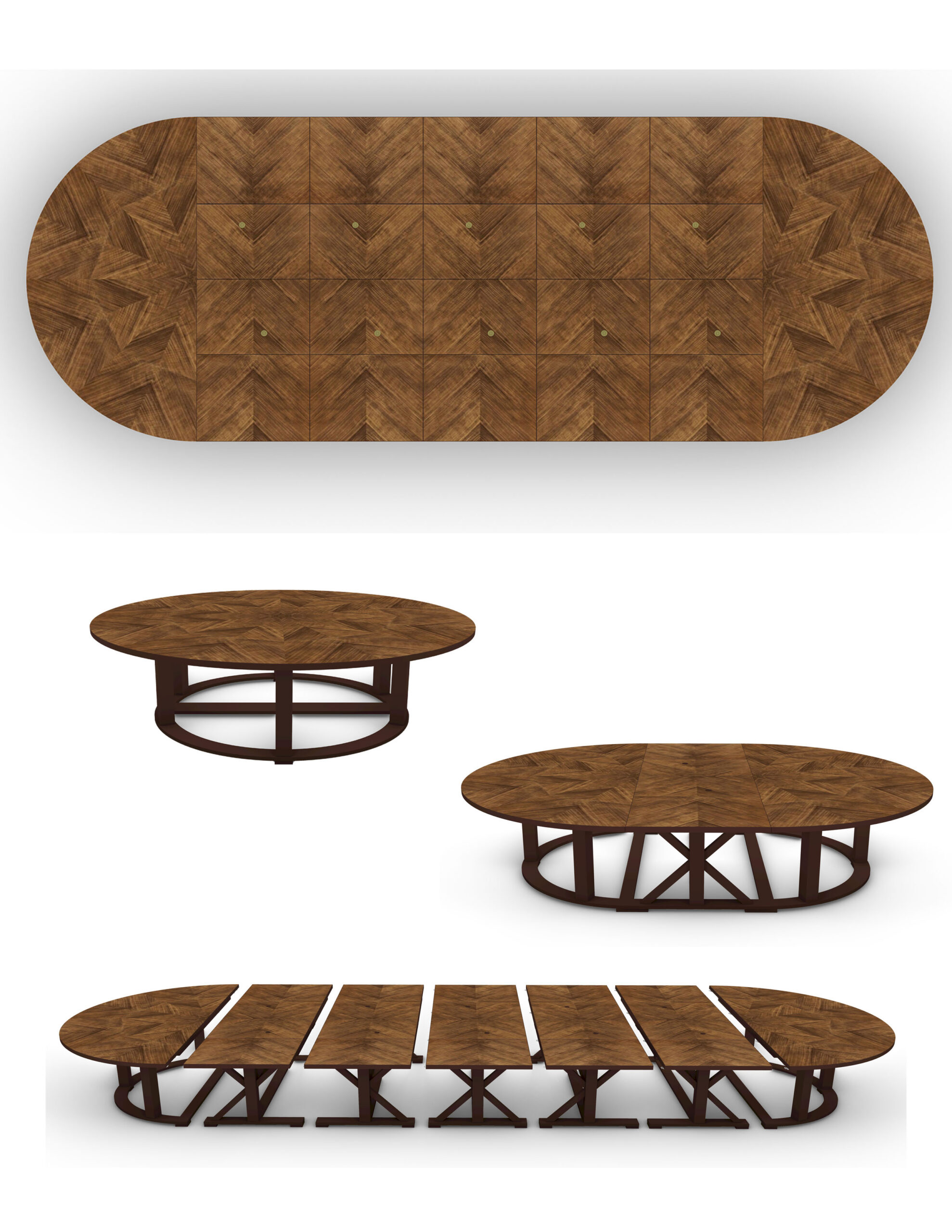 A modular dining table system constructed in Lauro Preto, designed for large-scale rooms and flexible configurations. The system consists of individual trestle tables, demilune sections, and console components that can be combined to form a 9-foot round table or extended into large oval or rectangular arrangements. The top surfaces feature geometric parquetry veneer layouts, aligned across sections for visual continuity when assembled. Bases are offered in both X and K trestle configurations, allowing variation in structural rhythm and support distribution depending on the number of sections used. Components join using concealed compression hardware, with integrated levelers at the feet and connection points to maintain alignment across extended spans. Access ports are incorporated for wire management where required. The construction in dense Lauro Preto is suited for durability, with a protective glazed finish applied across surfaces. The system expands in 36-inch increments using additional sections.This product page is for the K console component