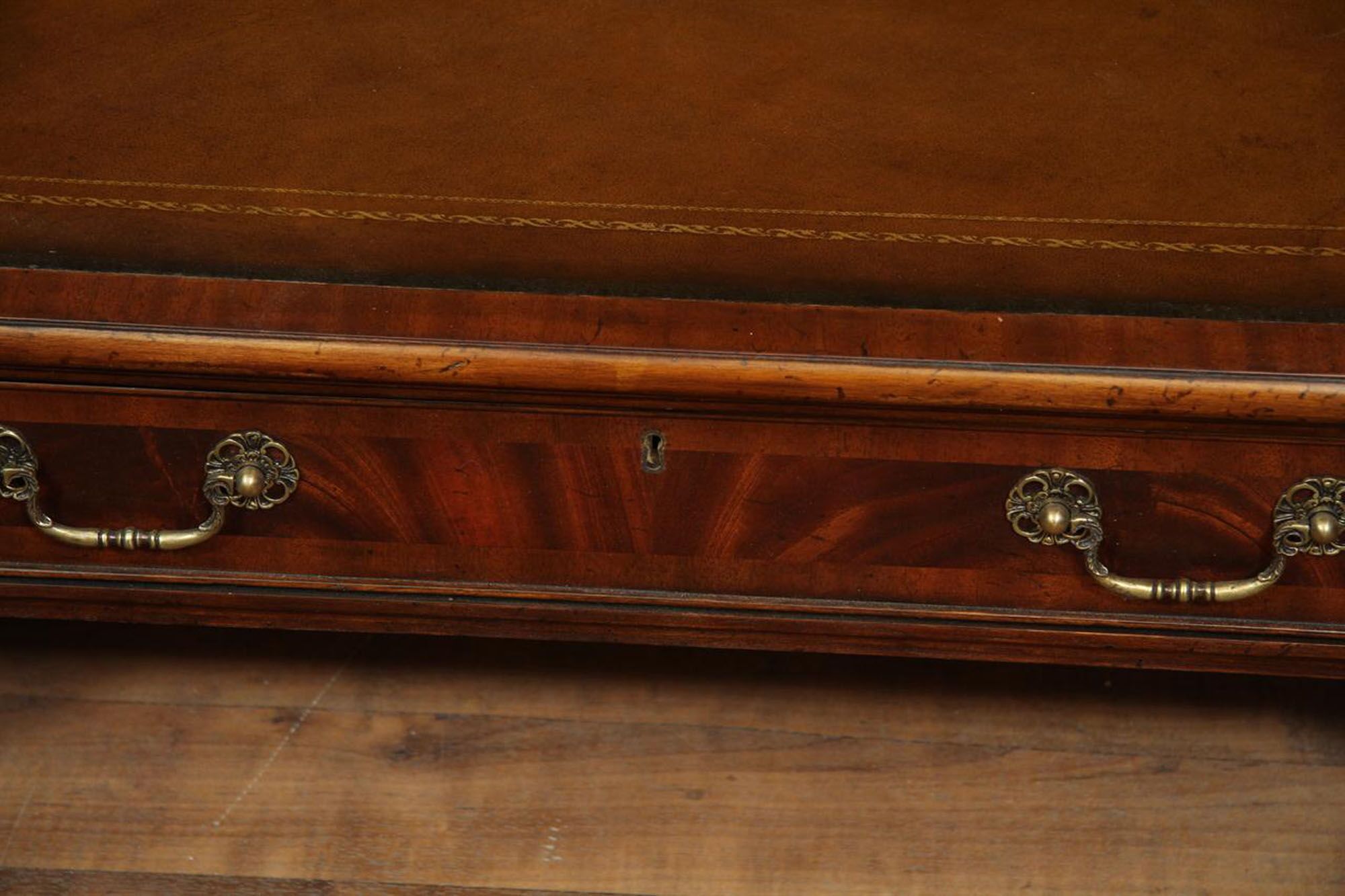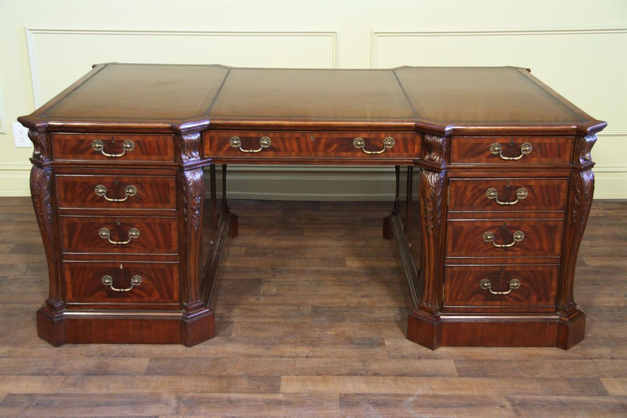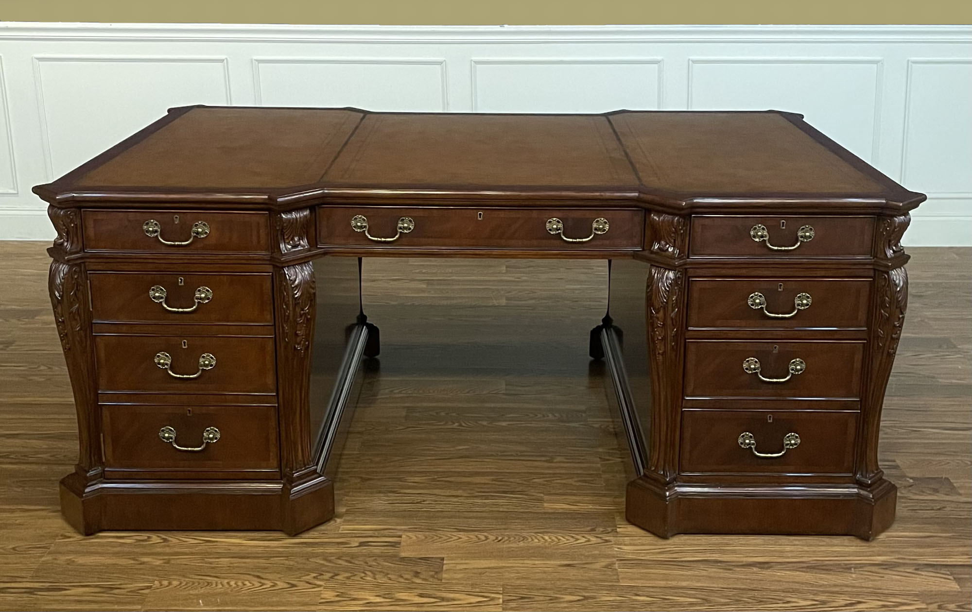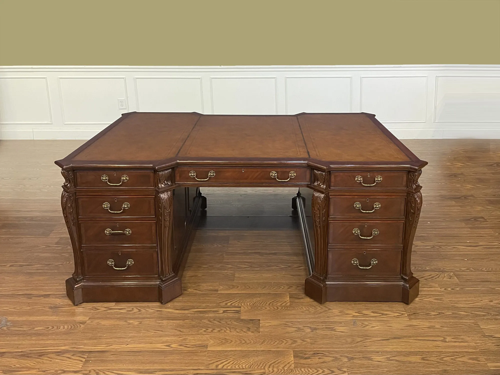 Large pedestal desk with gilt-tooled leather top and plinth base. Carved architectural protruding corners flanking a generous knee-hole and center pencil drawer. This pedestal desk has a filing cabinet on one side and a hinged door on the other, revealing an enclosed and shelved storage area. Manufactured with traditional dovetailed solid oak drawers and a light factory distressed brown mahogany finish. The pedestals are decorated with paneled crotch mahogany. A new, designer-grade partners desk for the traditional home office.