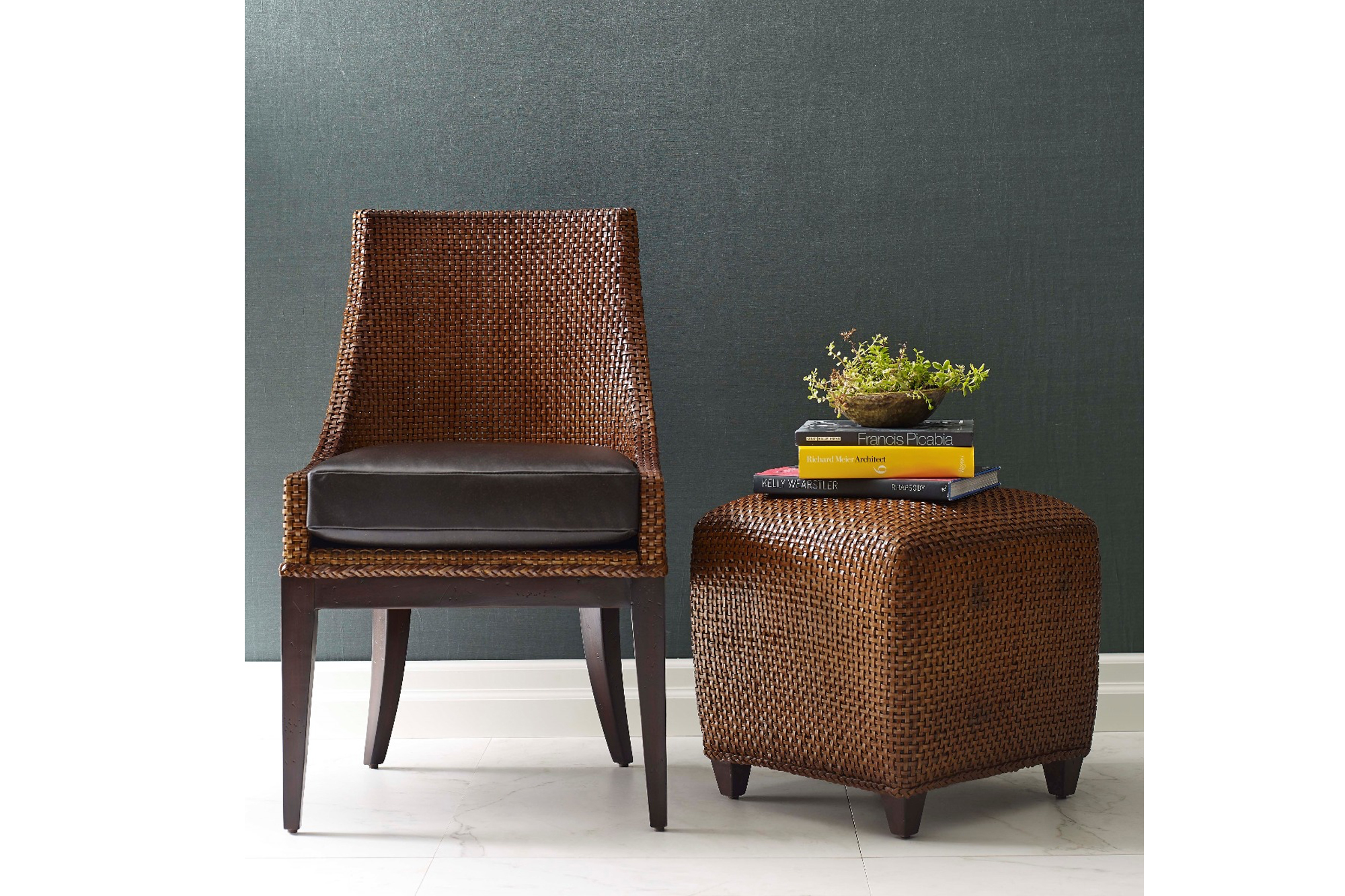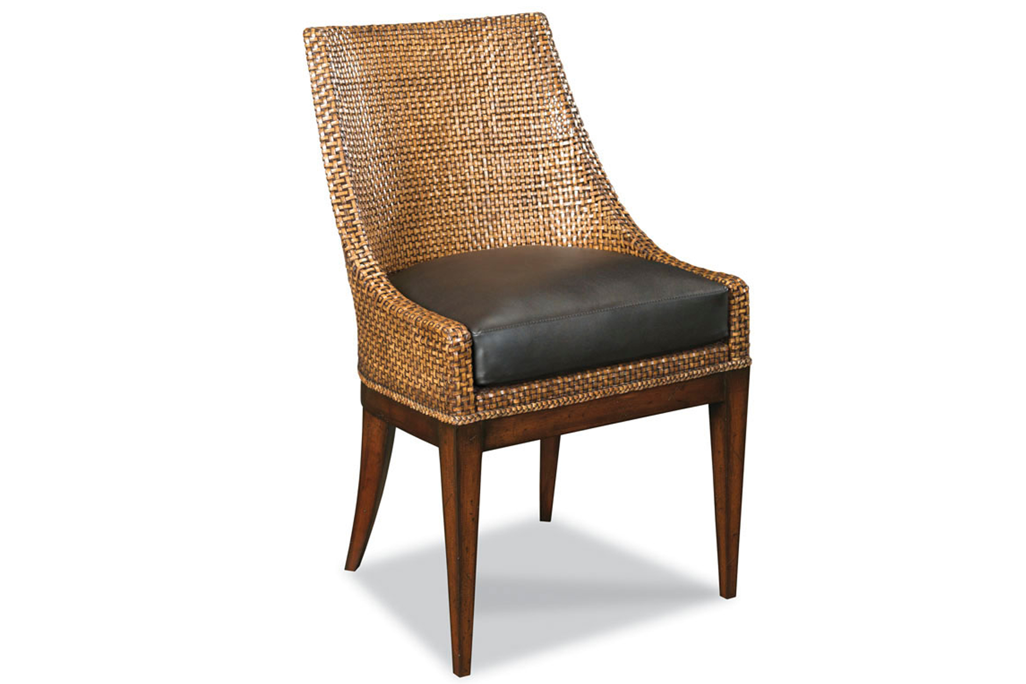 A pleasing, transitionally designed chair features a curved back woven with fine leather. A leather upholstered seat rests above gently tapering posts.