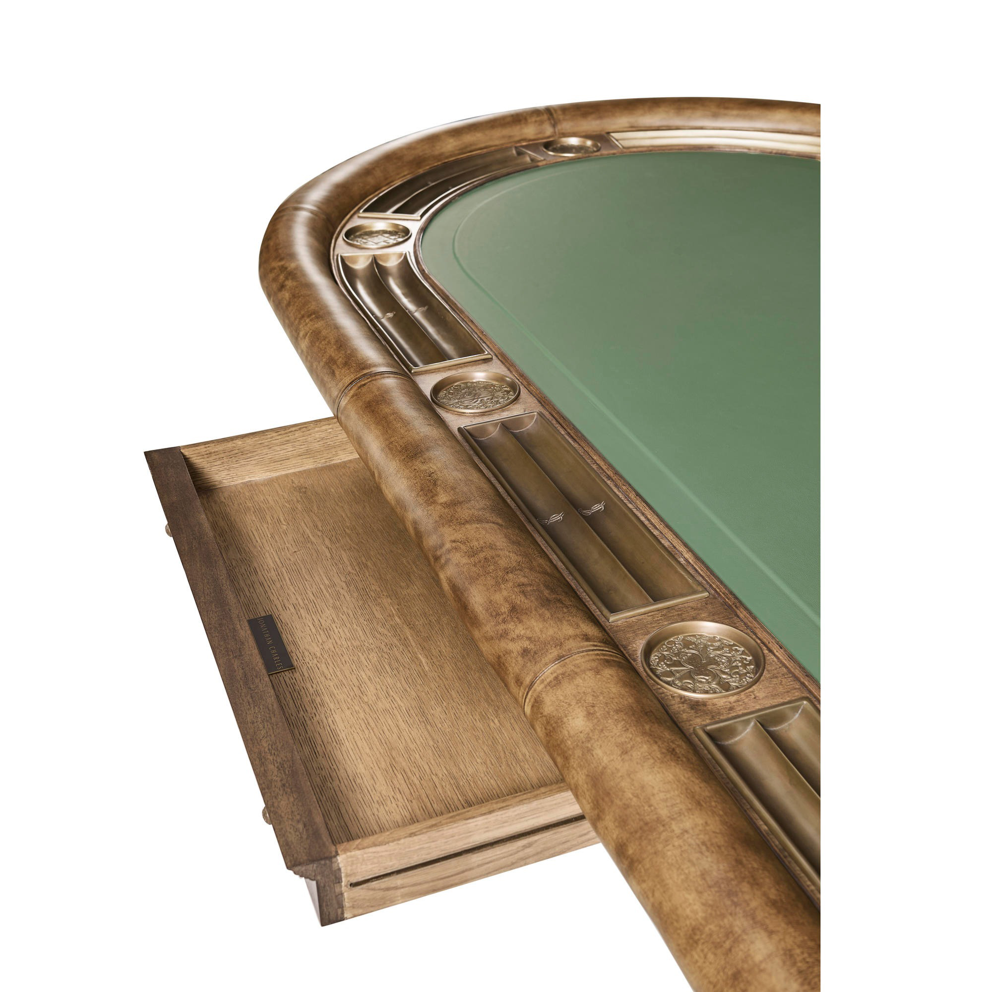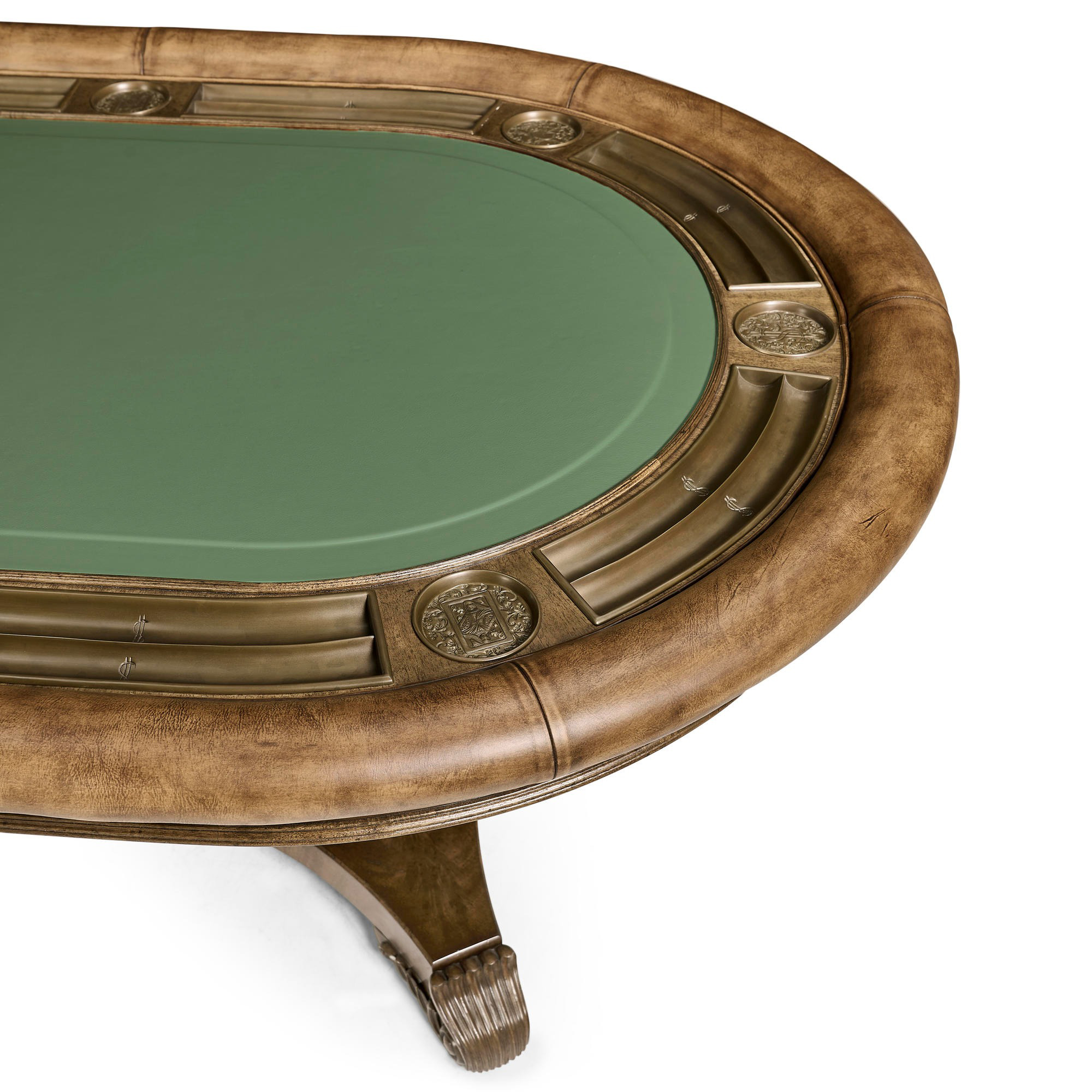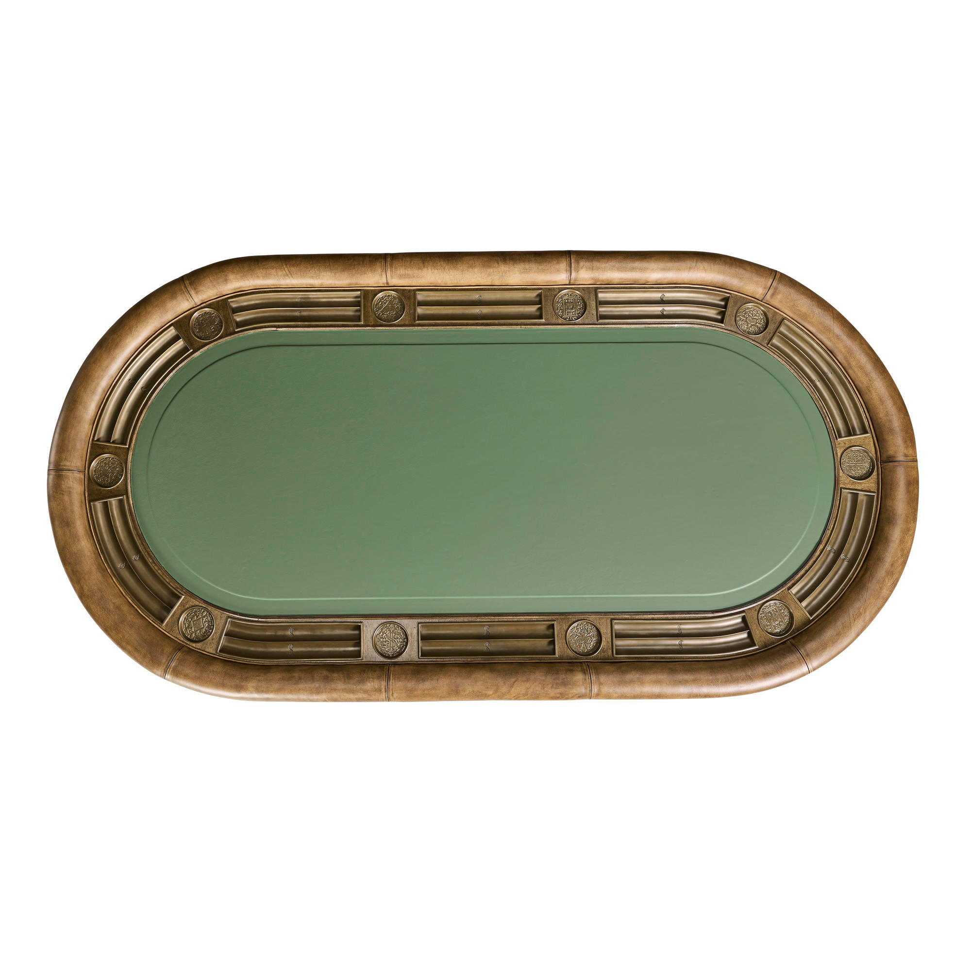 Crotch mahogany, professional style oval poker table with an antique green leather top, leather tooling with four currencies, hand crafted brass cup holders and chip racks, and a drawer for storing poker chips for each player.