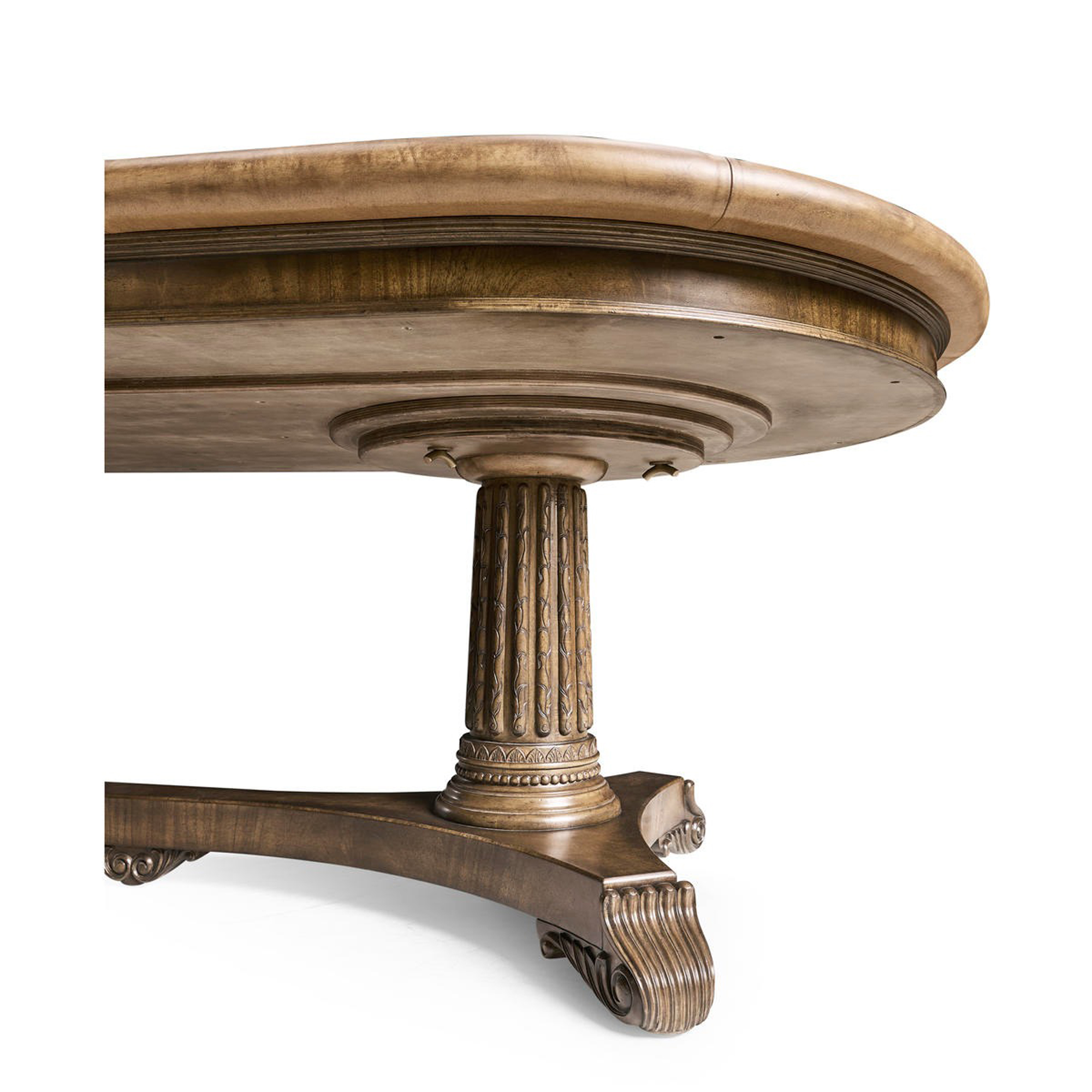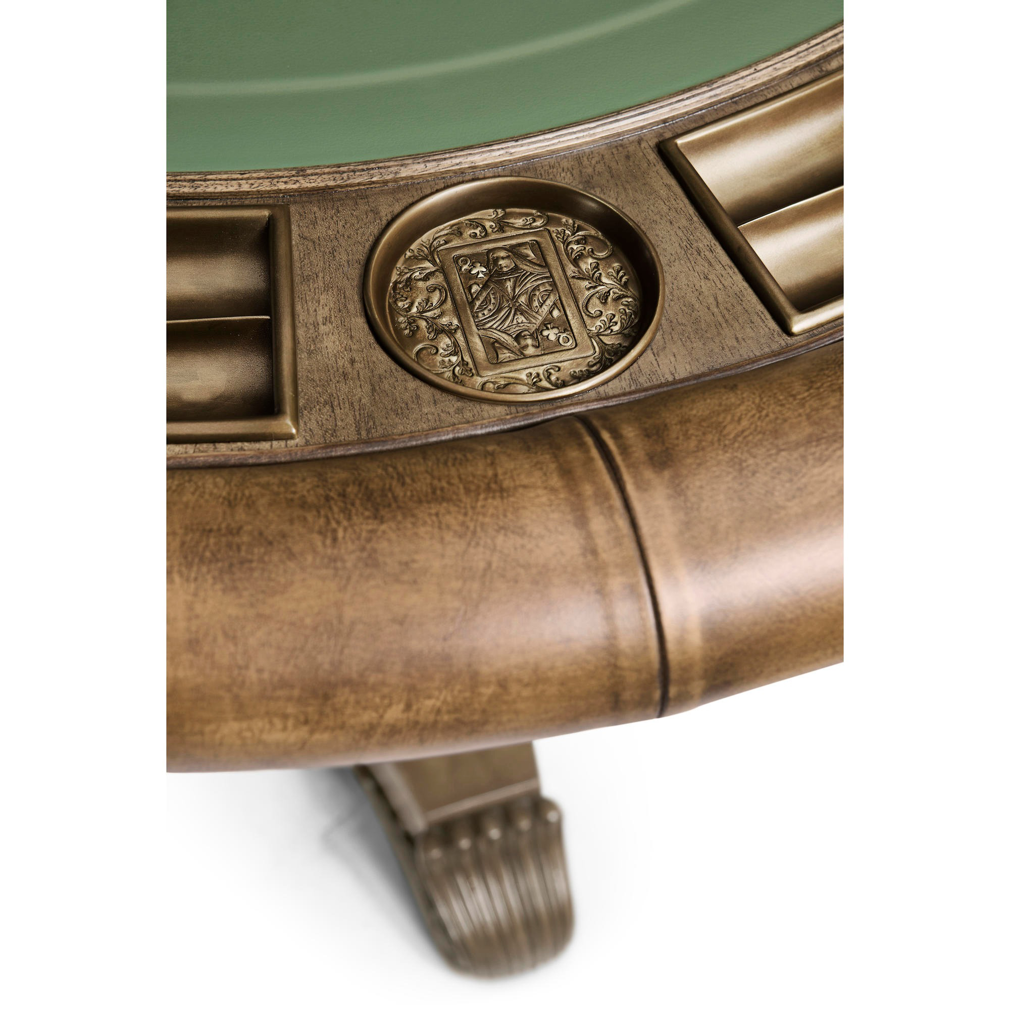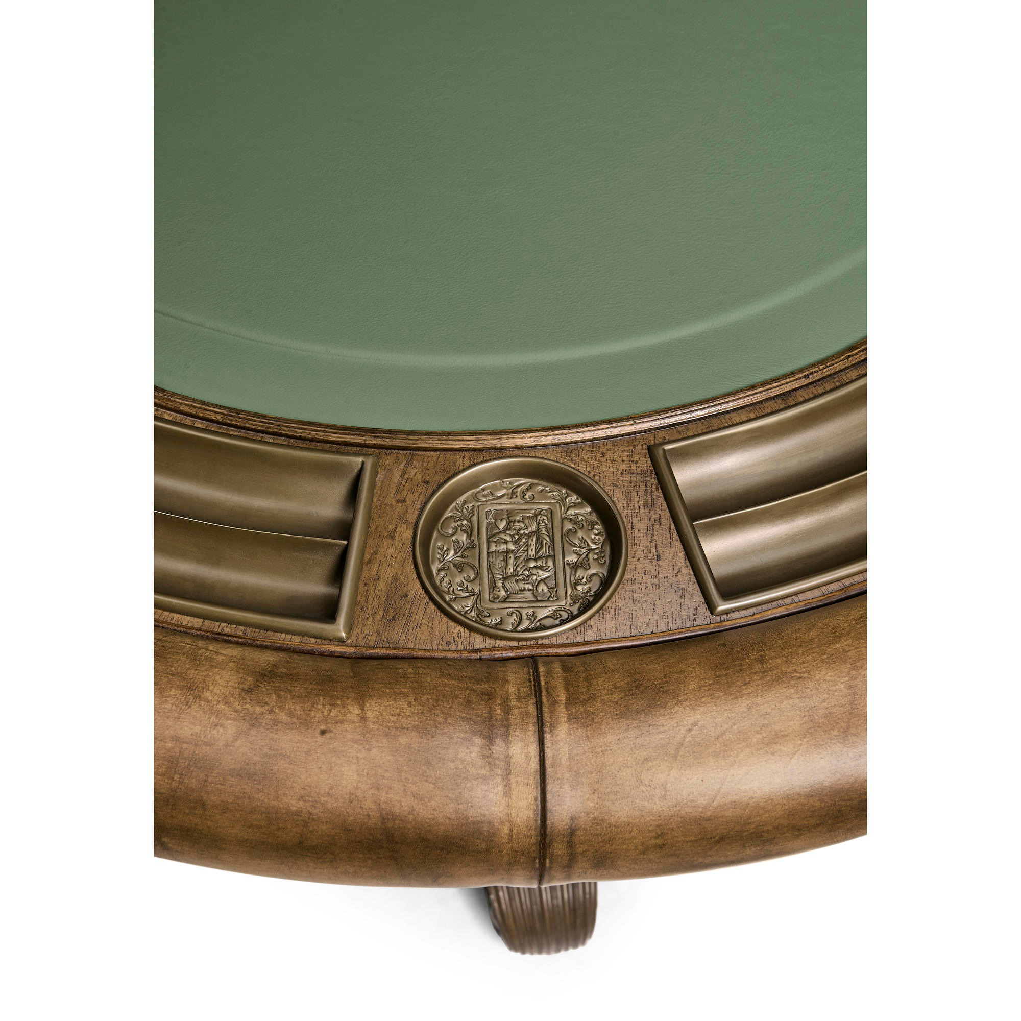 Crotch mahogany, professional style oval poker table with an antique green leather top, leather tooling with four currencies, hand crafted brass cup holders and chip racks, and a drawer for storing poker chips for each player.