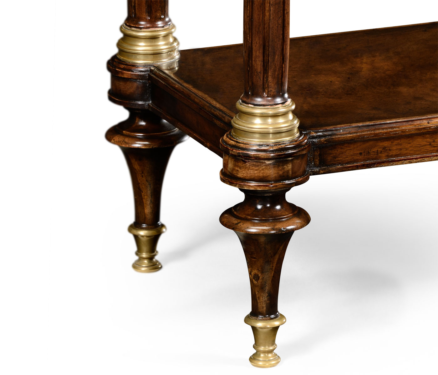 French-inspired 19th-century console in mahogany with a pierced brass gallery rail, two drawers with angular brass pulls, fluted legs, and a lower undertier; Traditional European styling with a high-sheen antique mahogany brown finish on acacia.
