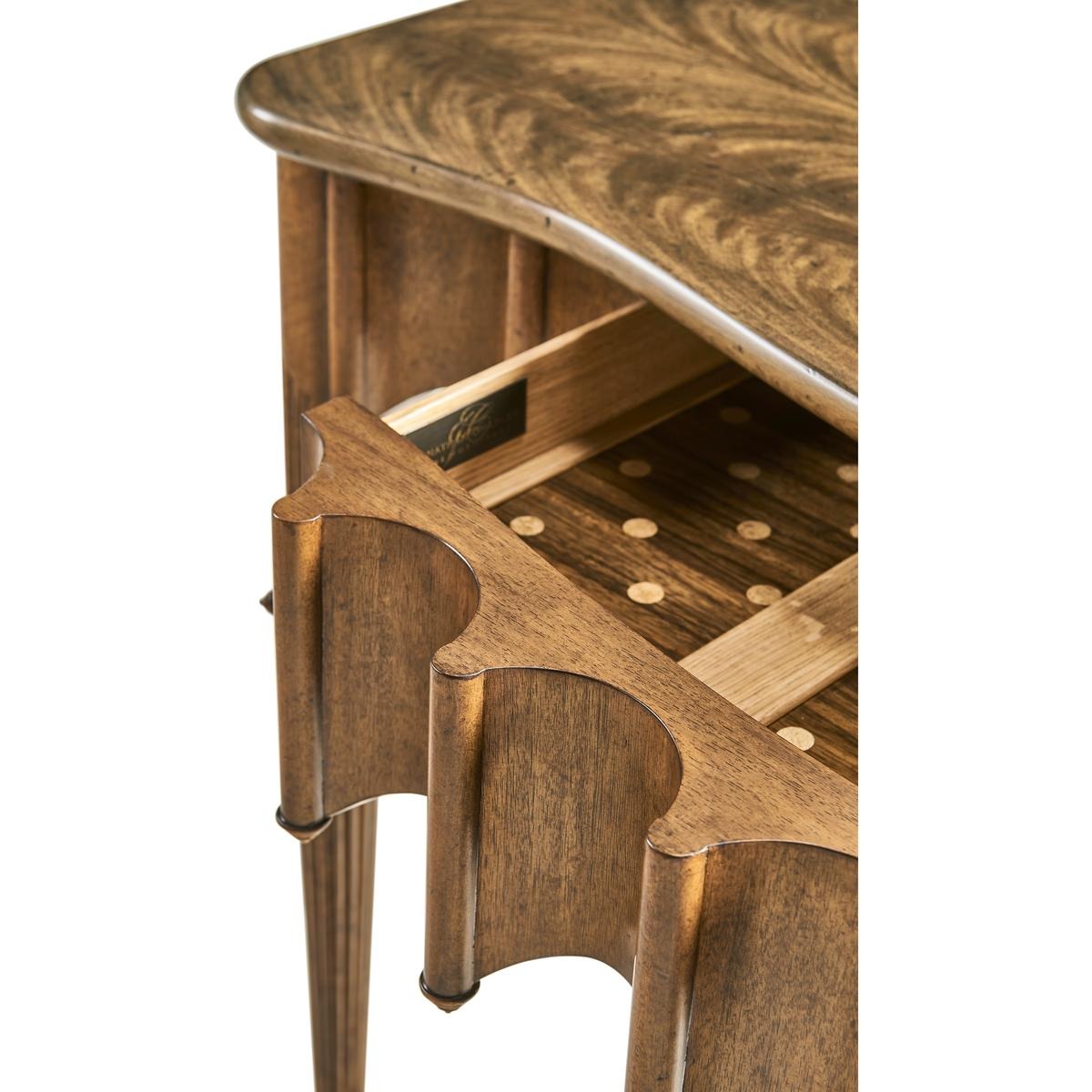 Artaross console offered in grey crotch mahogany and greyed oak variants; drawers lined in the designer’s signature grey polka dot marquetry; conceived to coordinate alongside the Longwood dining table; Traditional profile.