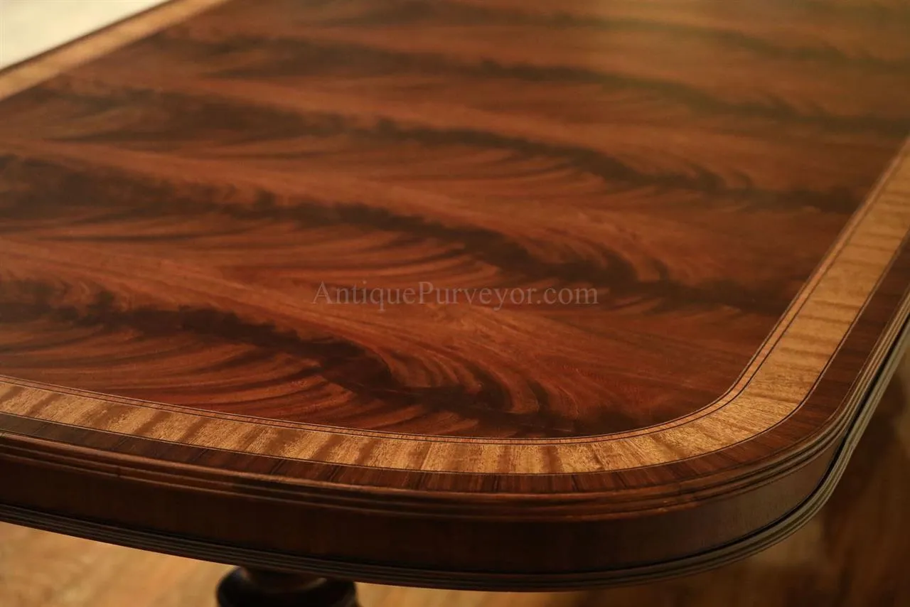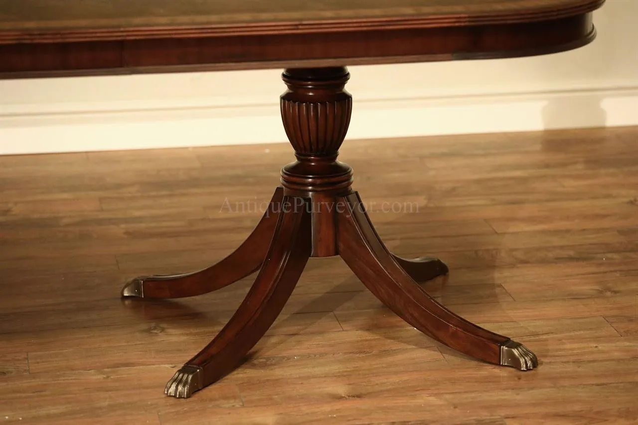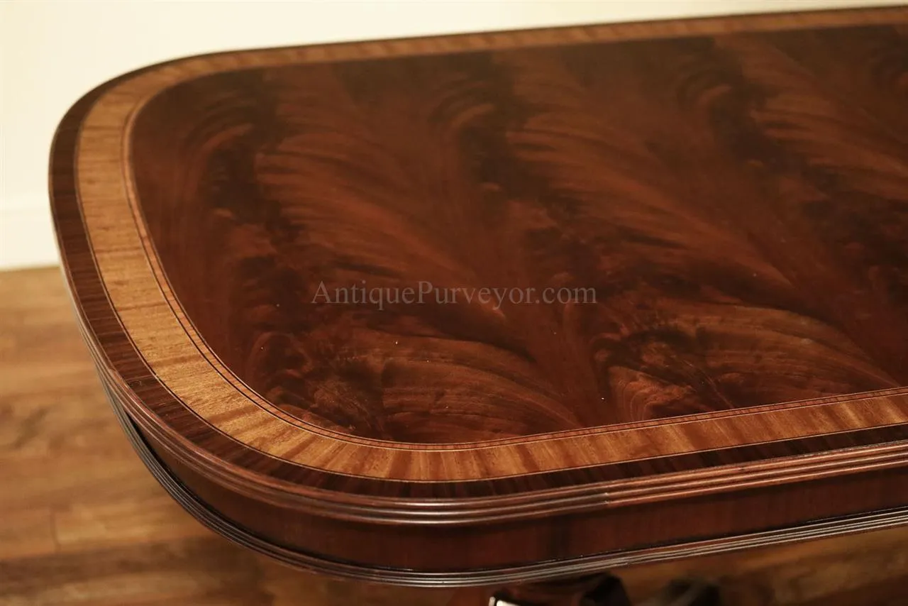 Extra large high-end mahogany dining table with 3 leaves, seats 12 to 14 people. It features fine flame mahogany Veneers, an apron or skirt, and Duncan Phyfe style reeded pedestals. This is a fine, high-end mahogany dining table. The table has rosewood, straight-grain mahogany, primavera, and tulipwood inlays surrounding a slip-matched flame mahogany field.