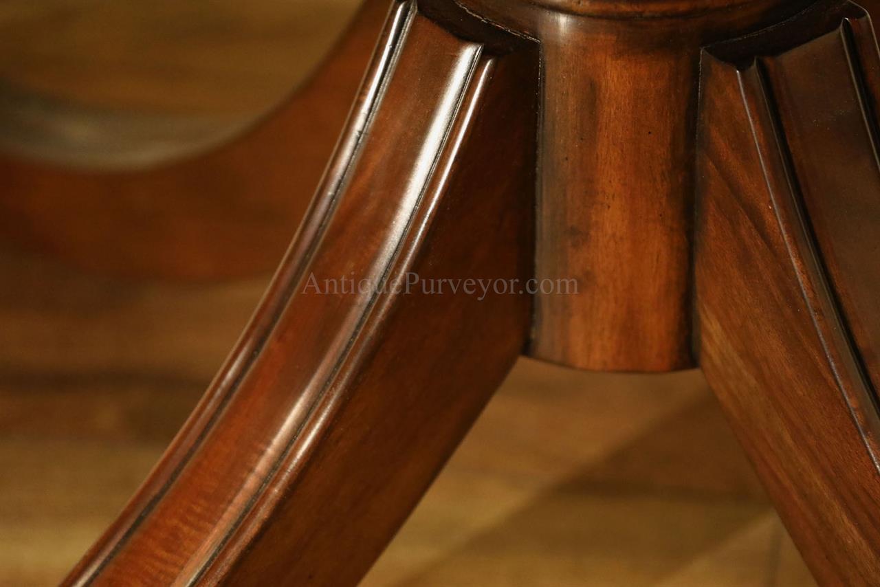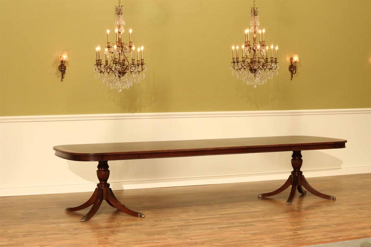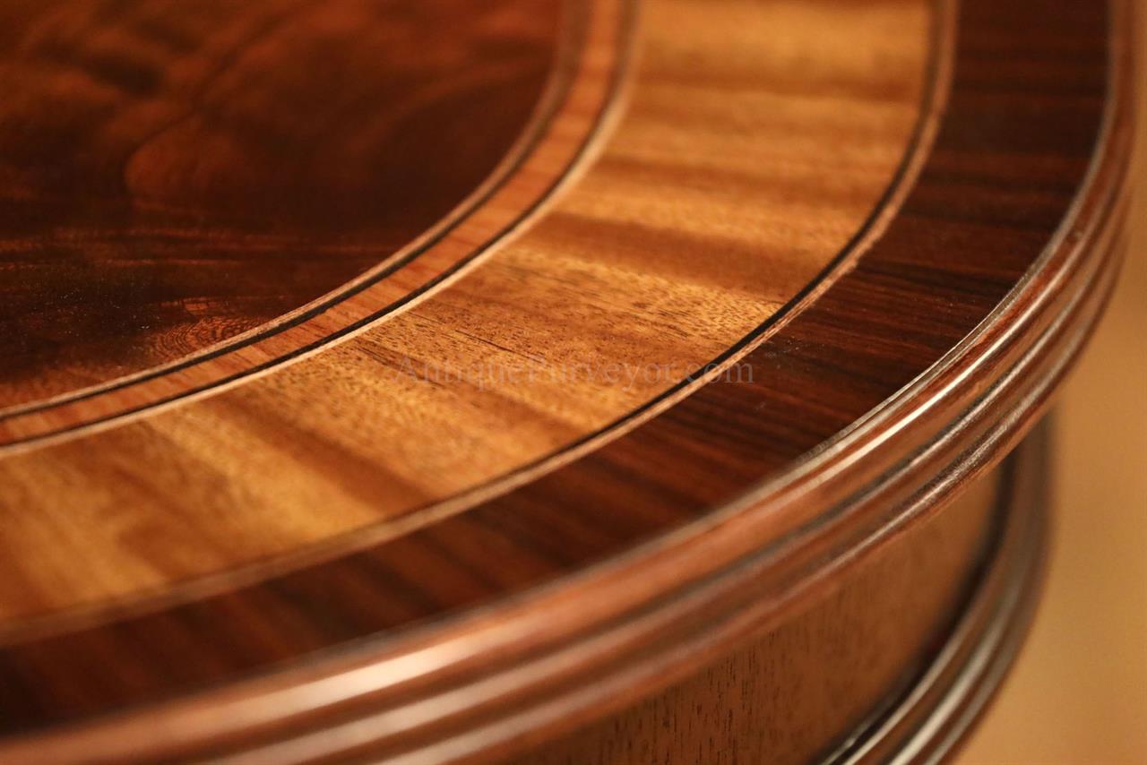 Extra large high-end mahogany dining table with 3 leaves, seats 12 to 14 people. It features fine flame mahogany Veneers, an apron or skirt, and Duncan Phyfe style reeded pedestals. This is a fine, high-end mahogany dining table. The table has rosewood, straight-grain mahogany, primavera, and tulipwood inlays surrounding a slip-matched flame mahogany field.